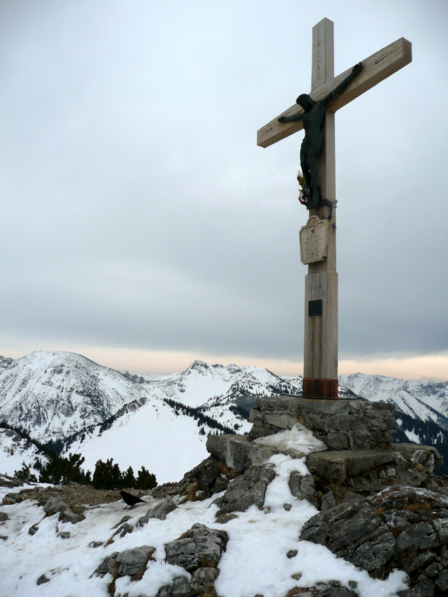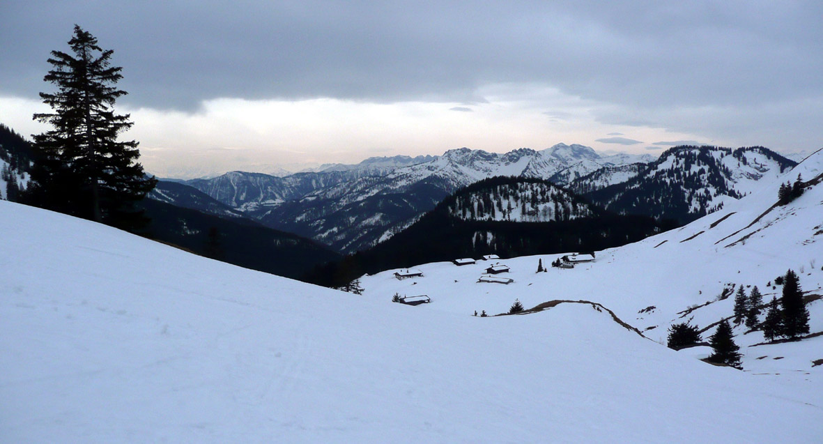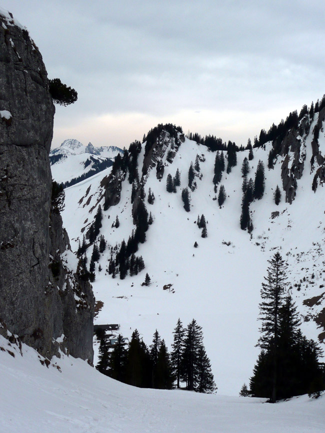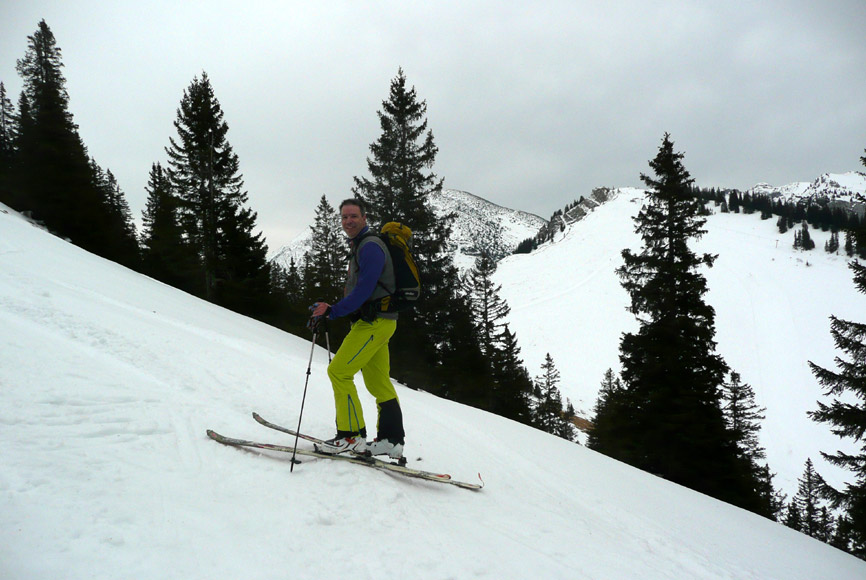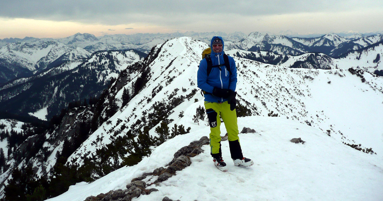 Tourenverhältnisse: Durchgehend Schnee vom Parkplatz weg. Wildes Frollein ist schon weitgehend ausgeapert. Richtig aufgefirnt hat es heute nicht, aber der kompakte und weitgehend durchgefrorene Schnee war ordentlich zu fahren. Keine Harscheisen nötig. Am Gipfel sehr windig.
