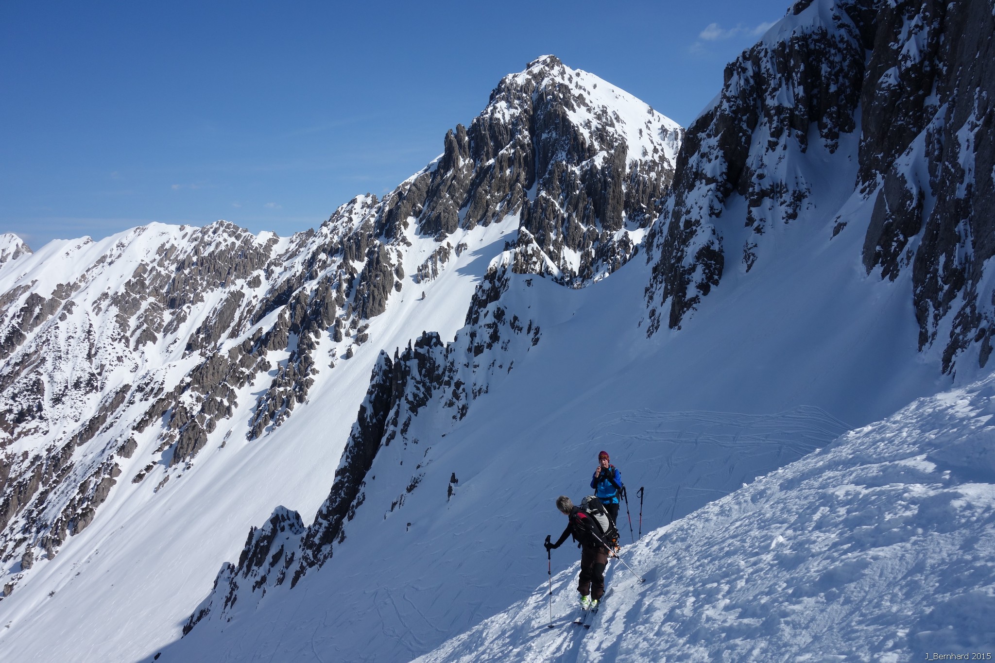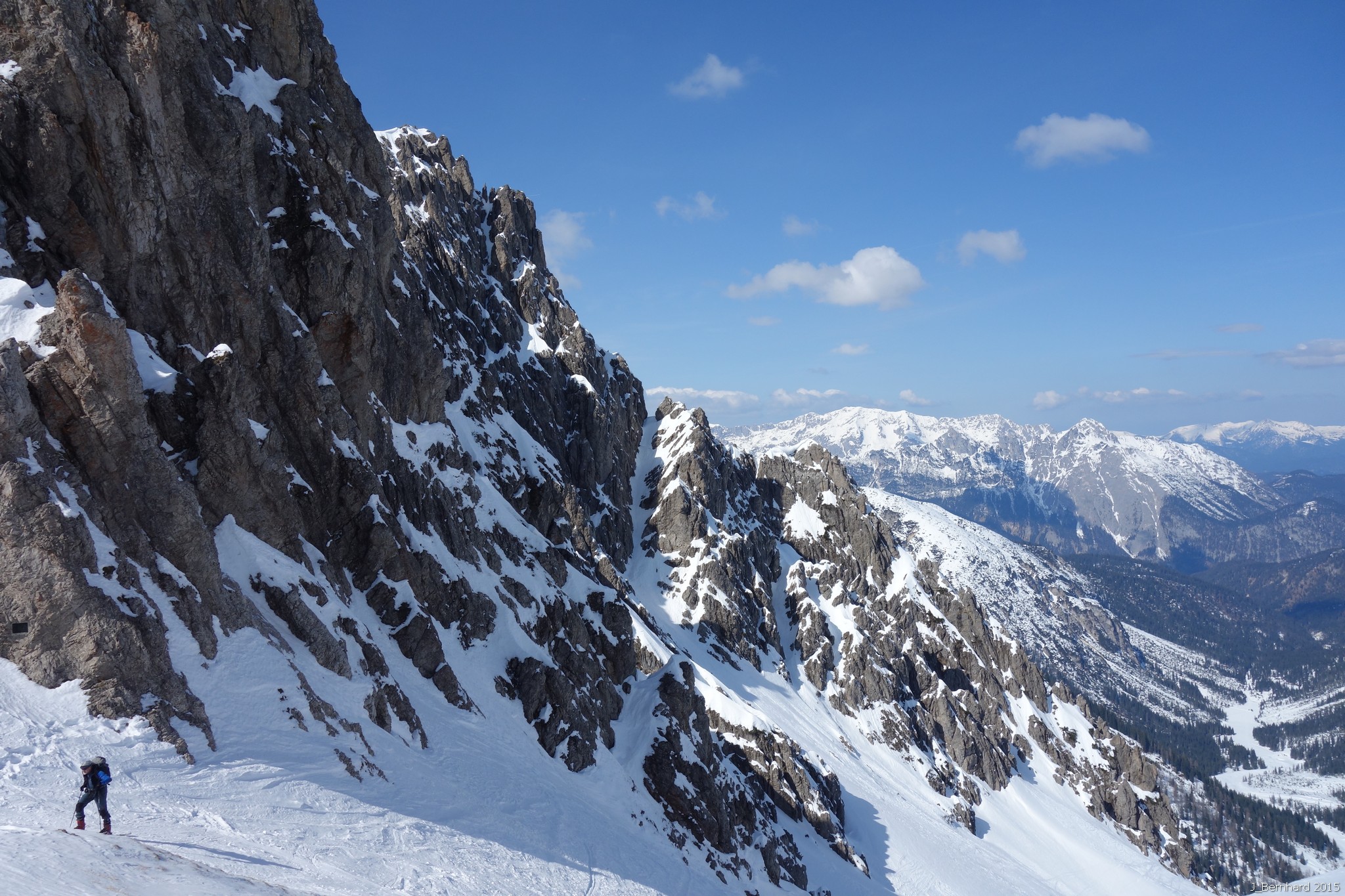 Die Bedingungen sind immer noch prima, unverspurten Pulver gibt's natürlich nicht mehr. Die steilen Nordhänge haben sehr viele Abfahrtsspuren, die der Wind mit Triebschnee etwas eingeebnet hat. Alles sehr gut fahrbar. An der Alm bremst der Firn ab Mittag, aber man kommt auf der Spur der Schneekatze gut bergab.