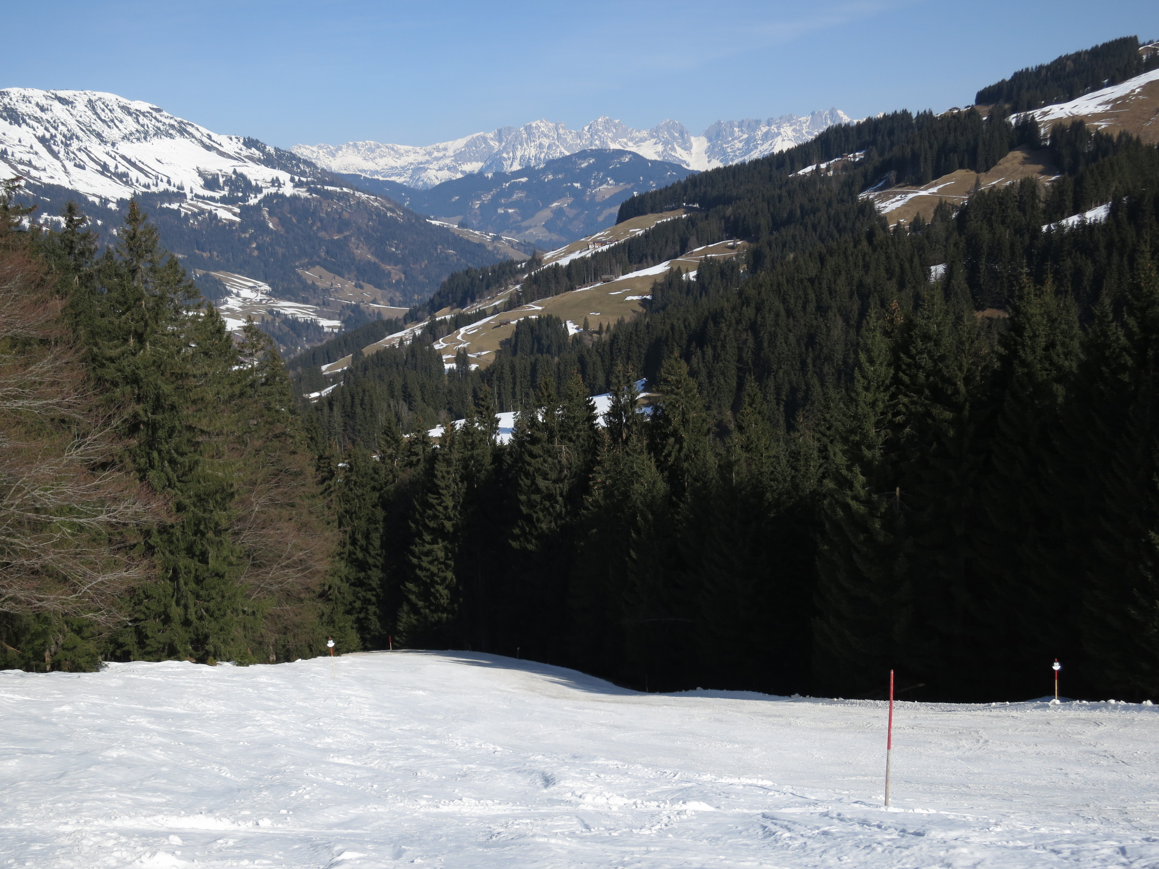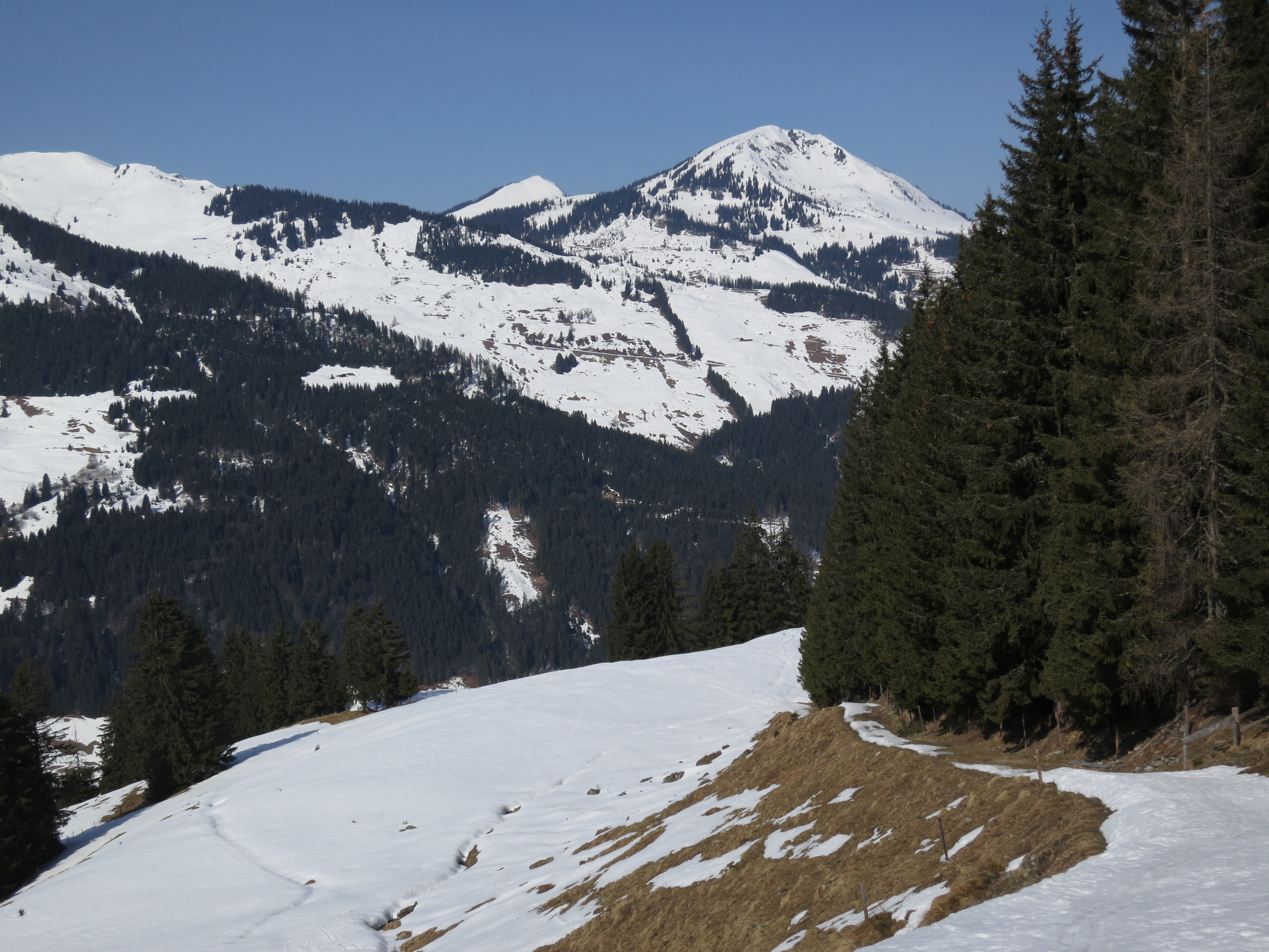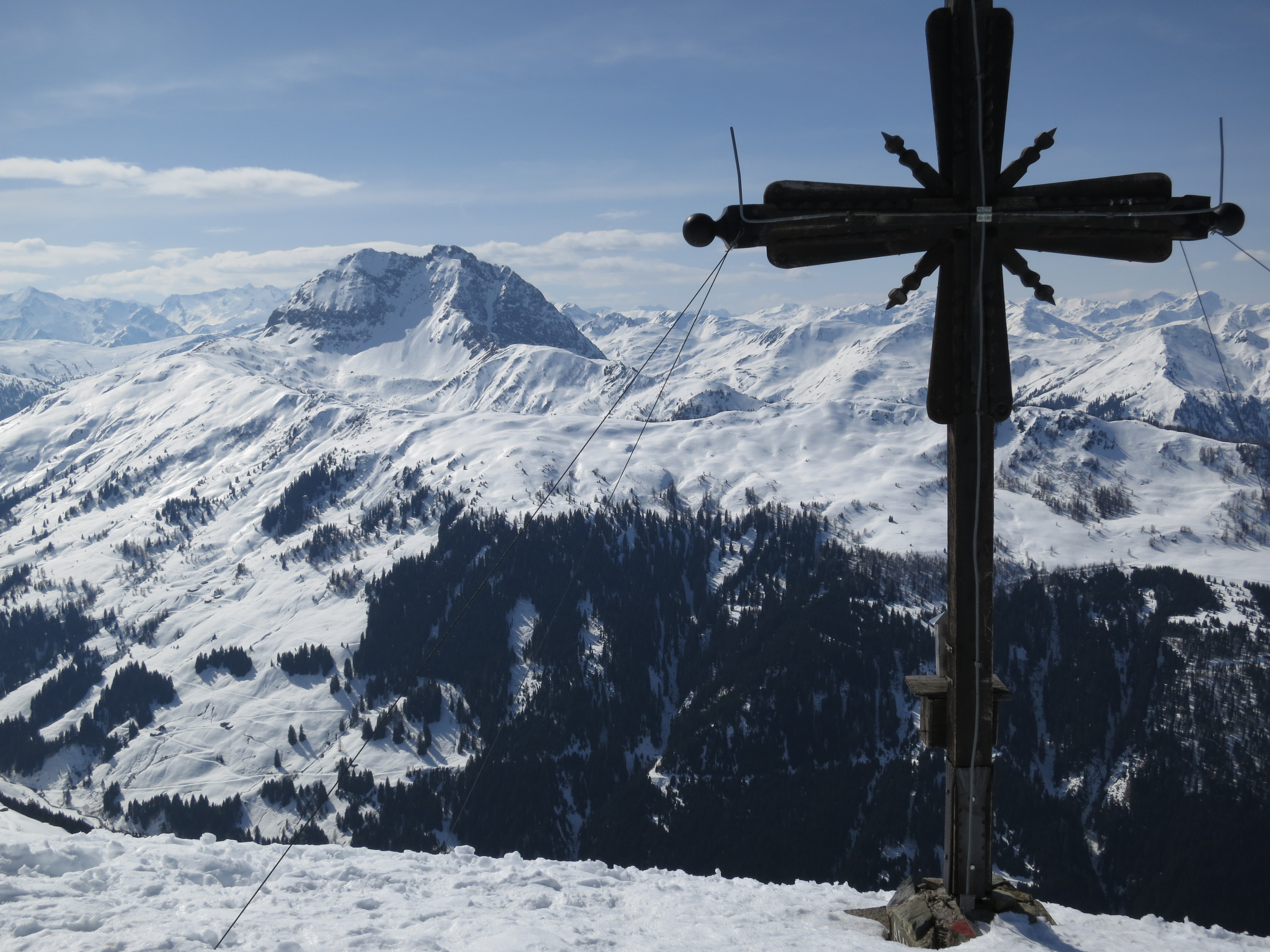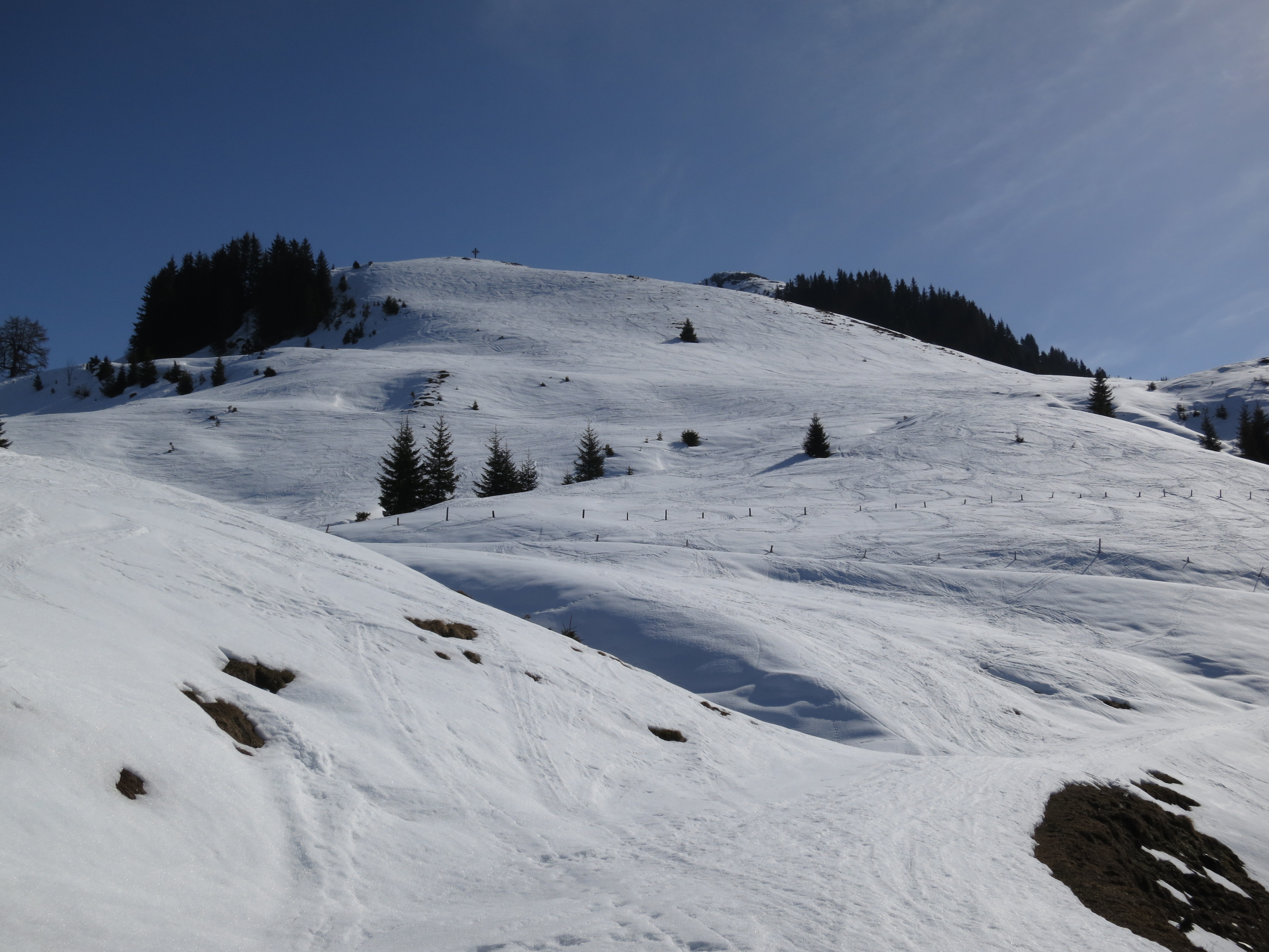 Tourenverhältnisse: Abfahrt vom Gipfel bis zur Unteren Kleinmoosalm windgepresster Schnee, danach oft sulzig. Wo die aperen südseitigen Hänge beginnen (Bild 4), biegt man nach Norden ab und erreicht die Piste. Auf dieser in meist firnigem Schnee bis zum Ausgangspunkt.