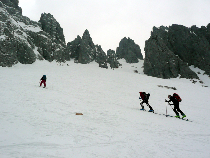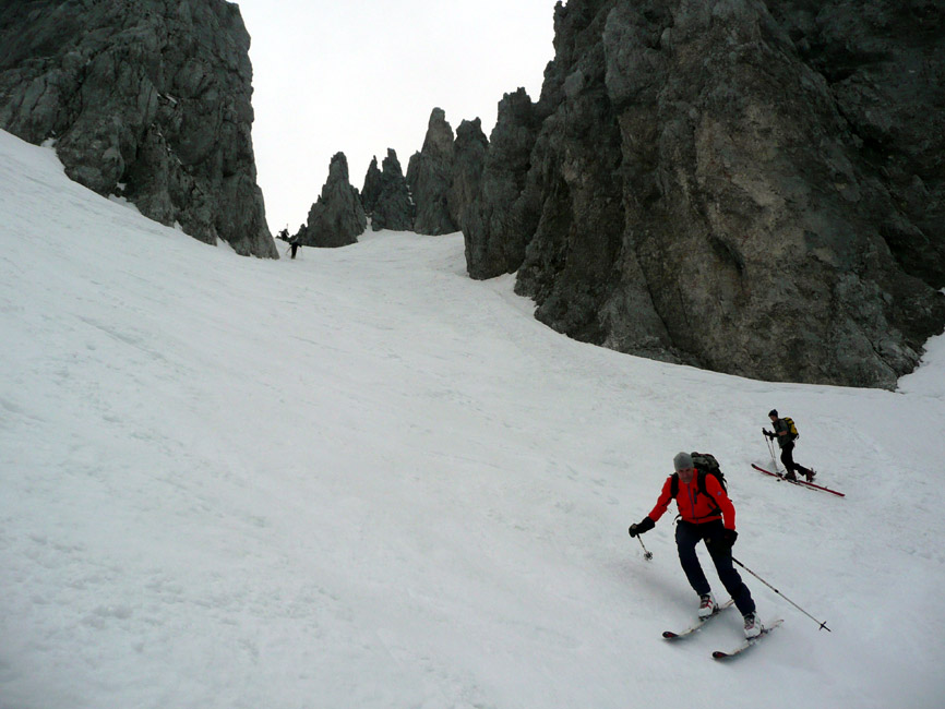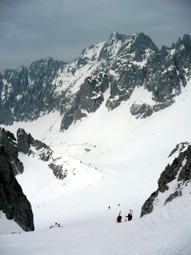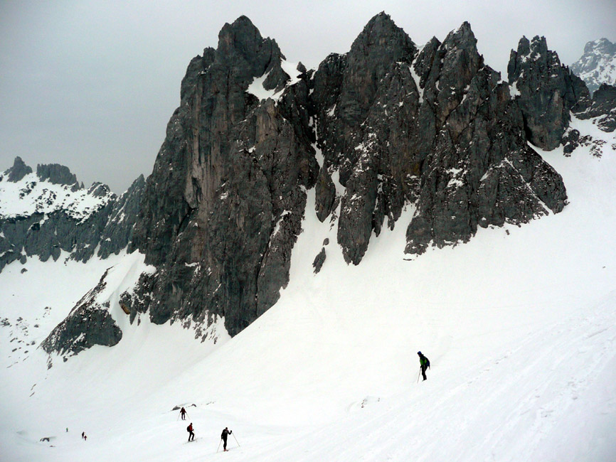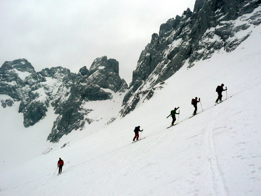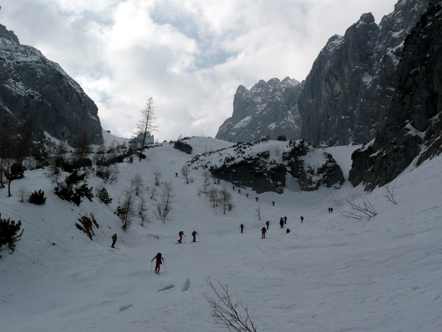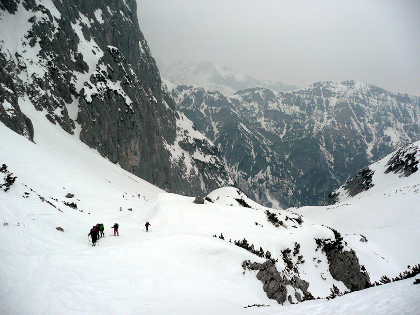 Gefahreneinschätzung: lawinenmäßig gering; auf den letzten 100 Hm zum Goinger Törl eher Abrutsch-/sturzfefahr (Harscheisen sehr ratsam).