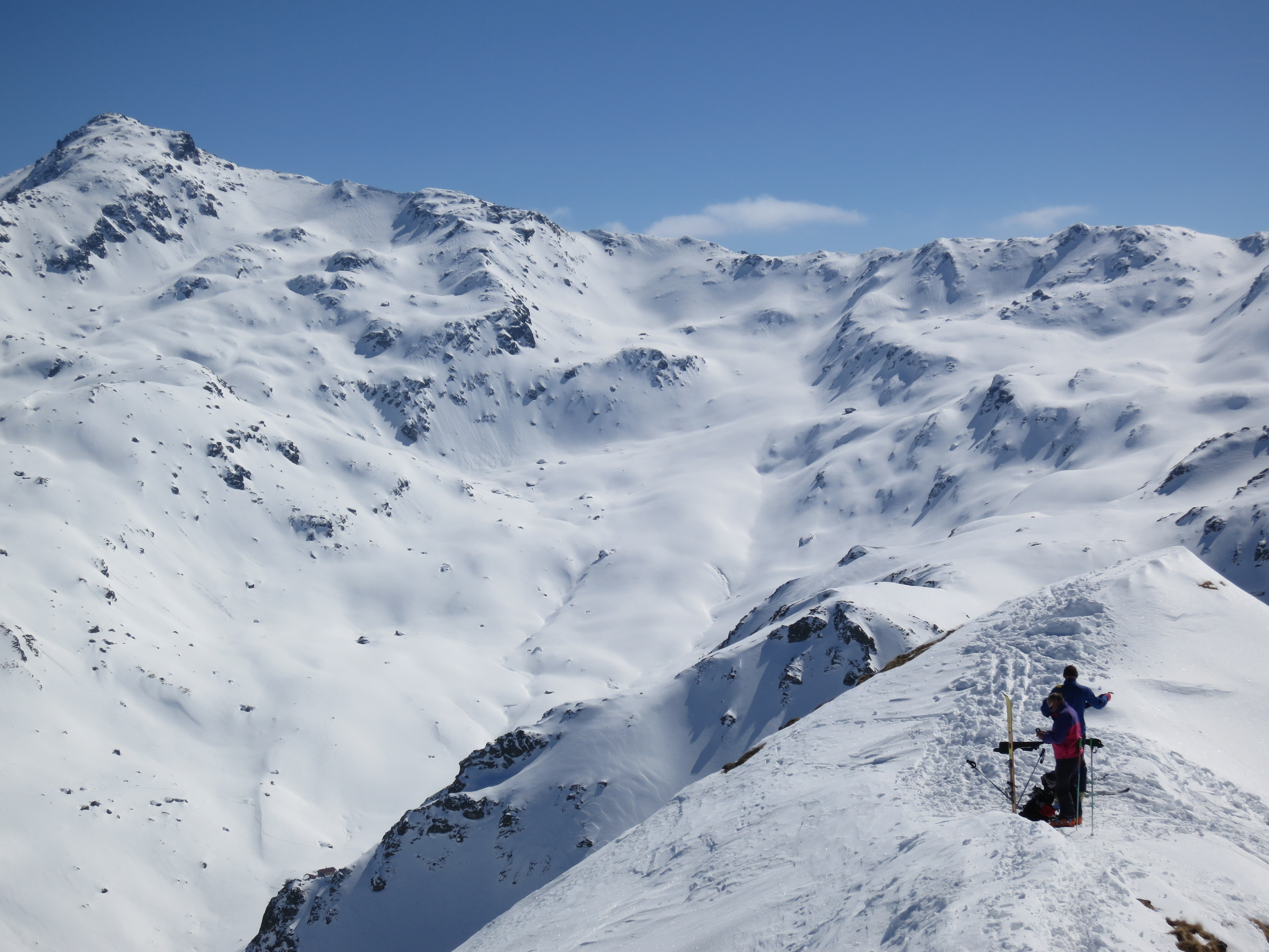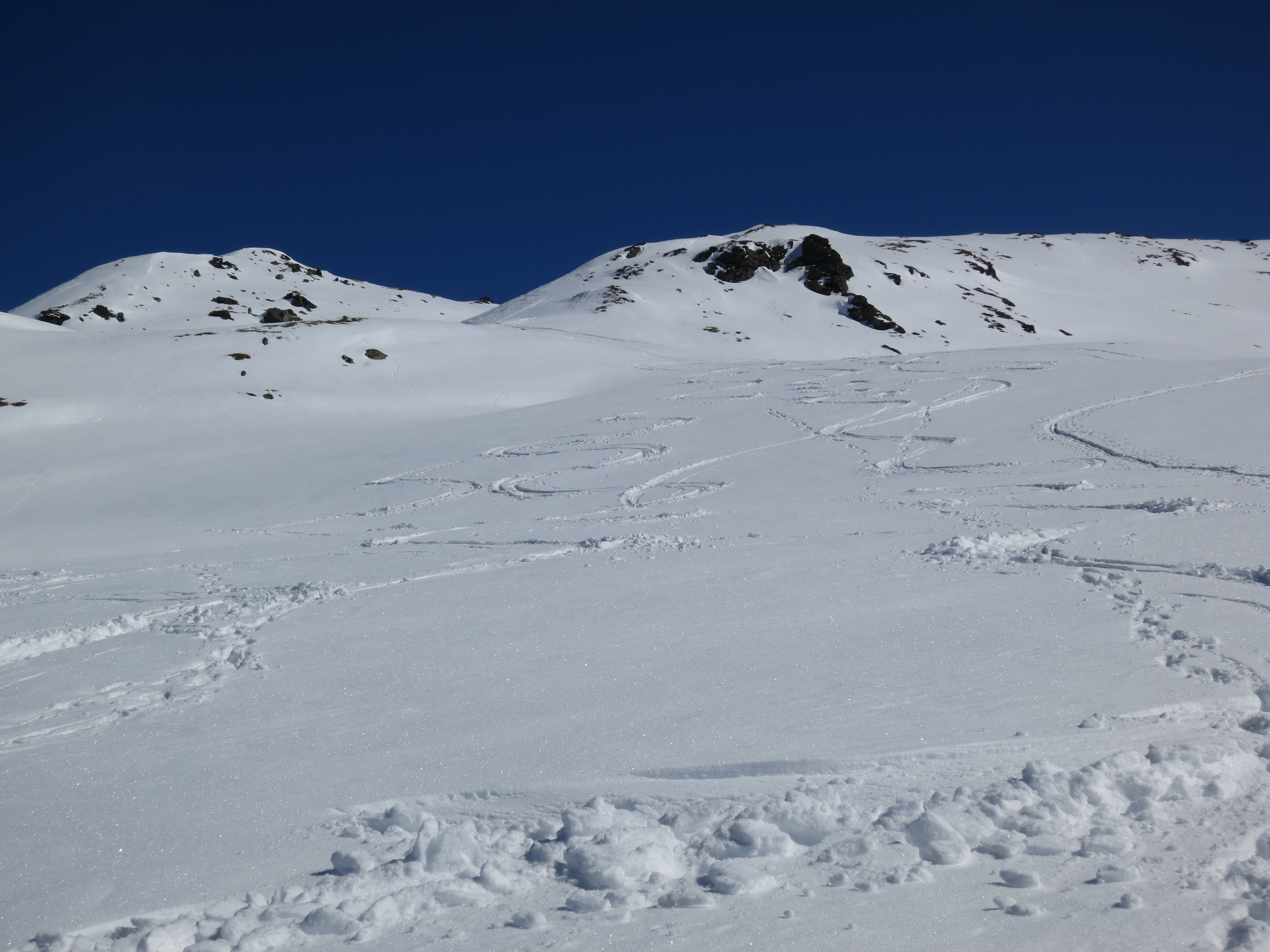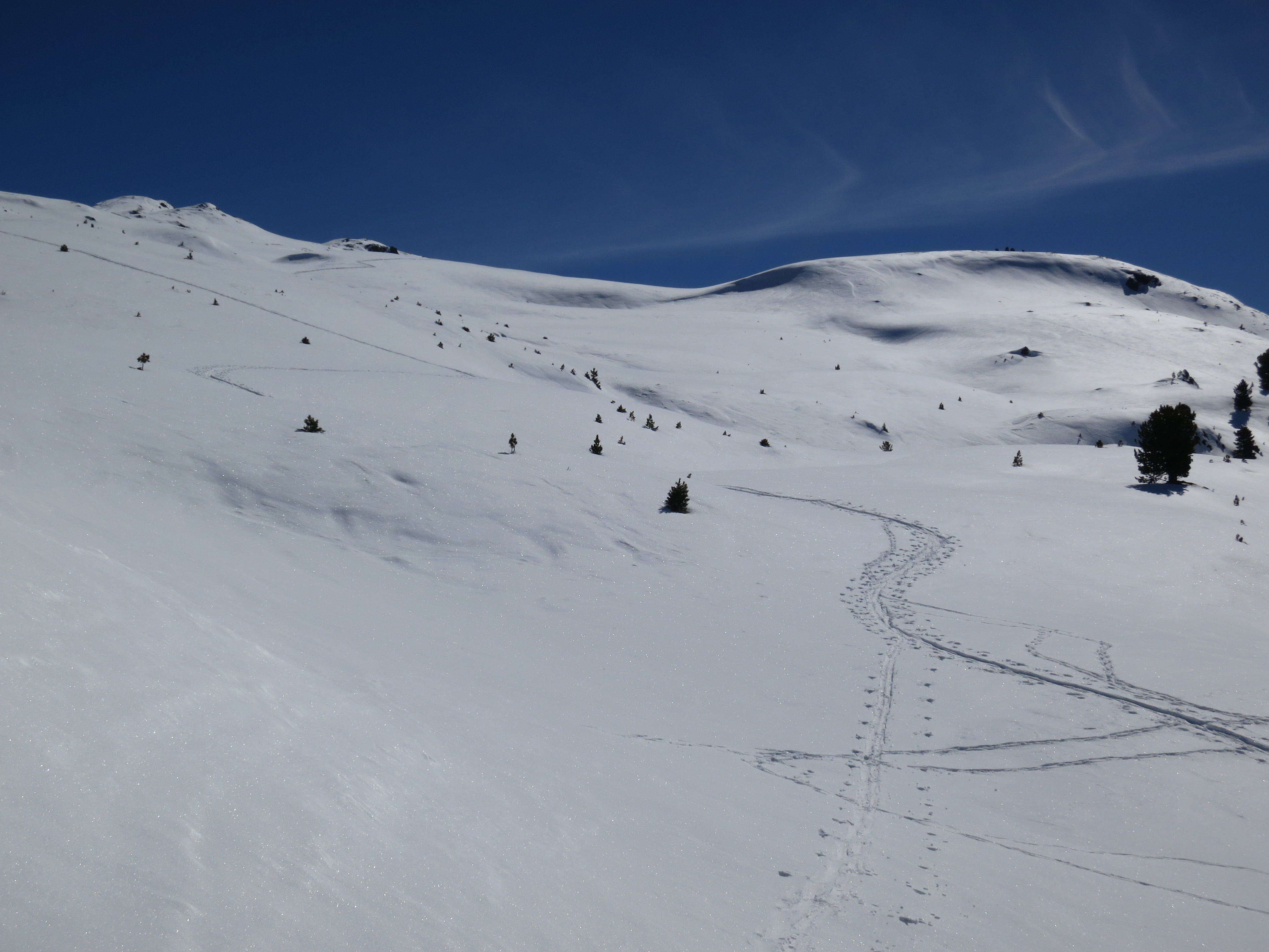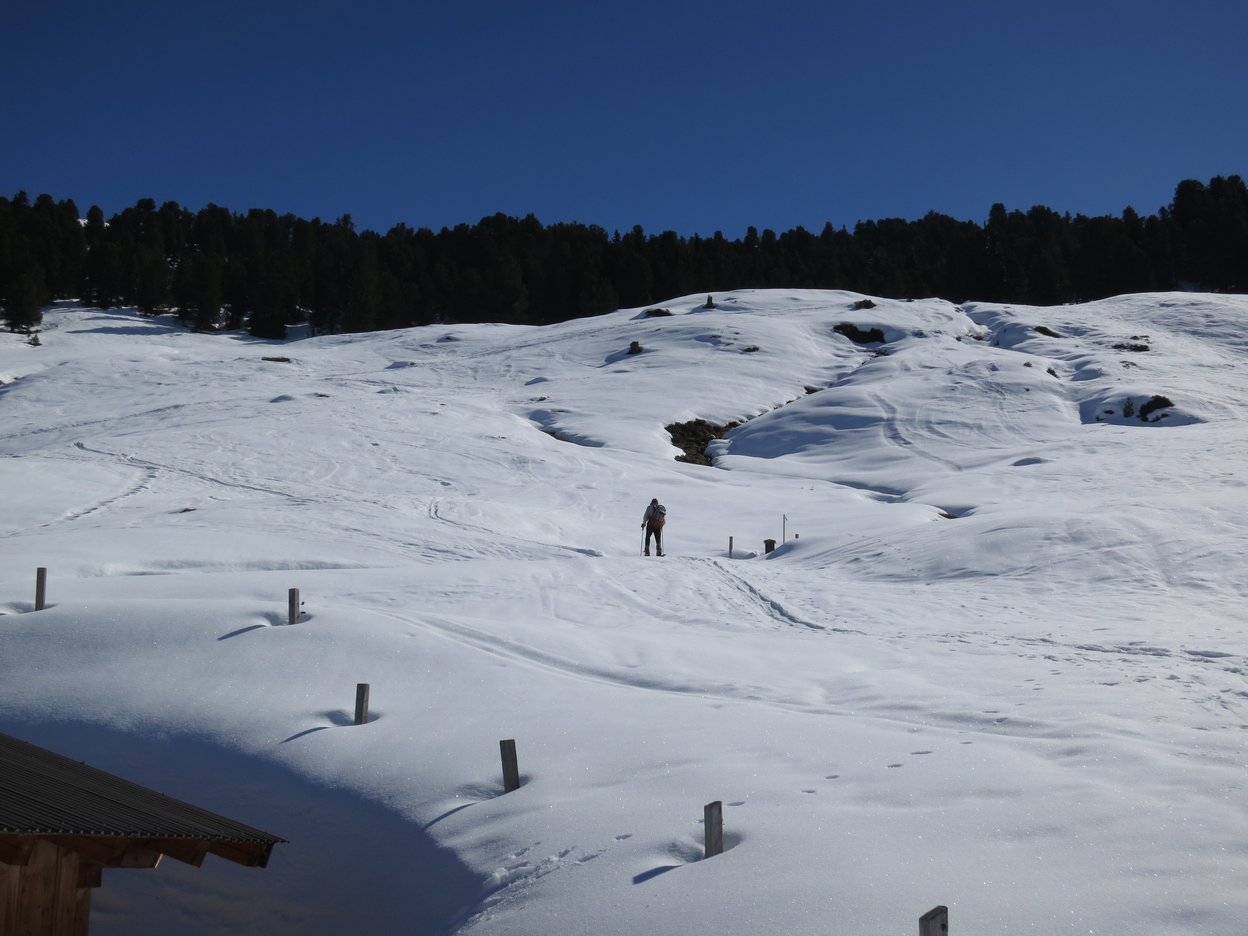 Tourenverhältnisse: heute waren die Tourenverhältnisse perfekt. Problemloser Aufstieg auf guter Spur. Dank nächtlicher Abstrahlung gute Verhältnisse bei der Abfahrt. Im oberen Teil eine gesetzte, dünne Neuschneeauflage auf festem Untergrund. Ebenfalls im Waldabschnitt. Die freien Hänge oberhalb und unterhalb der Fiderißalm (beim Alpl kommt man nicht mehr vorbei) waren firnig bis zur Forststraße, die von der Weidener Hütte her kommt. Auf dieser genügend Schnee zur weiteren Abfahrt bis kurz vor der Brücke über den Nurpensbach. Ca.10 min. muss man dann die Ski bis zum Parkplatz tragen (Bild 10).