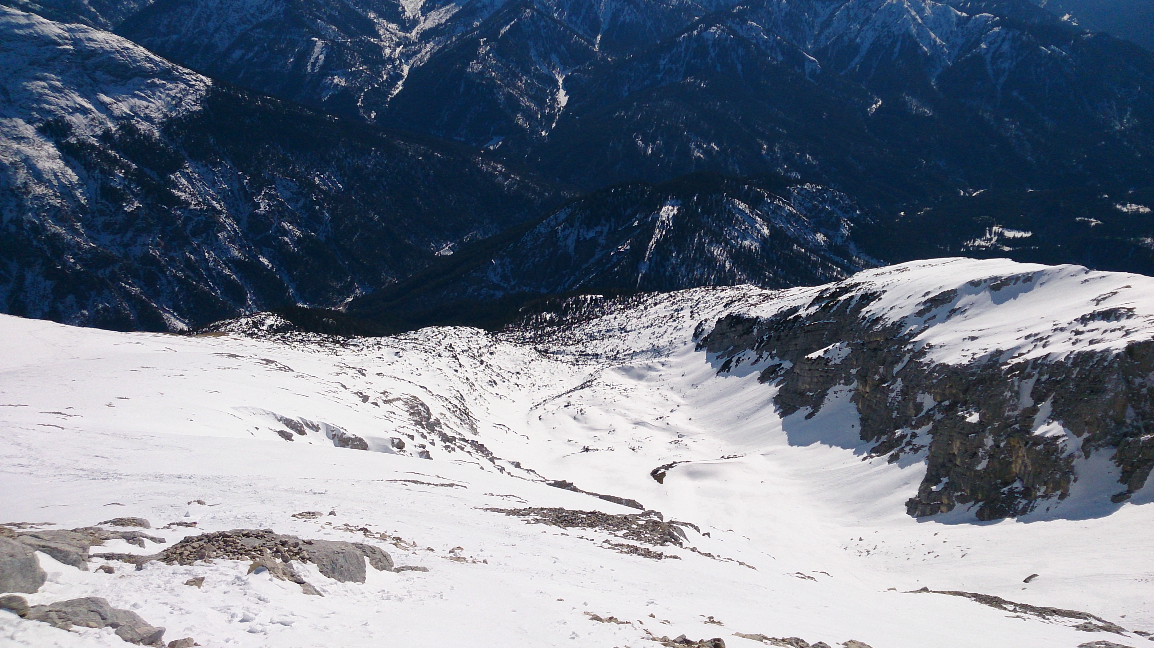 Tourenverhältnisse: oben a bisserl Pulver auf Harsch, unten Firn / Feuchtschnee