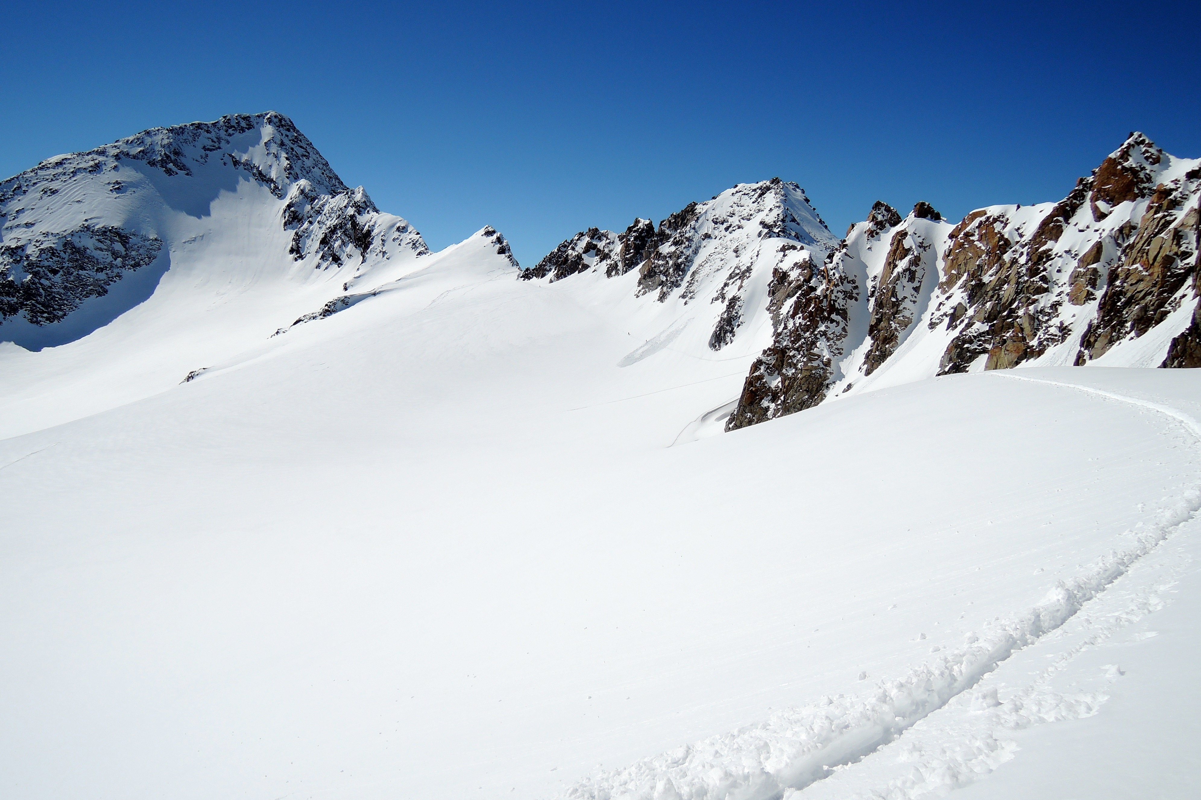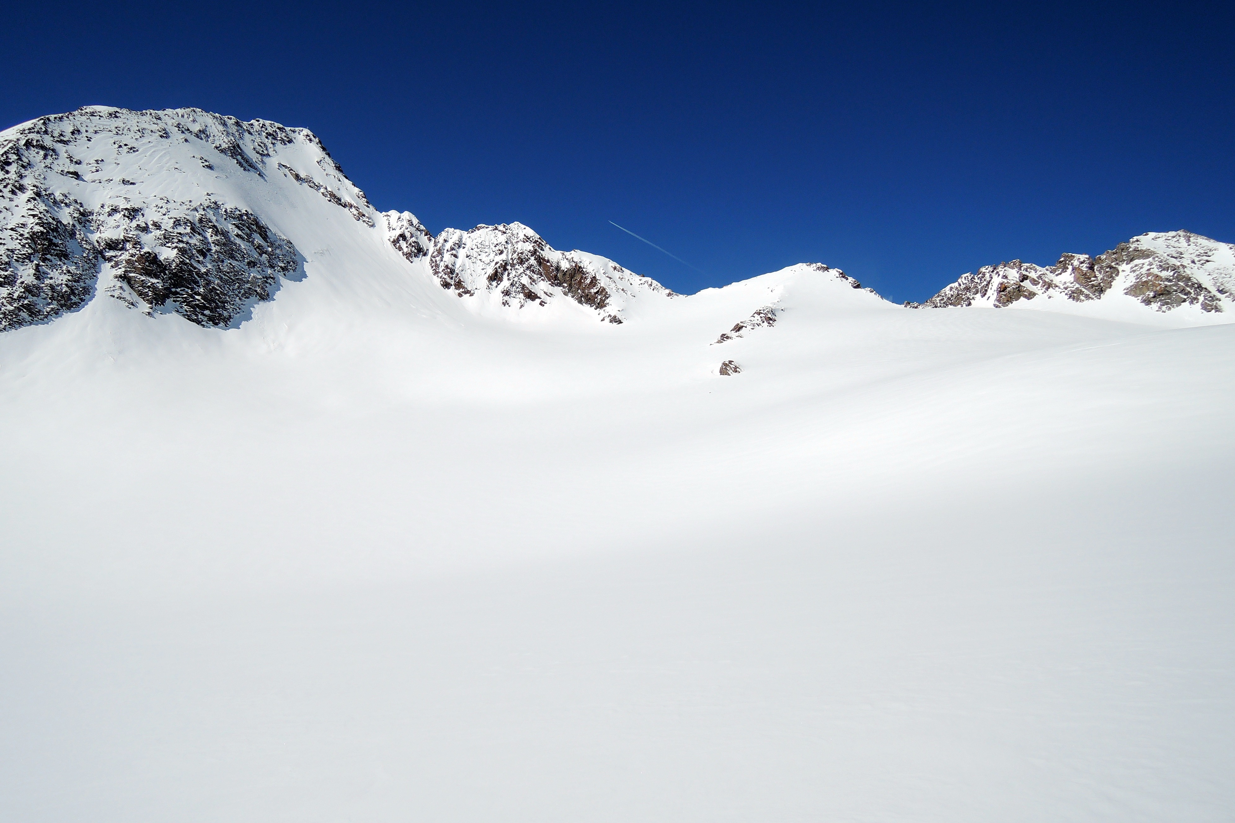 Sonstiges: Von der Amberger Hütte (2135m) Richtung S über die Sulze taleinwärts. Am Talschluss am Lausebichl Richtung O im Schwarzenbergtal über mehrere Stufen. Zuletzt steil von rechts nach links auf den Schwarzenbachferner. In dessen Mitte wendet man sich in einem weiten Linksbogen Richtung N in das Gletscherbecken zwischen Schrankogel (3496m) und Wildgratspitze (3000m). Weiter über den idealgeneigten Hang Richtung W, zuletzt steiler auf die Firnkuppe (3275m) nördlich des Schrankogels. Von dort Richtung O wieder ins Gletscherbecken hinab auf die Wildgratscharte (3170m) zu. 300m vor ihr Richtung N aufs Schrandele zu soweit man mit Ski aufsteigen kann (3280m).Runter nach S und weiter entlang der Aufstiegsroute.
