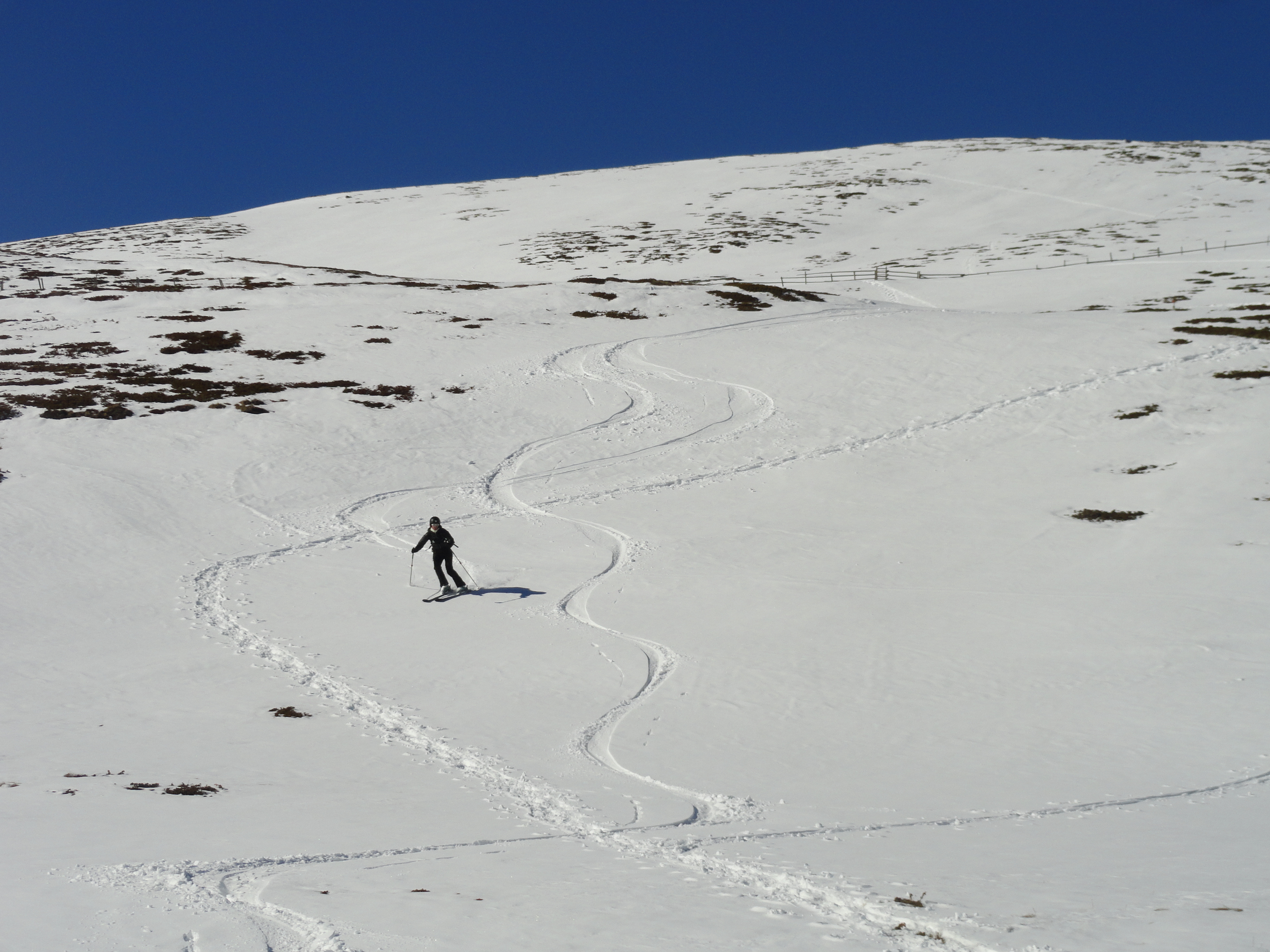 Sonstiges: Vom Parkplatz zur (derzeit geschlossenen) Halslhütte muss man die Ski auf der Würzjochstraße tragen. Die Straße ist wegen Wintersperre für Autofahrer noch gesperrt. Es liegt aber kein Schnee mehr auf der Straße. Ab Halslhütte muss die erste Stunde versucht werden, mit gutem Gespür genügend Schneeflecke zu finden, um mit Ski an den Füßen über die teils aperern Südhänge nach oben zu kommen. Ab einer Höhe von ca. 2100m ist dann ausreichend Schnee auch für die Abfahrt da. Die Tour (Beschreibung hier im Tourenarchiv) ist für dieses Jahr definitiv nichts mehr. Wir haben es trotzdem genossen, weil wir praktisch allein unterwegs waren und das Wetter und die Sicht spitze waren. Es ist eine sehr leichte Tour ohne Spitzkehren, ohne steile Hänge und wohl auch kaum lawinengefährdet. Die Tour lohnt es, dass man sie sich für die nächste Saison noch mal vormerkt...
