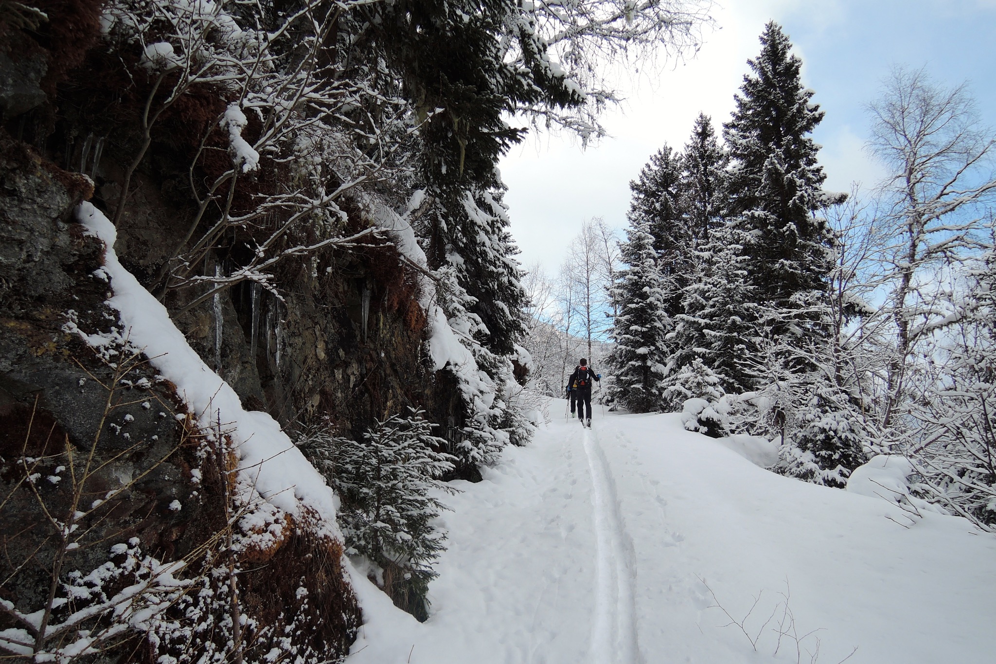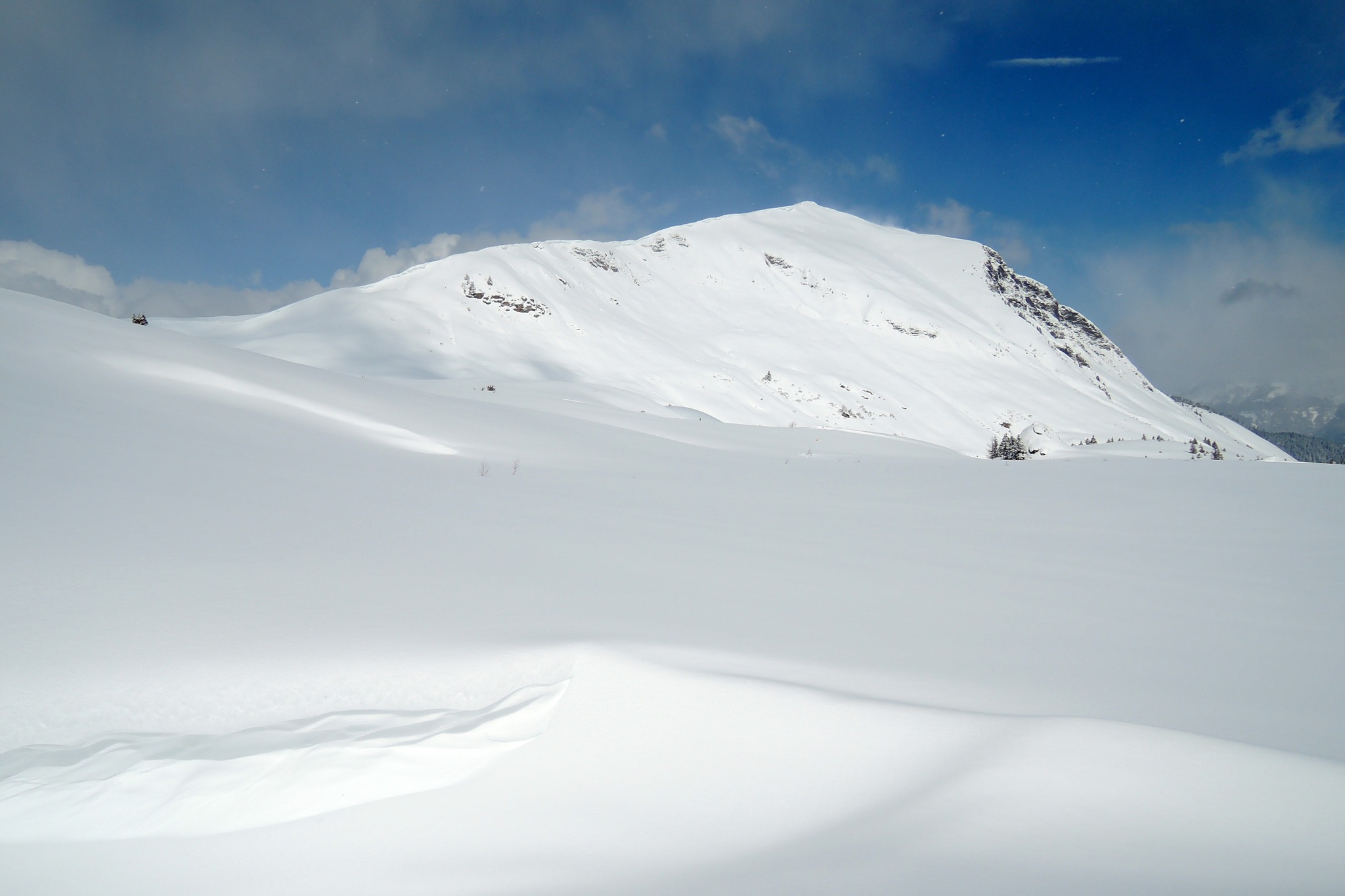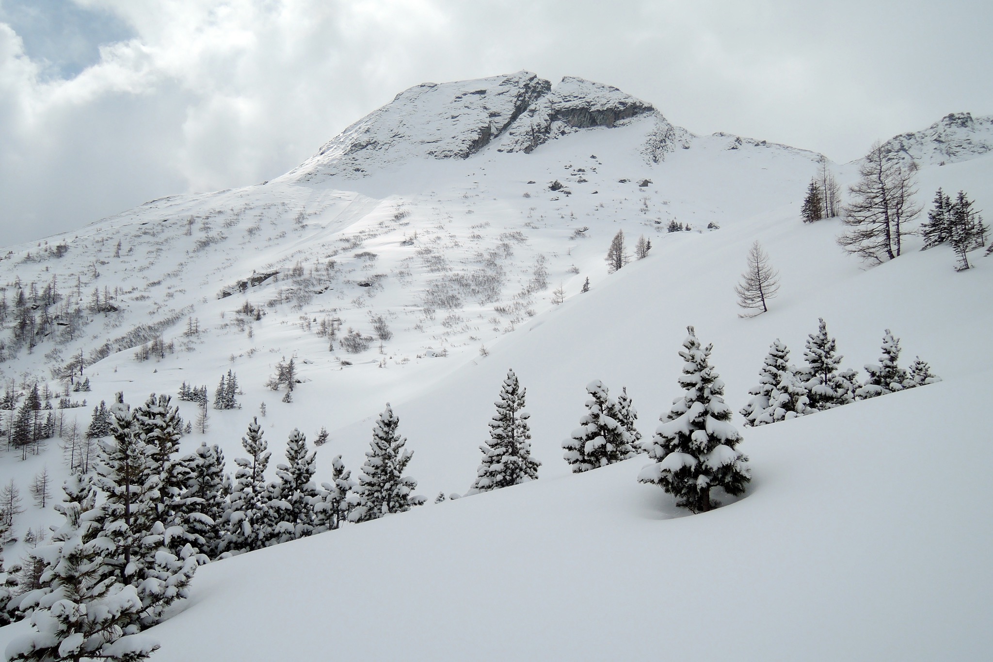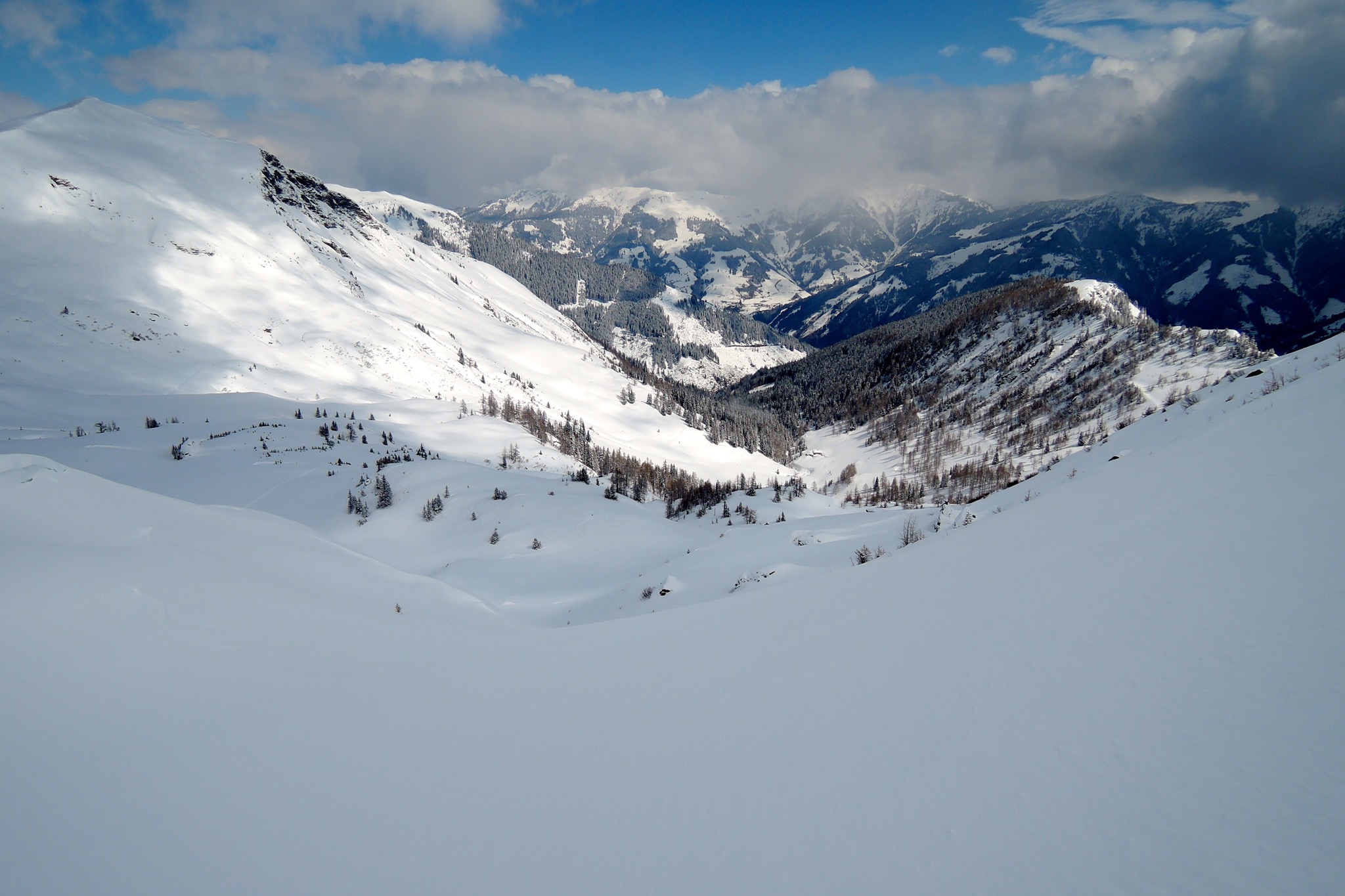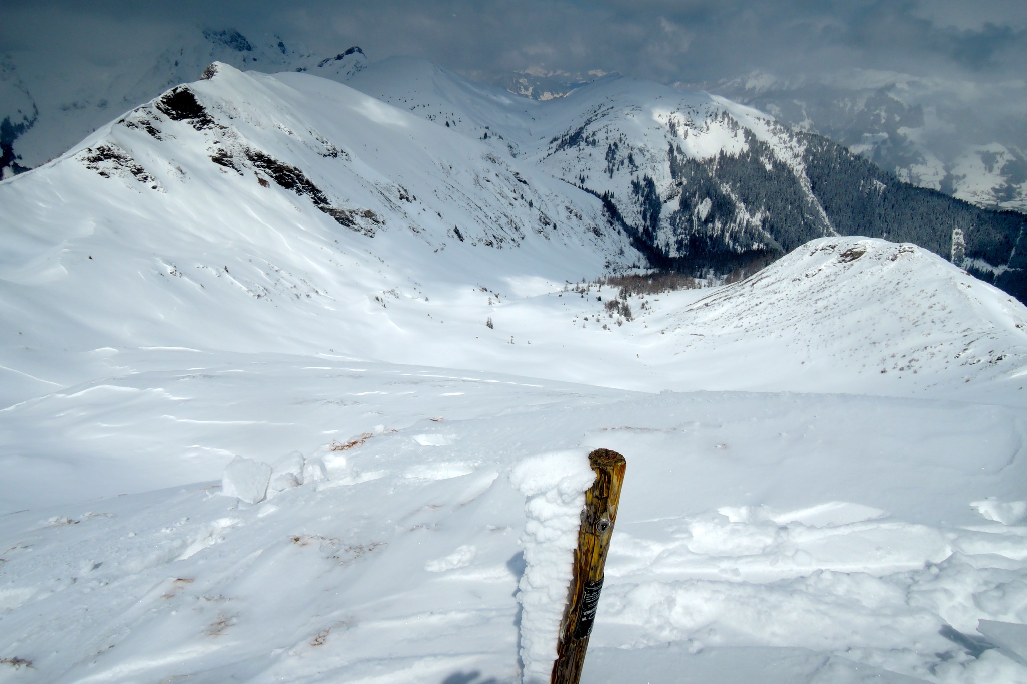 Tourenverhältnisse: Teils abgeblasen, meist fetter Pulver, unten sulzig