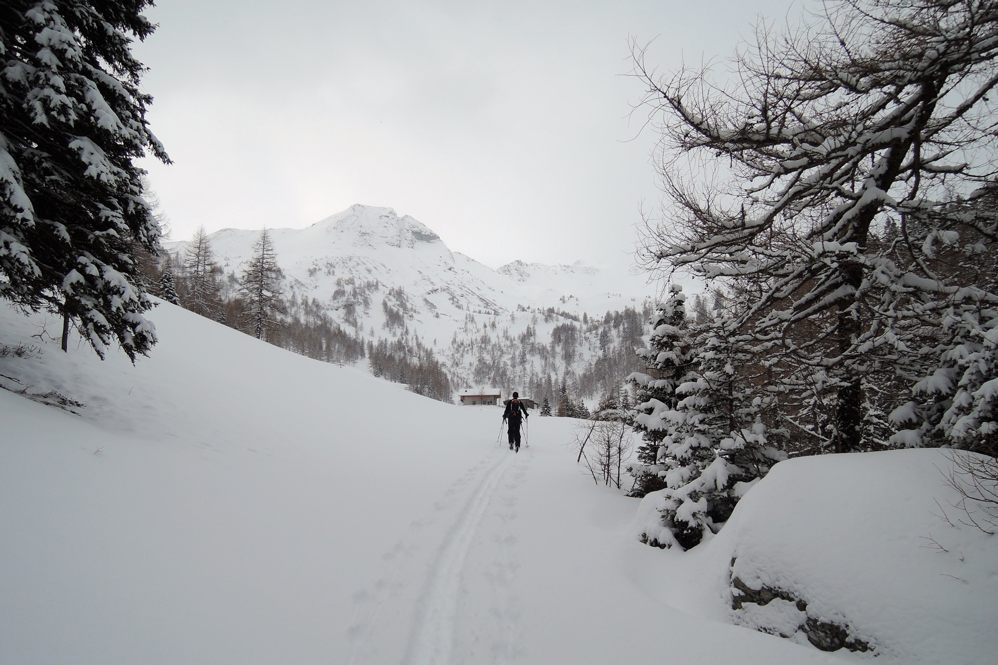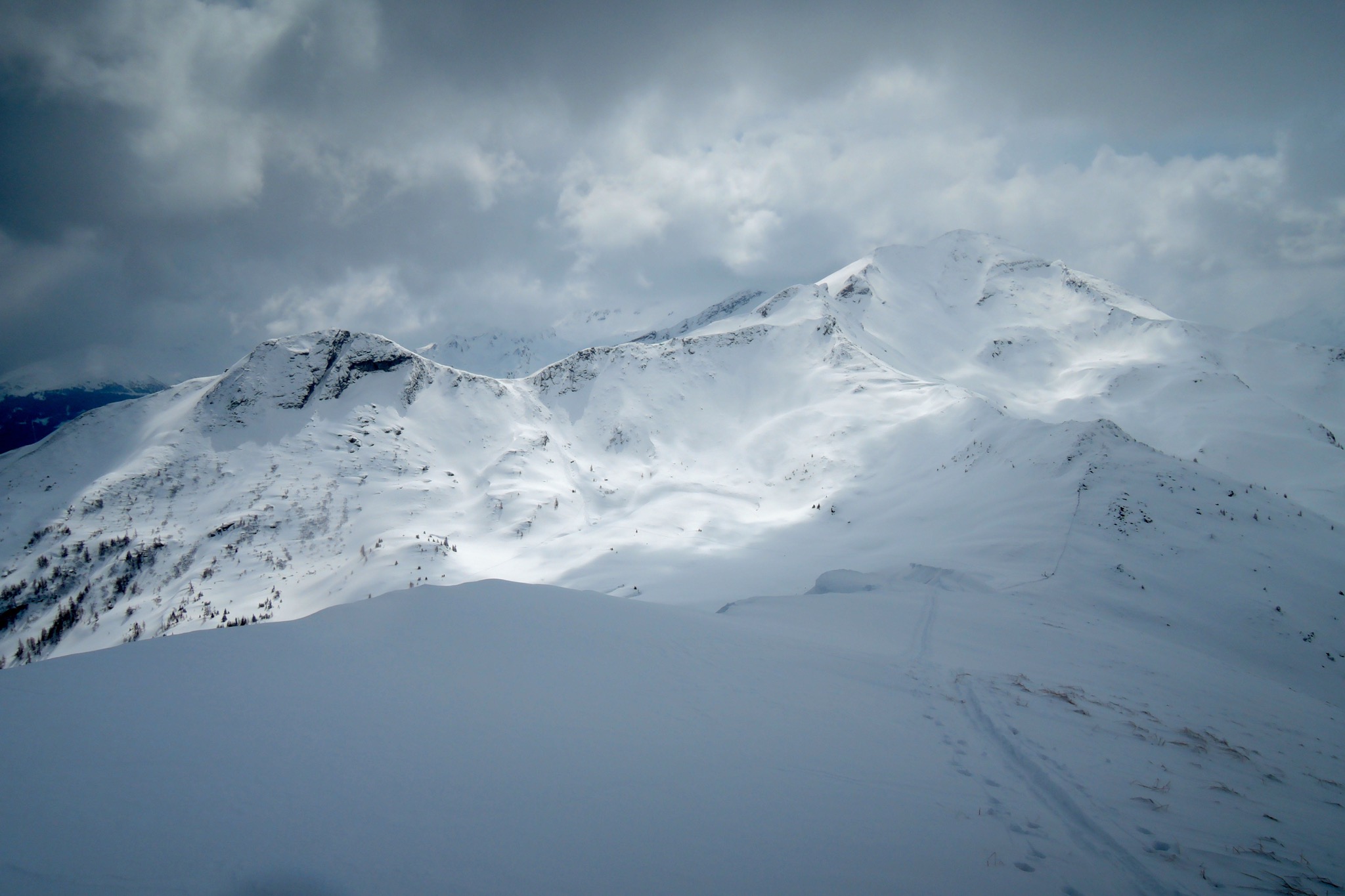Sonstiges: Vom Grabnerhof (1075m) auf dem Forstweg meist eher flach zur Walchalm (1695m). Jetzt über freie, kupierte Hänge Richtung SW auf die Schwarzwand zu. Unterhalb zuerst Richtung WNW, um bald danach in einer weiten Linkskurve steil in die Schwarzwandscharte (2124m) hinauf. Von dieser Richtung O unschwierig auf die Schwarzwand (2204m) zum Gipfelkreuz. Zurück zur Schwarzwandscharte und von dort Richtung NNW in stiebendem Pow hinunter. Angefellt und rüber zur Seebachscharte (1995m). Von dort Richtung NNO über den Gratrücken auf den Jedlkopf (2176m). Weiter Richtung NNO wieder in Pow durch das weite Kar und lichten Wald bis zu den Dorfer Alpen (1660m). Von dort auf der Froststrasse oft flach bis zm Kreuz auf 1350m, dann Richtung O über schöne Lichtungen hinab zum Präau-Niederleger (1160m). Von dort bald auf dem Forstweg zu Fuß ins Tal.