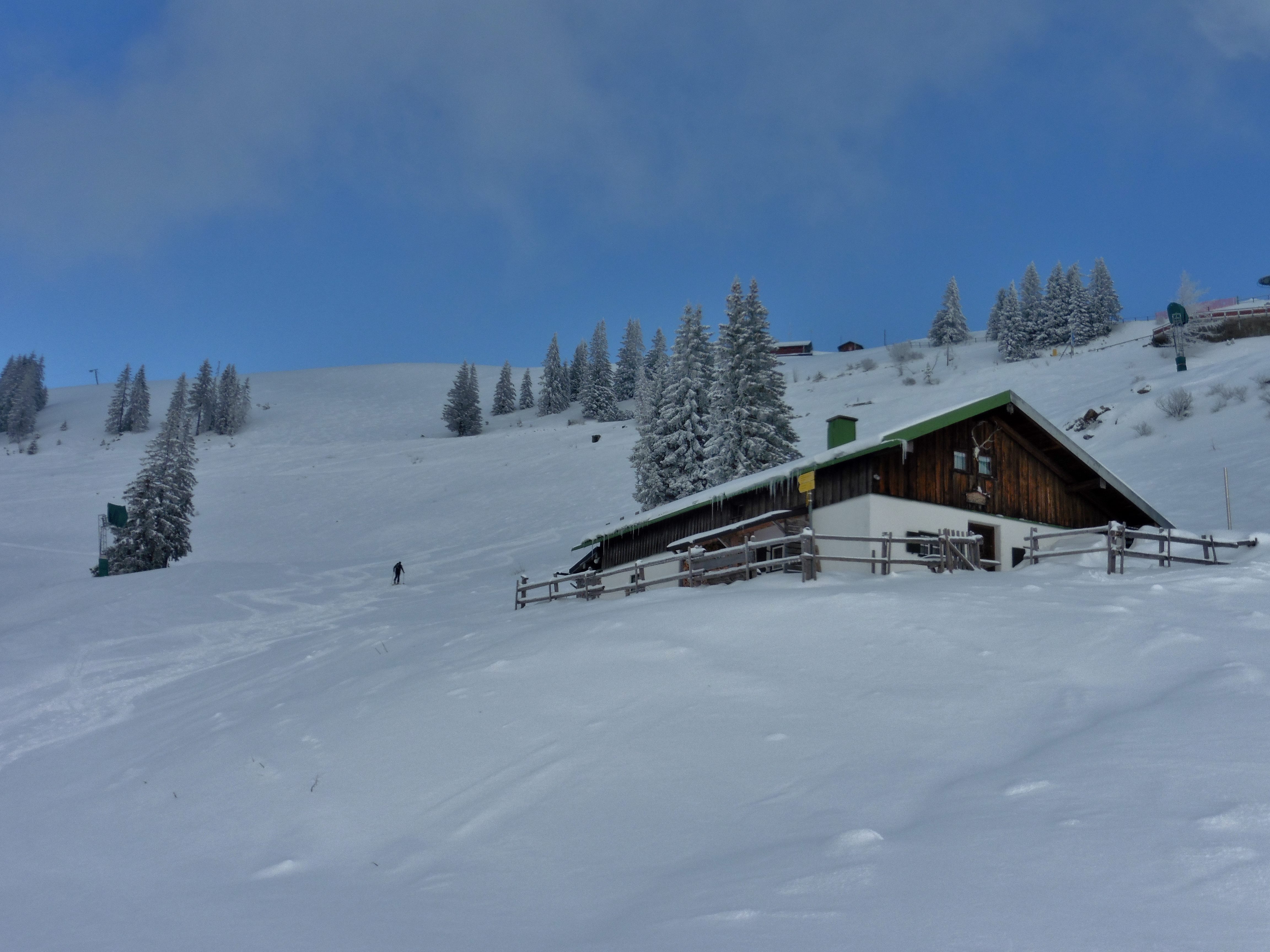 Sonstiges: die Gunst der Stunde nutzend stieg ich frühmorgens ( -6 Grad ) am Tag 1 nach Beendigung des Liftbetriebes entlang der Familienabfahrt aufs Brauneck; von dort Abfahrt über den Gleitweg zur Quenger-Alm und weiter zur Finstemünz-Alm; Aufstieg entlang des Florihang-Liftes in den Sattel und über die Familienabfahrt wieder zum Parkplatz; heute war die Abfahrt noch bis zum Parkplatz möglich; tolle Pulverschneeverhältnisse im gesamten Bereich; bei den prognostizierten Temperaturen für die nächsten Tage wahrscheinlich nicht mehr lohnend; sämtliche Hütten sind geschlossen;