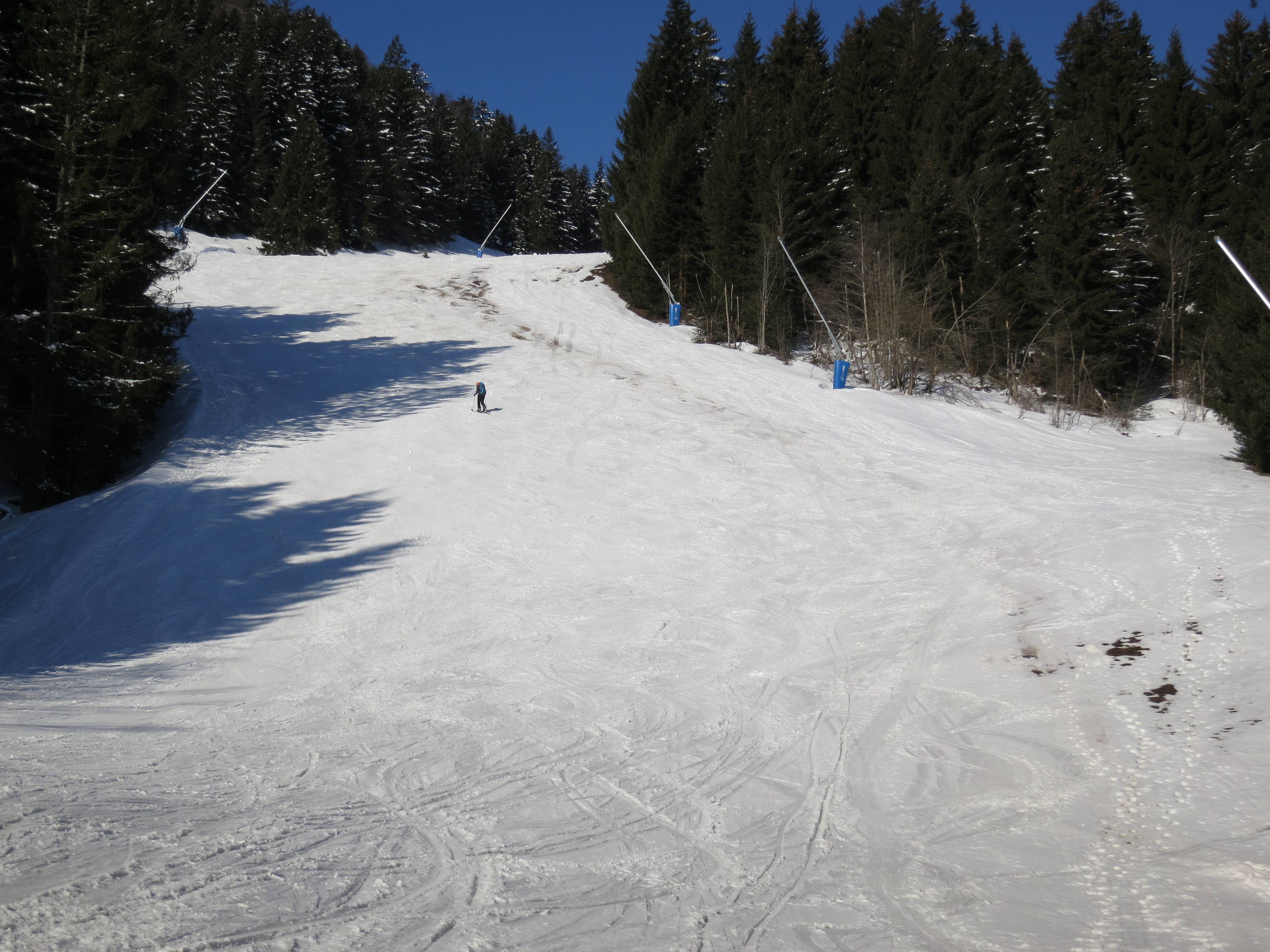 Tourenverhältnisse: Irgendwie kann ich es mir nicht verkneifen, das Brauneck zu posten. Denn entgegen der gestrigen Prognose von lupusmontanus war der untere flache Hang nicht ausgeapert (Bilder 1 und 7; fester Kunstschnee, das Schneebandl hebt wohl noch ein bisschen). Und die Abfahrt war heute sehr lohnend: gut zu fahrender, sulzig-firniger Frühjahrsschnee. Piste in gutem Zustand (Bild 2 zeigt den schlechtesten Abschnitt der Familienabfahrt). Aufgestiegen bin ich im unteren Teil auf der Piste und dann in den Wald Richtung Florihütte eingebogen (Bilder 3 und 4); auch hier noch keine aperen Stellen.