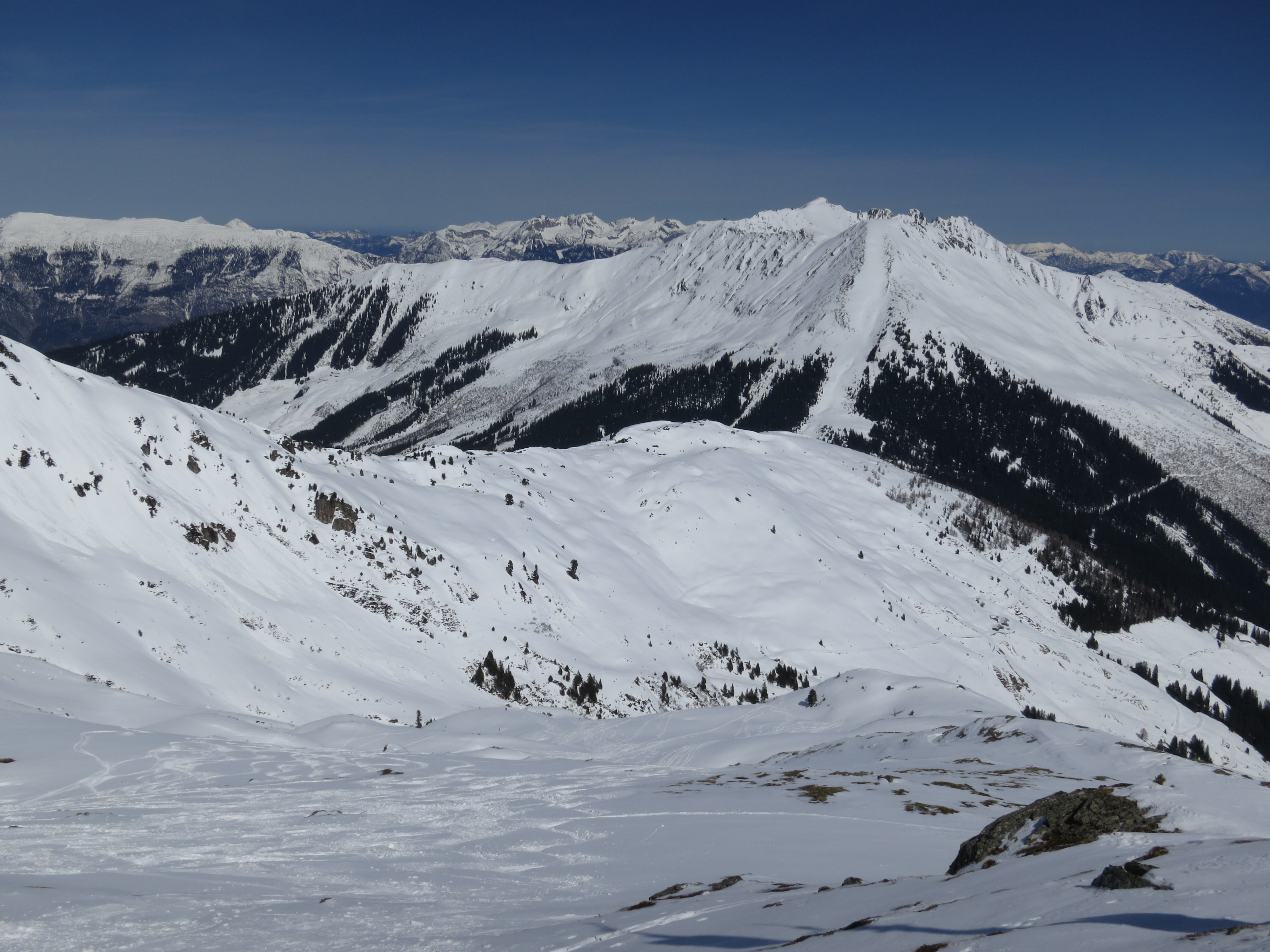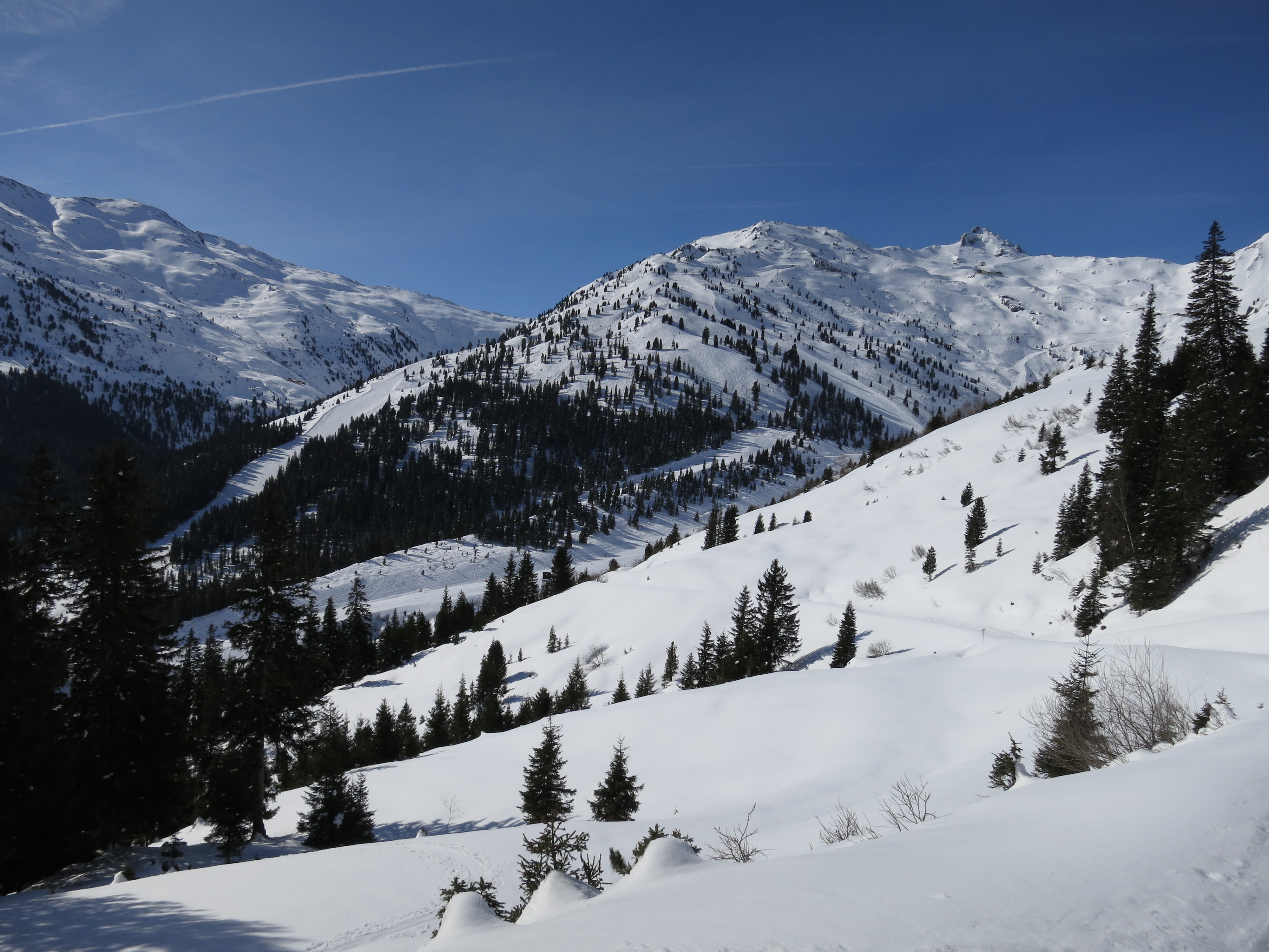 Tourenverhältnisse: Aufgestiegen bin ich über die Ostseite. Nur wenige Meter auf der Loipe Richtung Loassattel und dann nach links bergauf war heute eine gute Aufstiegsspur gelegt: anfangs durch lichten Wald, später kurz eine Forststraße (Bilder 1 und 2) und dann über freie Hänge zu der üblichen Aufstiegsspur (Bild 3), bei der man bis kurz vor der Linkskurve der Loipe geht und dann im Wald aufsteigt. Der Schnee war vormittags schon nicht mehr gefroren und lies Sulz für die Abfahrt vermuten und keinen Firn. So bin ich direkt vom Gipfel nach N/NO Richtung Maschentalbach abgefahren. Es gab viel angefeuchteten, etwas gesetzten Pulverschnee (Bild 7), der aber doch noch verhältnismäßig gut zu fahren war. Es geht problemlos bis zur Loipe und dann auf dieser zurück zum Parkplatz.