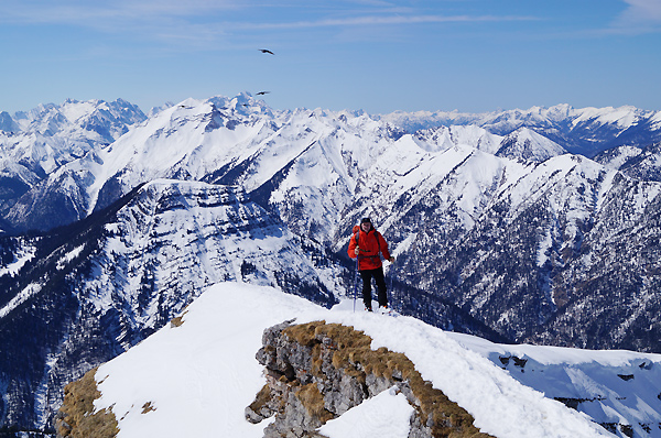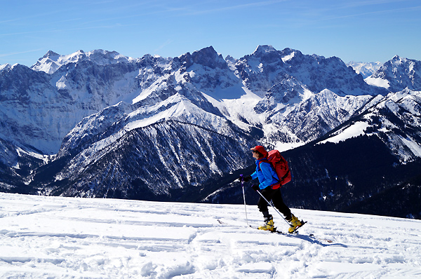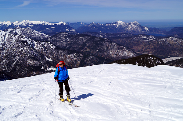 Tourenverhältnisse: vom Parkplatz weg gings heute Morgen noch auf einer dünnen Schneeschicht mit Fellen los. Bis ca. 1150 m hinauf musste man ab und zu für ein paar Meter abschnallen, danach durchgehende Schneedecke. Die Latschenzone vor dem Gipfelhang ist sehr gut eingeschneit. Die warmen Temperaturen haben der Forststraße allerdings im Tagesverlauf arg zugesetzt. Wer seine neuen Skier nicht schrotten möchte, der muss ab eben 1150 m die Schlappen nach unten tragen. Mit Steinski gehts noch ein paar Hm weiter hinab:-)