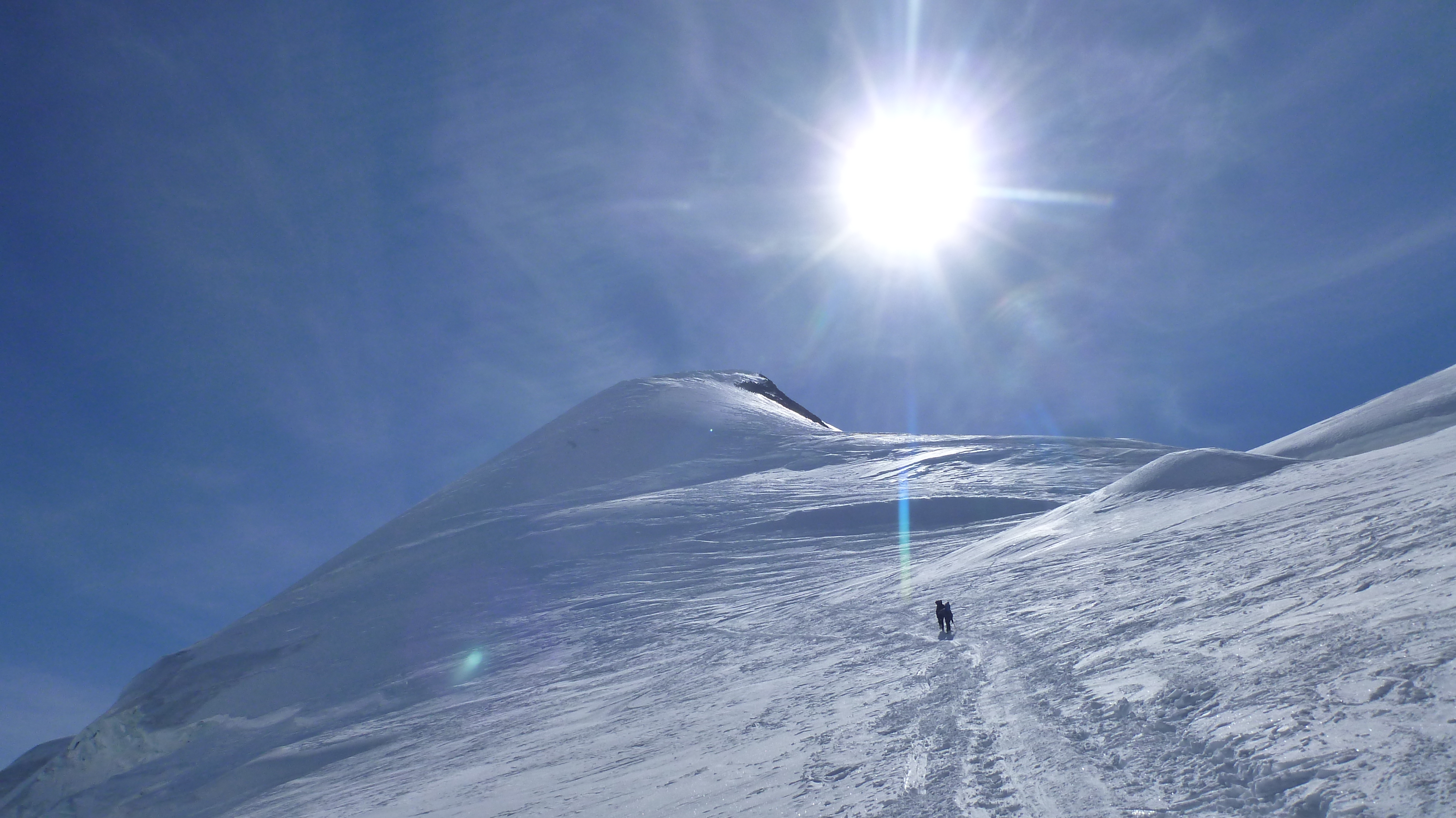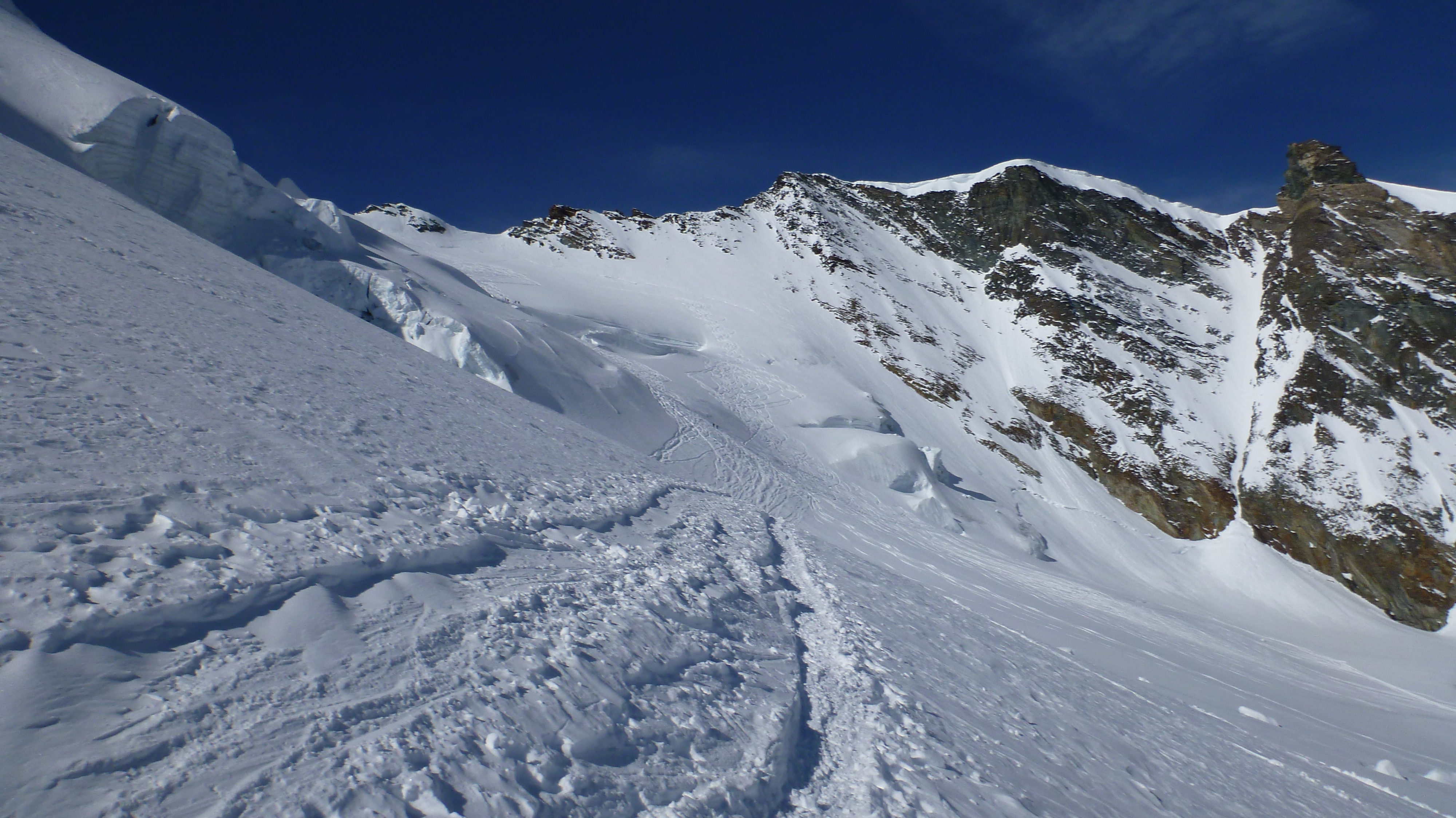 Tourenverhältnisse: Aufstieg zunächst von Britanniahütte zur Metroalpin und Auffahrt zum Mittelallalin (26 CHF), von dort Aufstieg über mittelsteiles Gelände durch die Gletscherspalten zum Feejoch, von dort über abgeblasene Steilstufe auf Gipfelrücken (Spur eisig, Harscheisen angenehm) zum Skidepot. Von dort über guten Stapfschnee zum Gipfelkreuz.