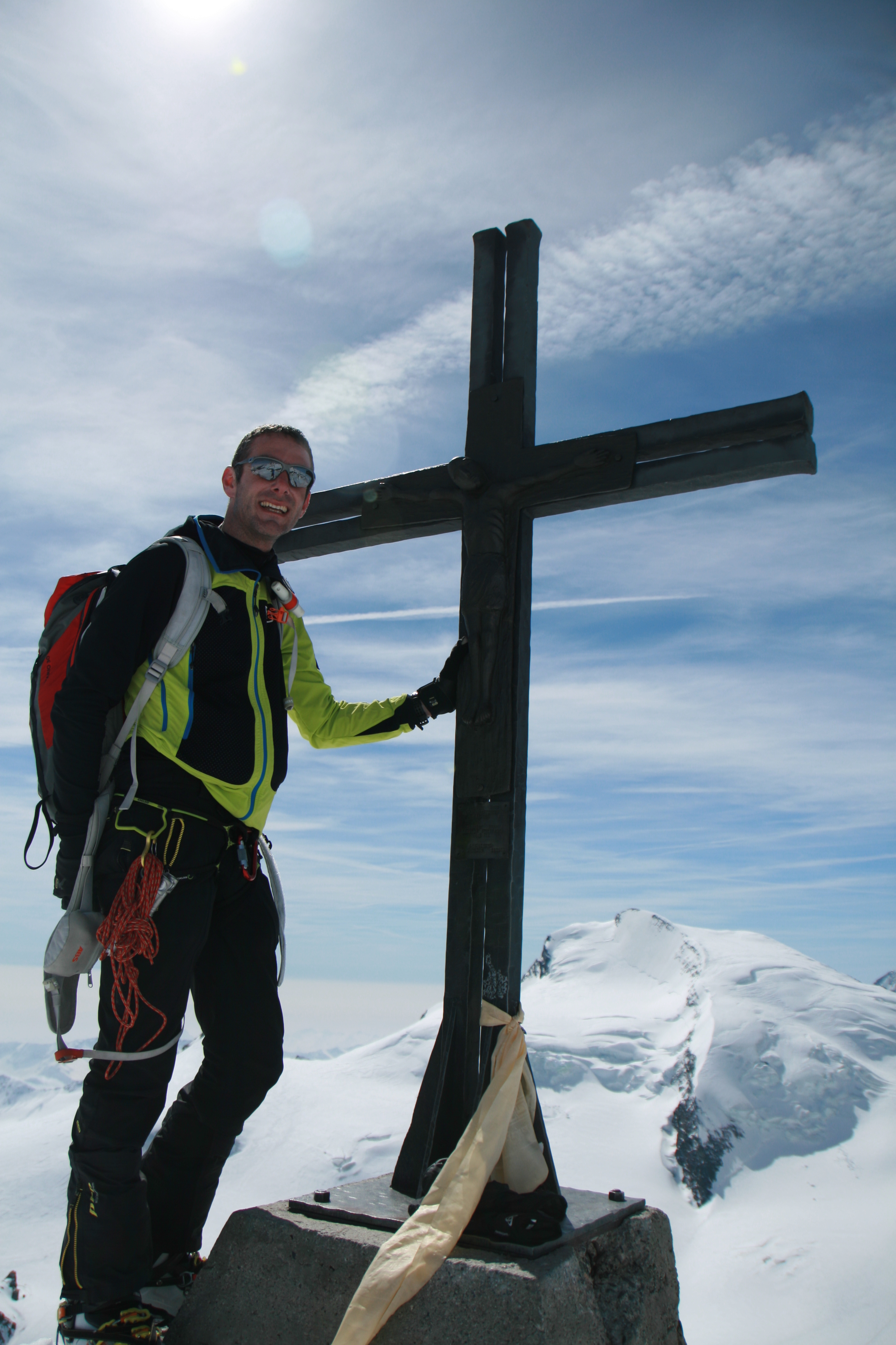 Tourenverhältnisse: Aufstieg zunächst von Britanniahütte zur Metroalpin und Auffahrt zum Mittelallalin (26 CHF), von dort Aufstieg über mittelsteiles Gelände durch die Gletscherspalten zum Feejoch, von dort über abgeblasene Steilstufe auf Gipfelrücken (Spur eisig, Harscheisen angenehm) zum Skidepot. Von dort über guten Stapfschnee zum Gipfelkreuz.