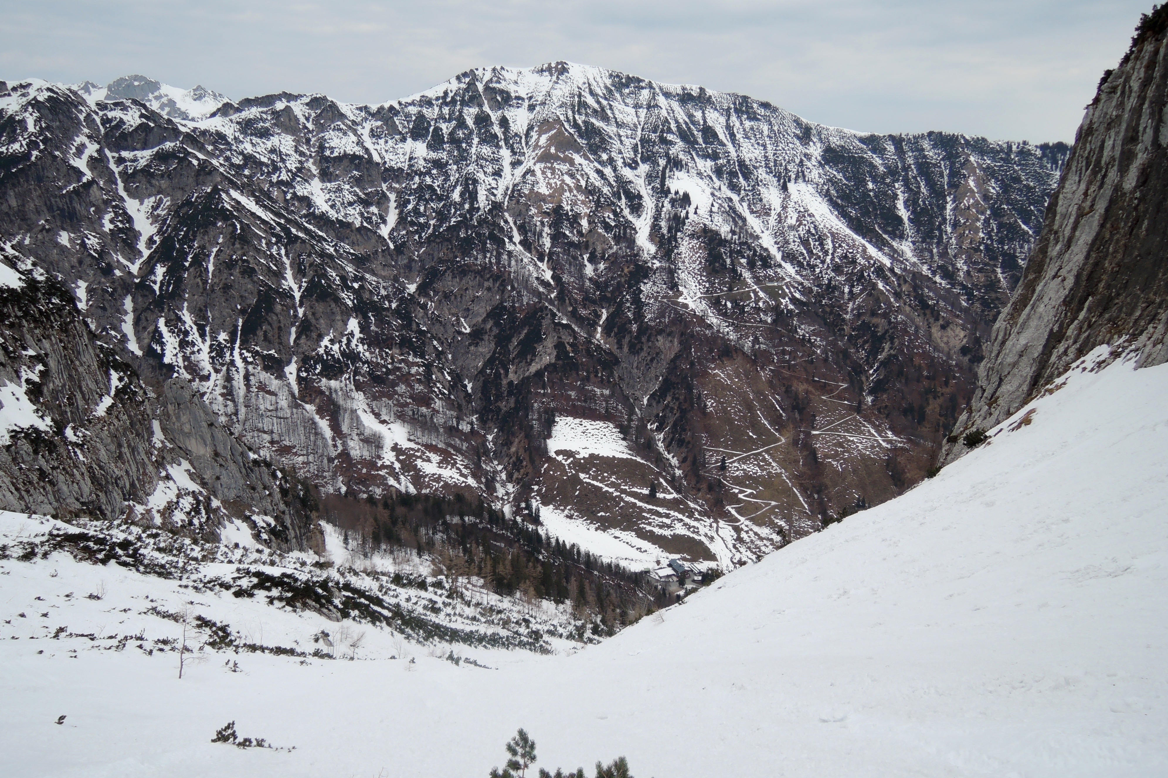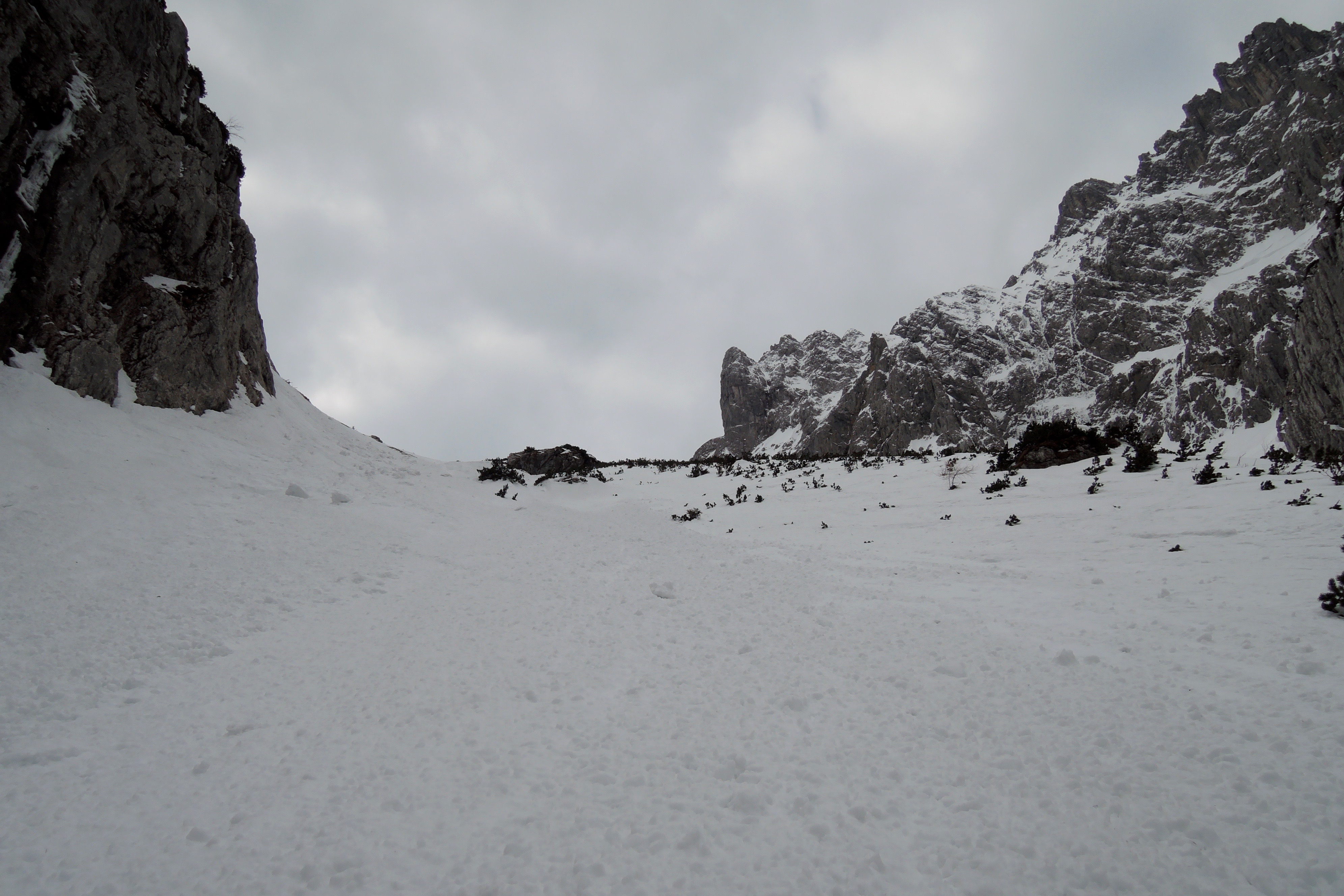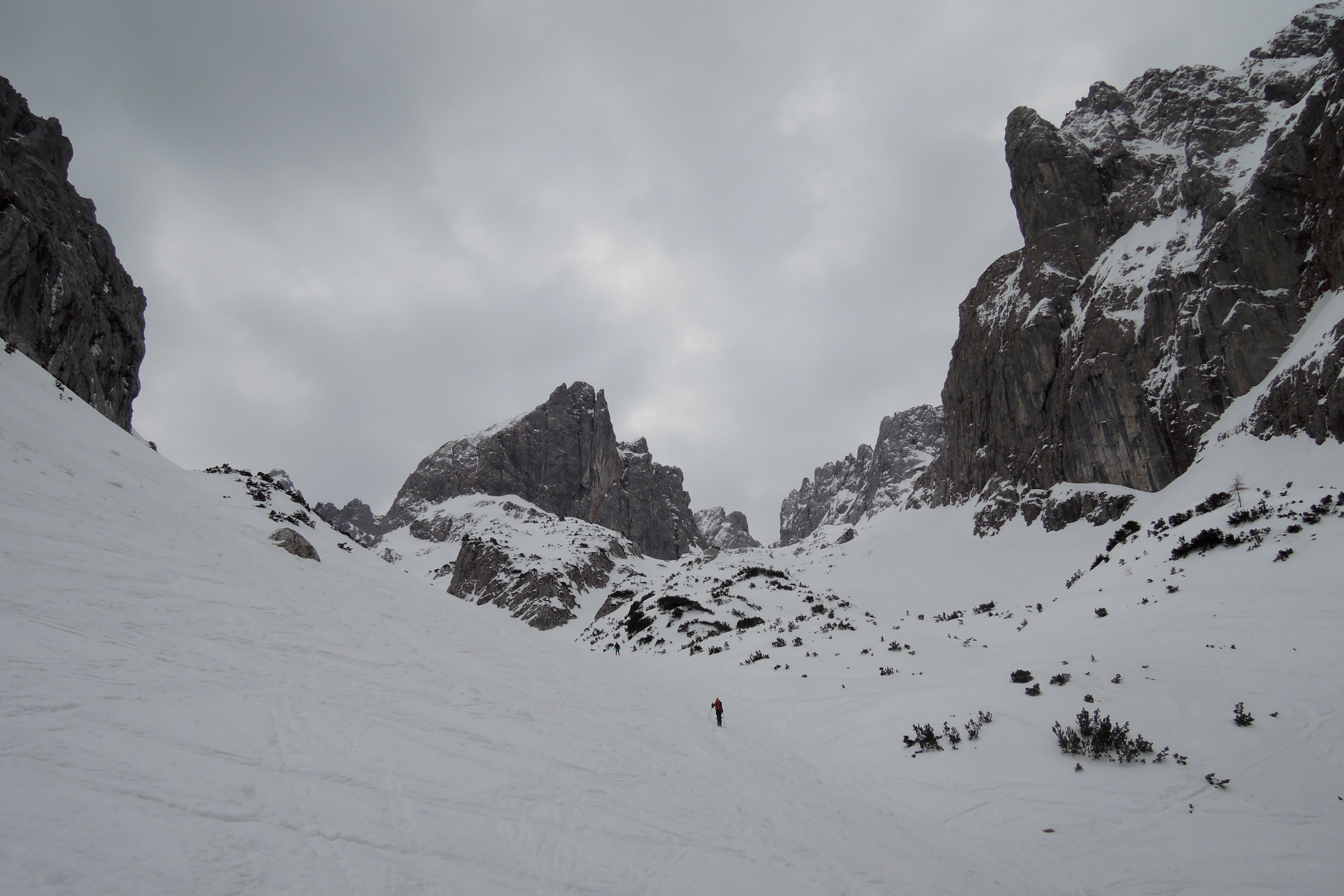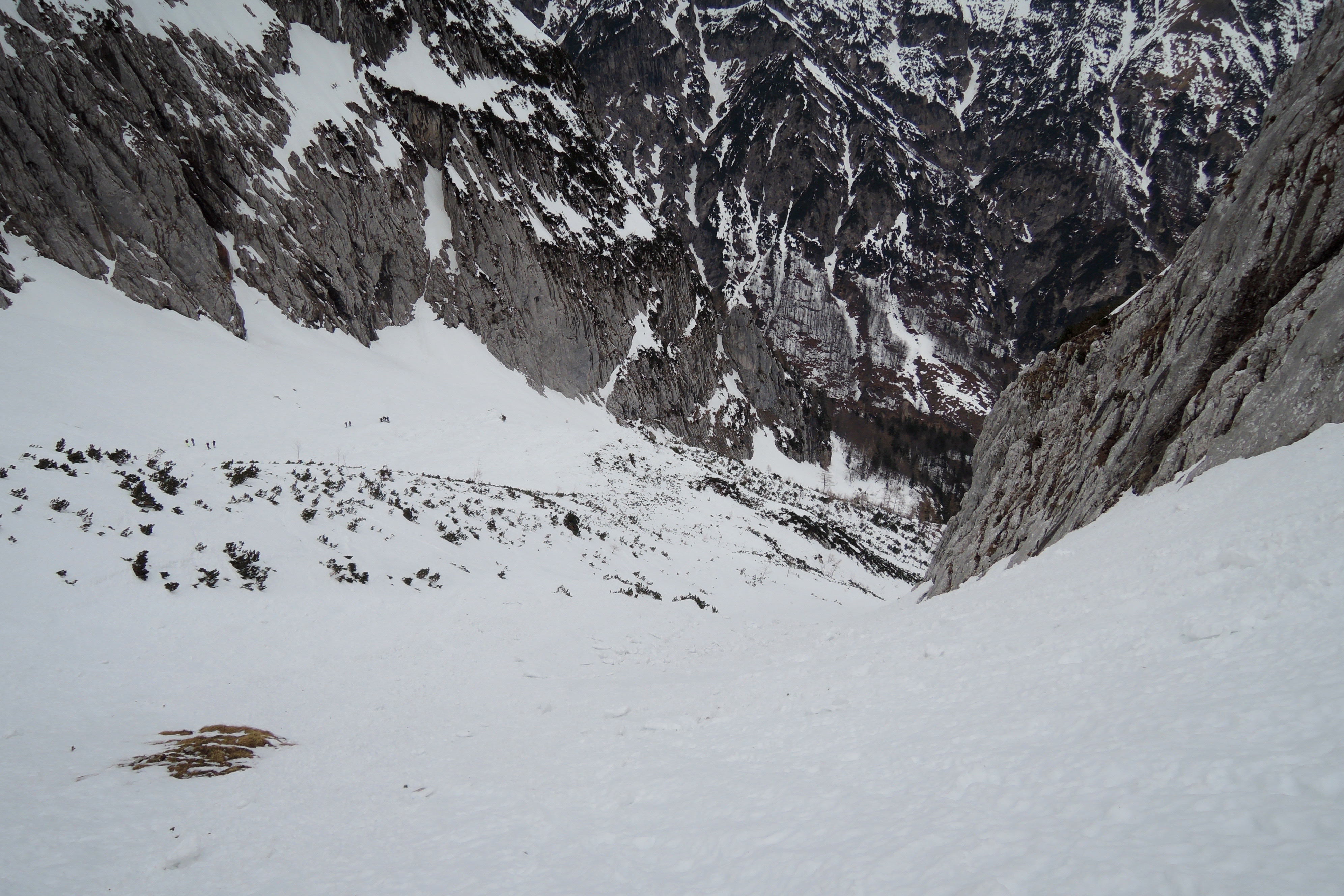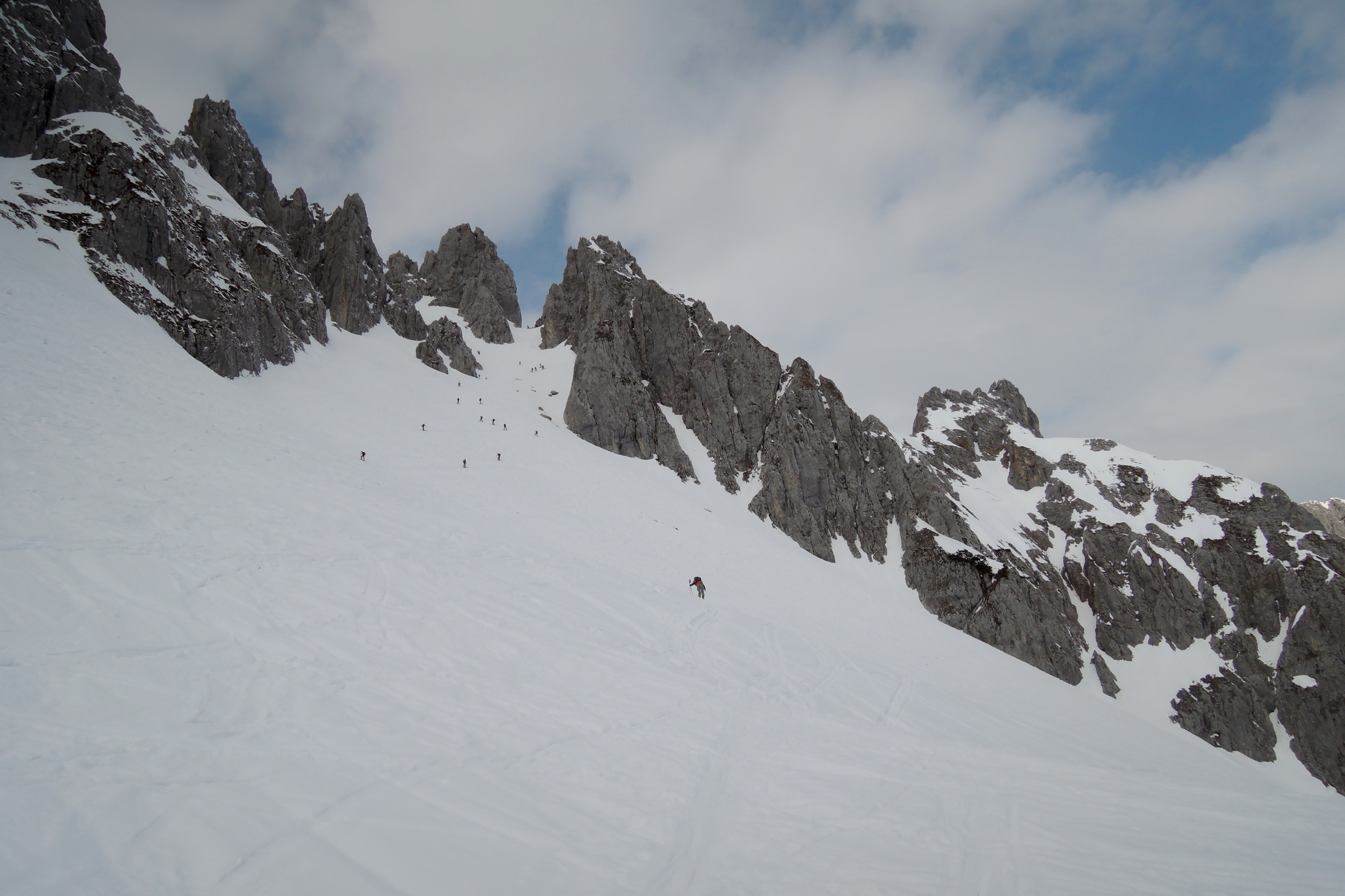 Tourenverhältnisse: Scharte pistenartig eingefahren. Aufgrund der fehlenden nächtlichen Abstrahlung nur stumpfer Sulz. Im Griesener Kar vereinzelt bereits Steine.