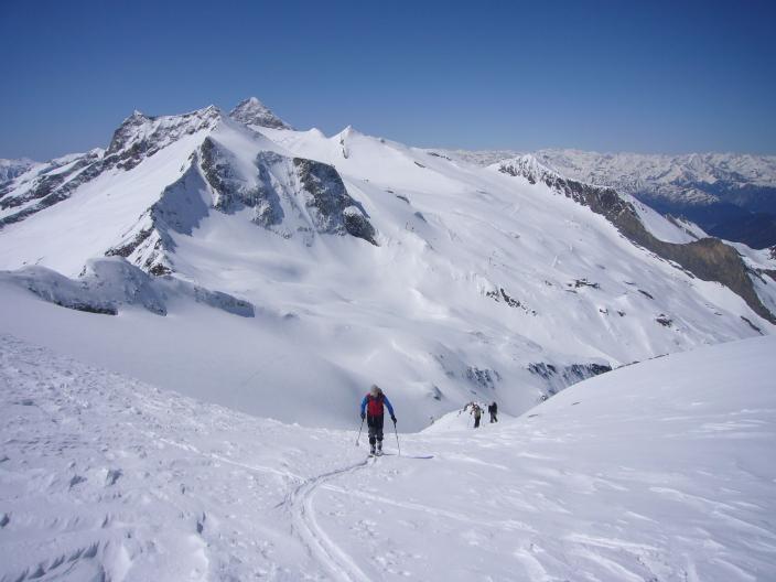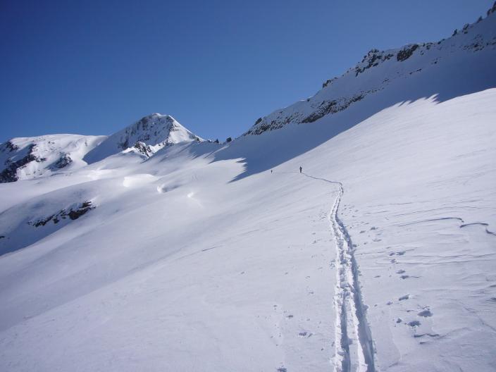 Nur wenige Tourengeher. Über schöne Mulden und Rampen bis unter die Westflanke. Die Steilrinne zum Gipfel war problemlos. Oben etwas windig mit Superfernsicht.