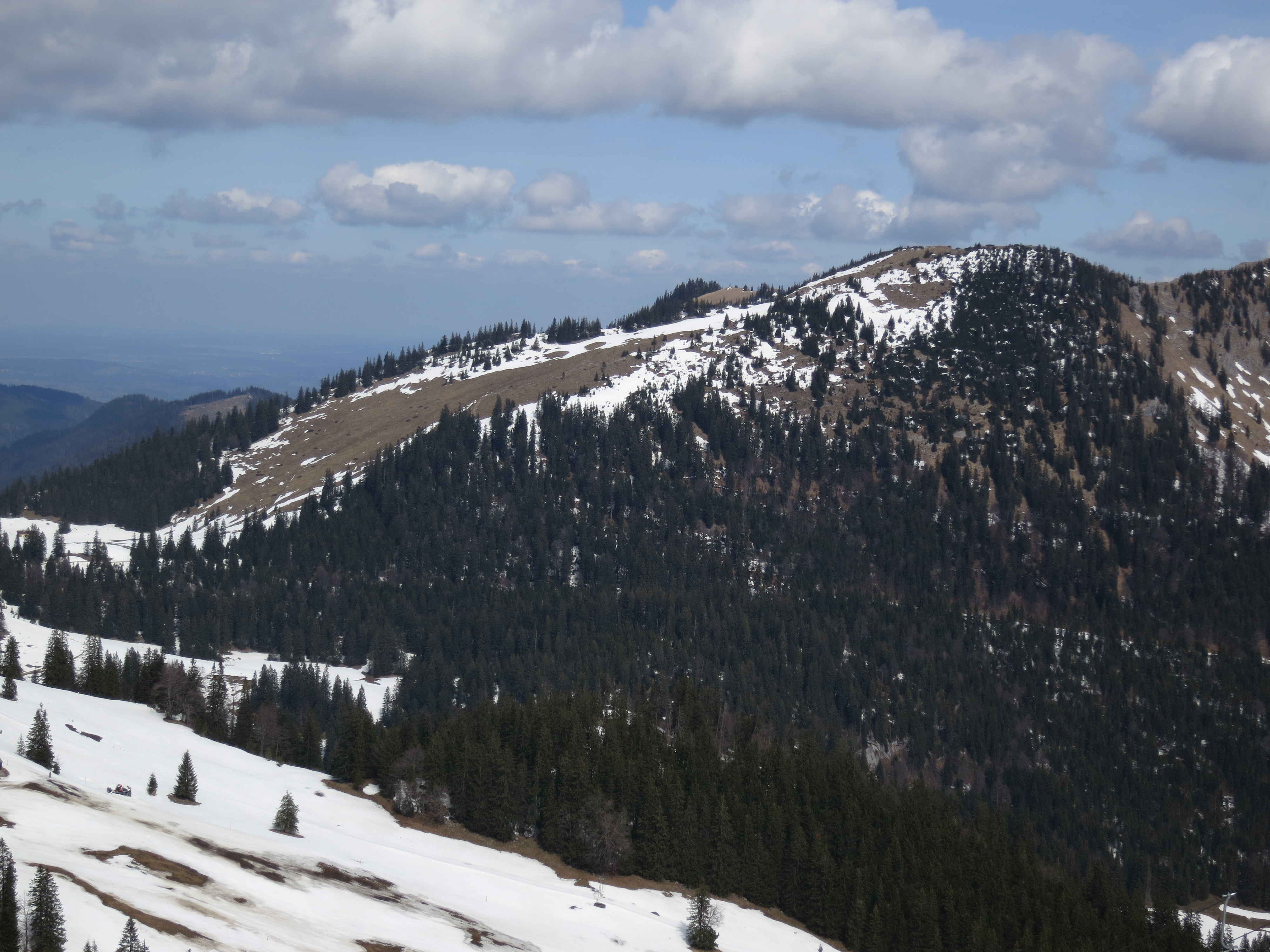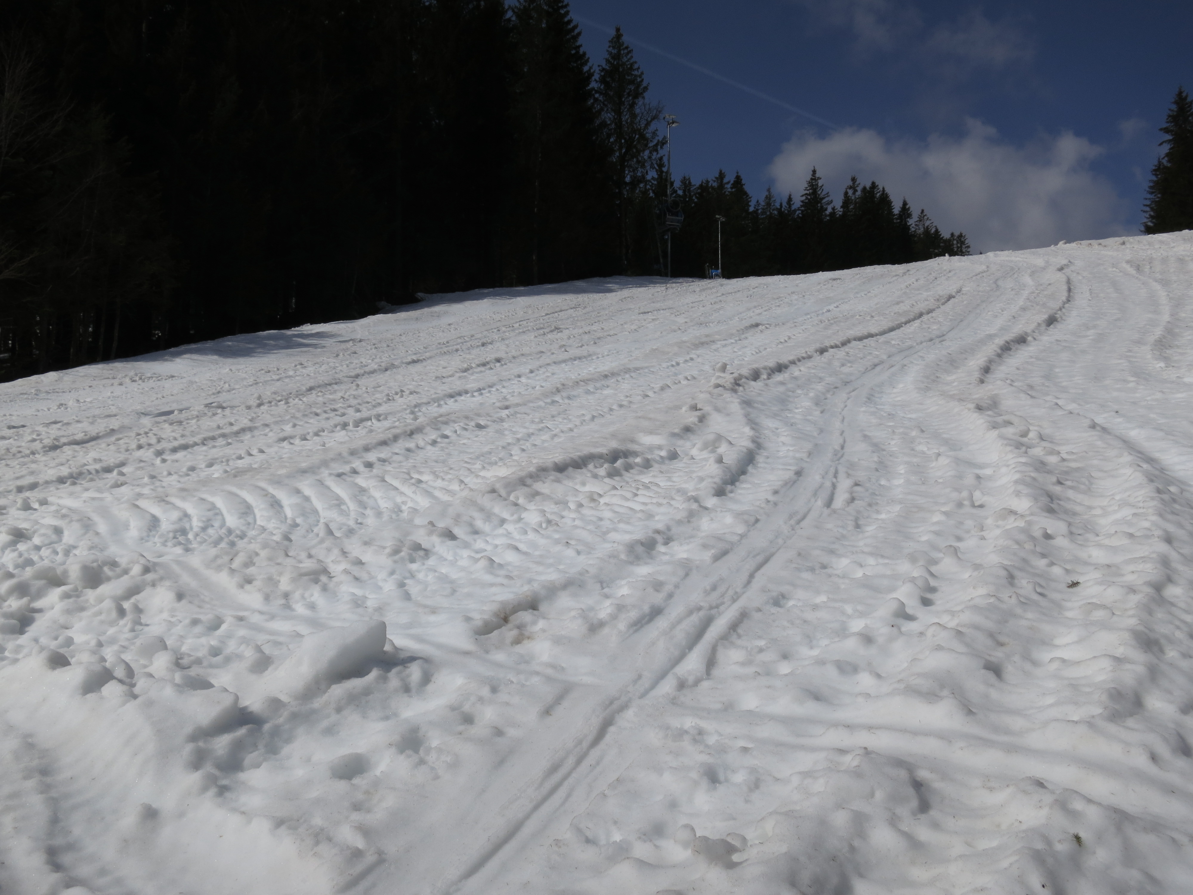 Tourenverhältnisse: wenn man den Roßkopf auf der ehemals beschneiten Piste Nr. 1 und dann weiter an der Roßkopfbahn-Talstation vorbei die Piste (Bild 9) hinaufgeht, dann liegt noch relativ viel Schnee. Nur das allerletzte Stück zum Gipfel könnte bald aper werden (Bild 8). Auch die Hänge von der Osthang-Alm Richtung Stümpfling beginnen auszuapern (Bild 3). Die Abfahrt vom Gipfel zum Parkplatz ist durchgehend möglich: heute war kurz nach 12 Uhr etwas sulziger, aber noch gut zu fahrender Frühjahrsschnee. Teilweise war die Piste schon von den Pistenraupen "ohne Glättung" befahren worden (Bild 2), spielt aber bei dem weichen Schnee keine große Rolle. Insgesamt für diese Höhe gute Verhältnisse. Ein Tourler hat berichtet, dass die Suttenabfahrt etwas stärker umgeackert war (Bild 5).