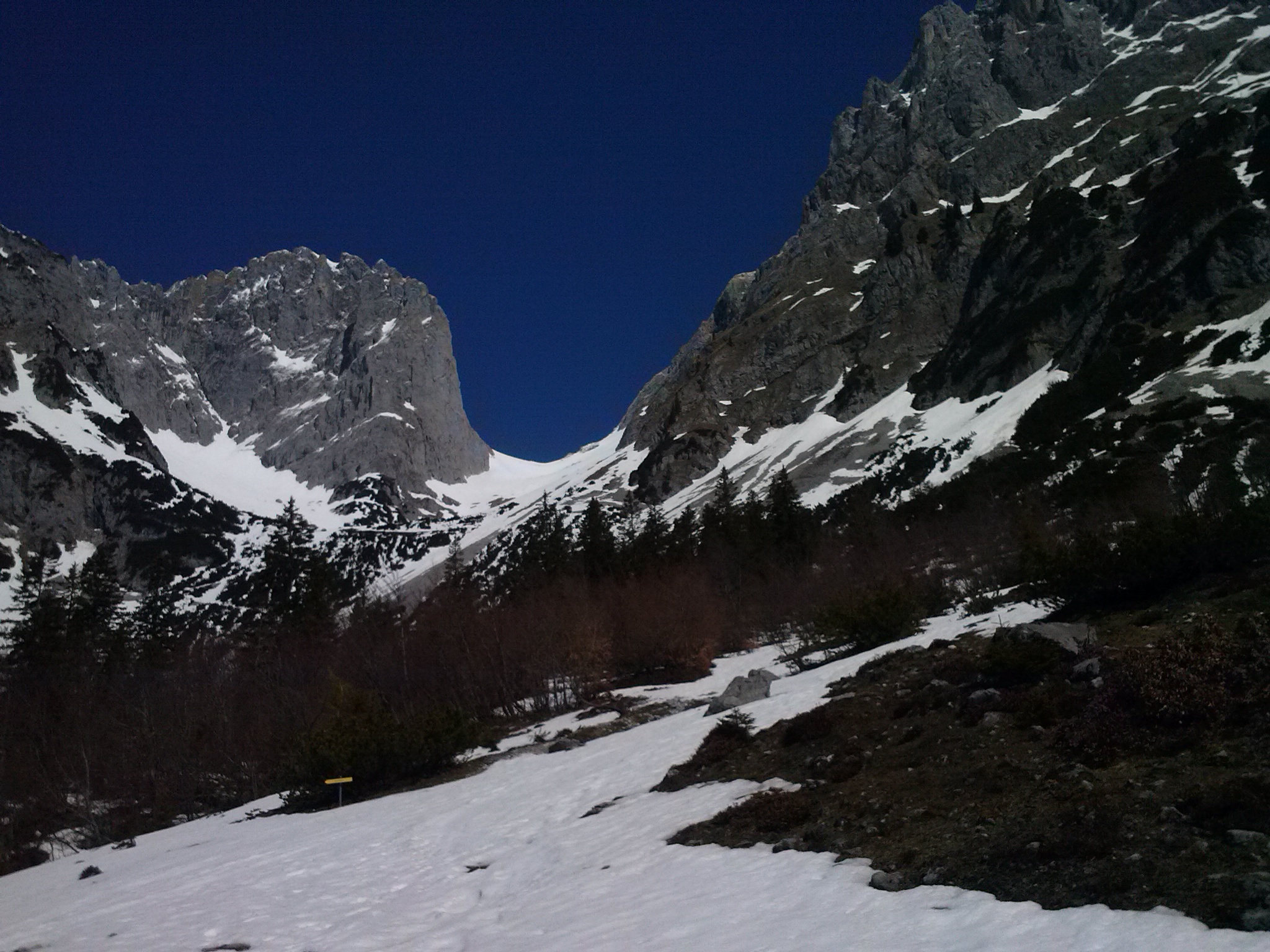 Tourenverhältnisse: Der Schnee beginnt erst circa 500m hinter der Gadeamus Hütte in der Talmitte, die ostseitigen Hänge sind schon recht aper. Daher Aufstieg eher mittig entlang der großen Latschenfelds auf einem dünnen, gerade noch durchgehenden Schneestreifen. Ab cica 1500m dann deutlich mehr Schnee (im Kübel). In der 2. Steilstufe viele bolige Lawinenreste. Im oberen Drittel dünne Neuschneeauflage. Oben kühl aber grandiose Fernsicht. Anstieg zur Hinteren Goinger Halt wohl nur mit Steigeisen möglich, Felsen sind noch recht verschneit.