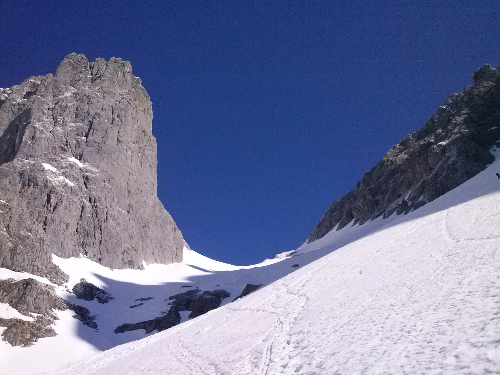 Abfahrt um 11 Uhr. In der oberen Hälfte recht hart und ruppig. Danach weicher, aber die Schneedecke in den Schuttreisen ist schon so dünn, dass überall Steine rausschauen. Am besten waren eigentlich die letzen Schwünge durch den lichten Wald oberalb der Gaudeamus Hütte.
