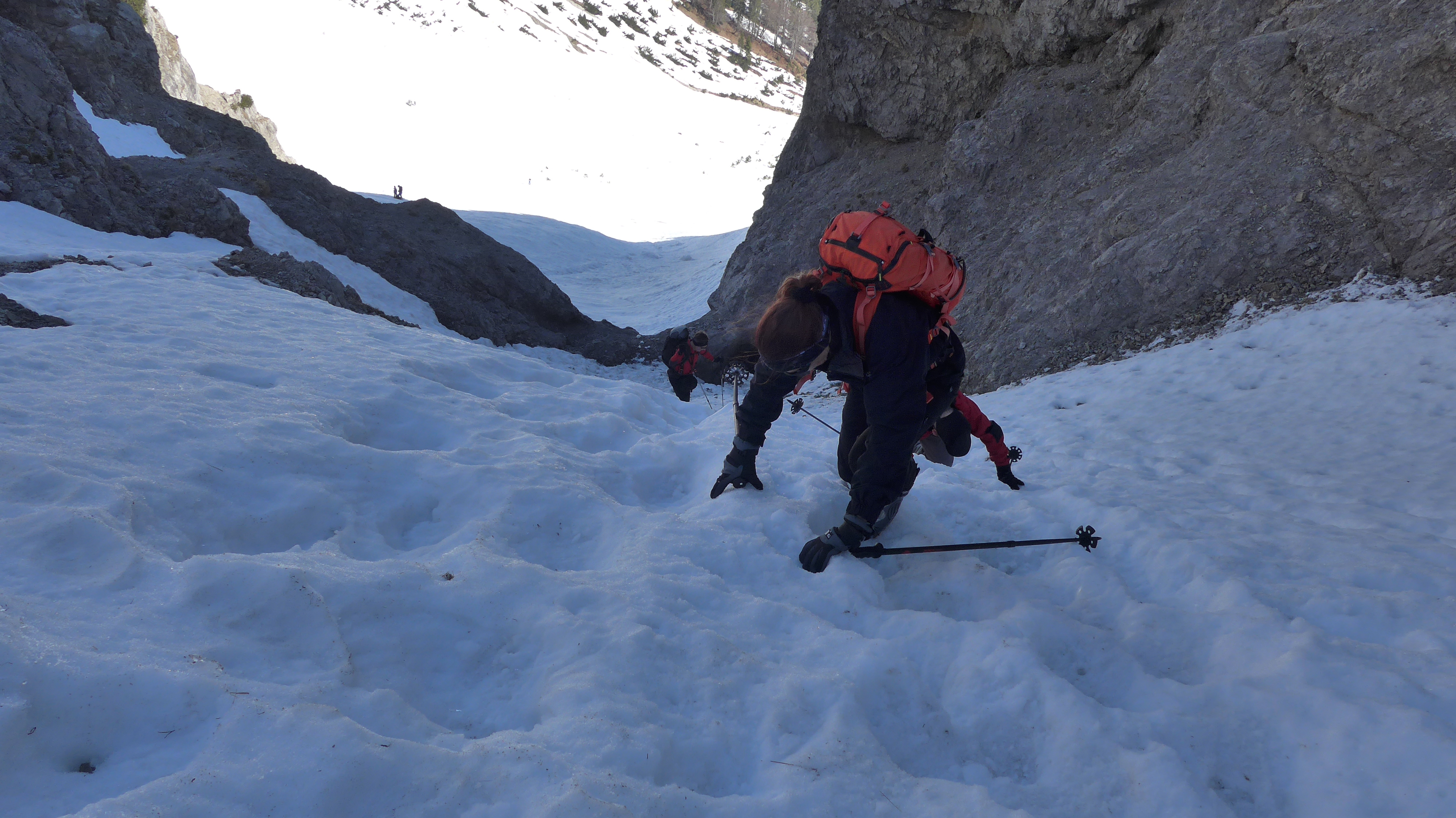 Flott gegangen ca. 20 min. Ski getragen. Das Kar hat noch viel Schnee. Lohnend! Das Schlupfloch ist durchgängig. Leicht vereiste Tritte zur Scharte - hier haben sich einige damit schon schwer getan (Abstieg).