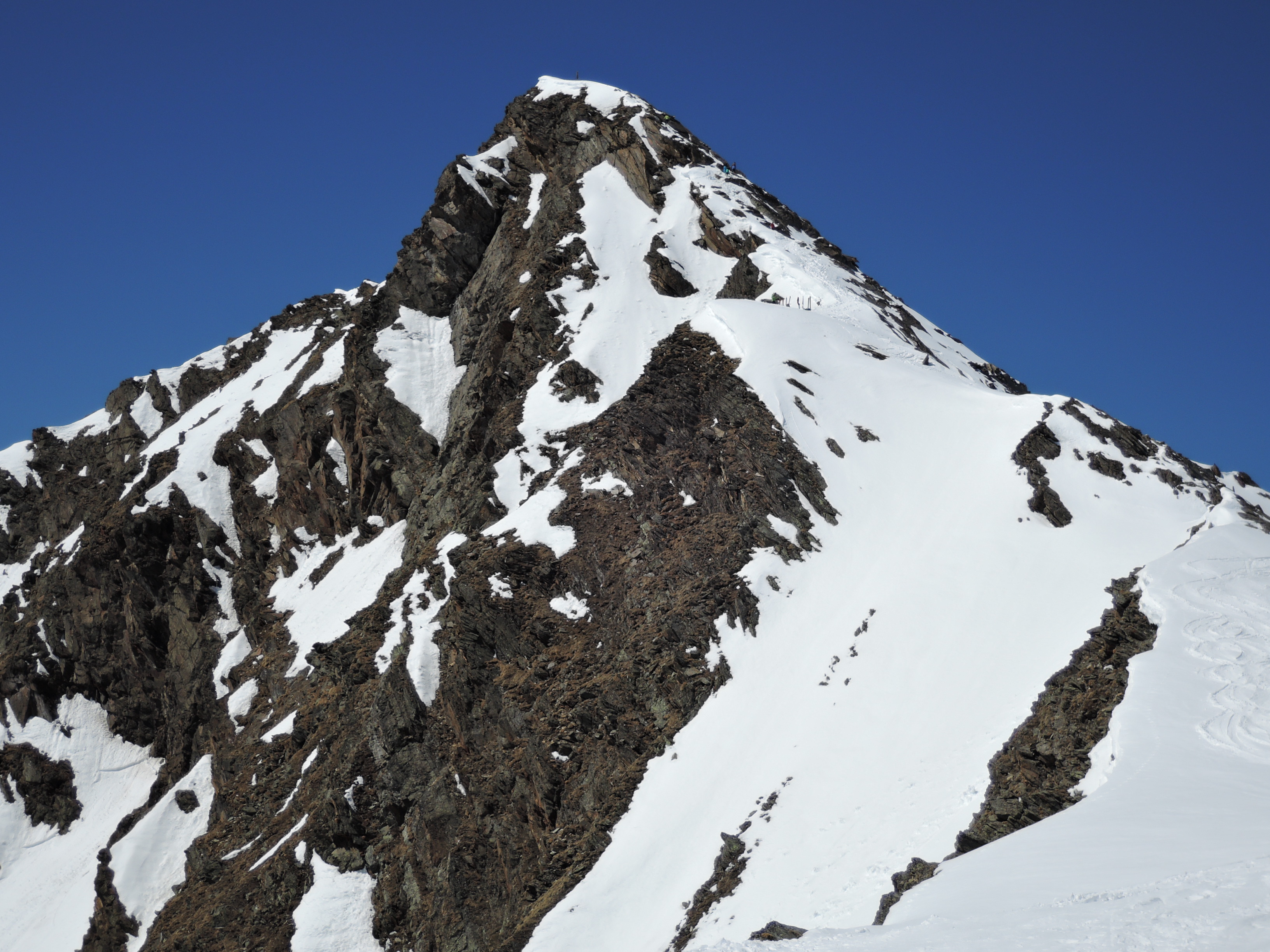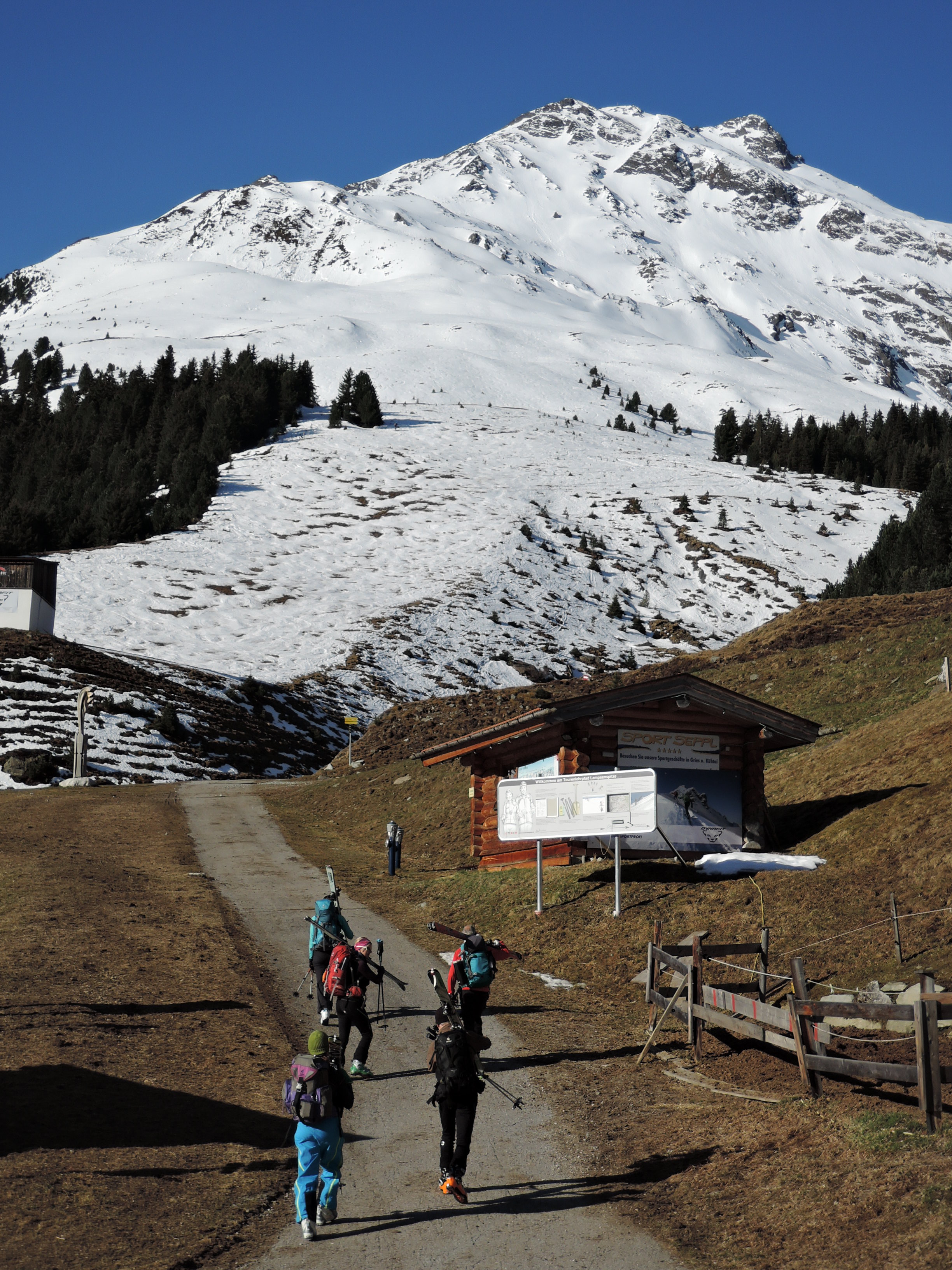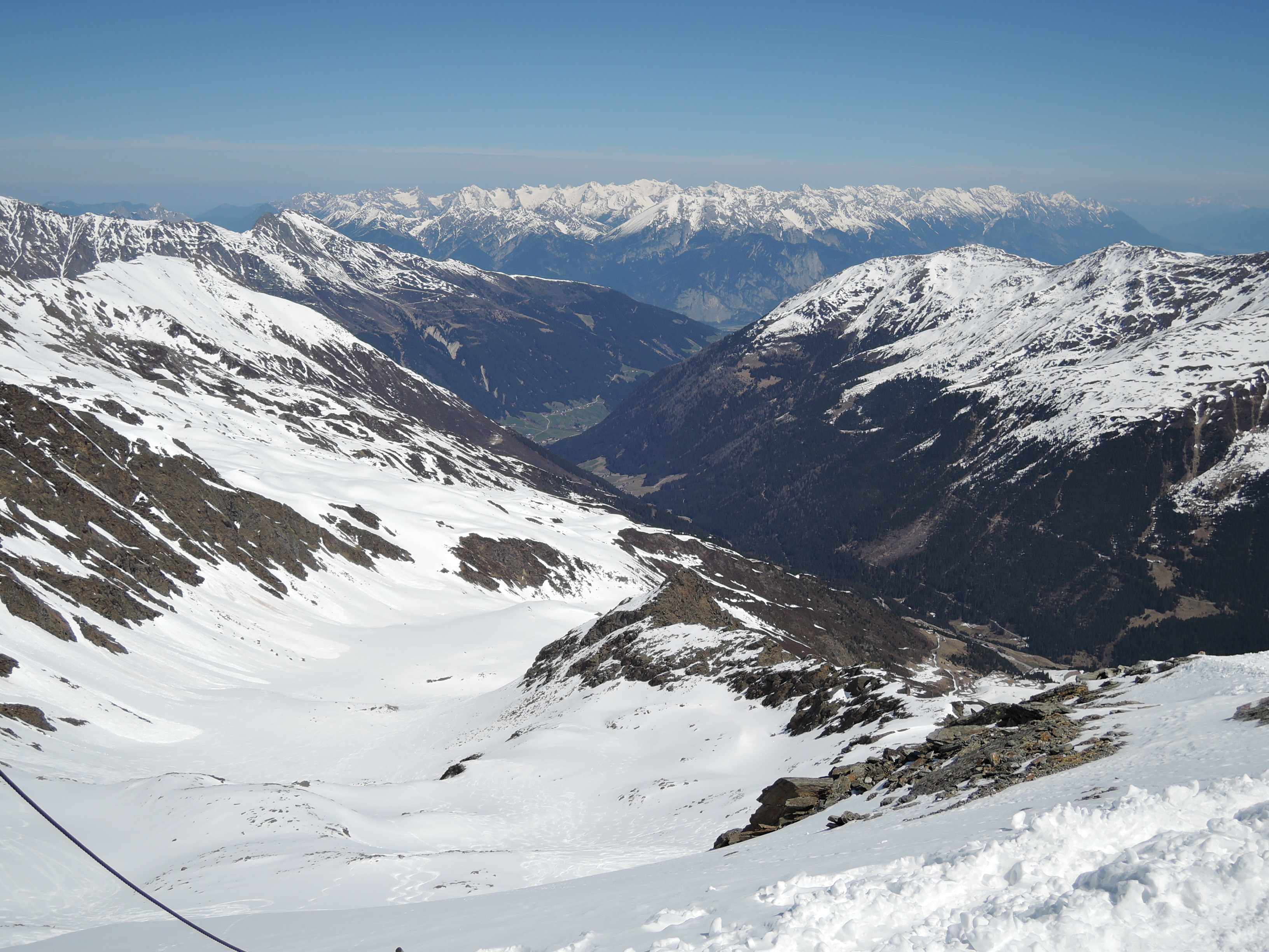 Tourenverhältnisse: Heute den so bekannten Zischgeles im Sellrain gemacht. Bedingungen trotz viel Sonne seit dem letzten Schneefall am Samstag immer noch ziemlich gut. Vom PP trägt man die Ski bis nahe der alten Liftstation und dann kanns auch schon losgehen. Wie am Sonntag schon berichtet ist der allermeiste Schnee an den Steilhängen abgegangen, also günstige Bedingungen. Aufsteigen ging sehr angenehm. Harscheisen sind nicht nötig. Ab Skidepot zum Gipfel ist der Weg griffig und gut zu gehen bis auf das Steilstück mit Kette und einen Felsen der zu überklettern ist. Heute perfekte Fernsicht bis Großvenediger und sehr schön auch das Karwendel auf der anderen Seite des Inntals. Die Abfahrt ein reiner Genuß. Es gibt zwar pistenmäßig eingefahren Passagen aber im oberen Drittel findet man auch noch tollen Pulverschnee. Weiter runter dann ziemlich angenehm zu fahrender Firn.
