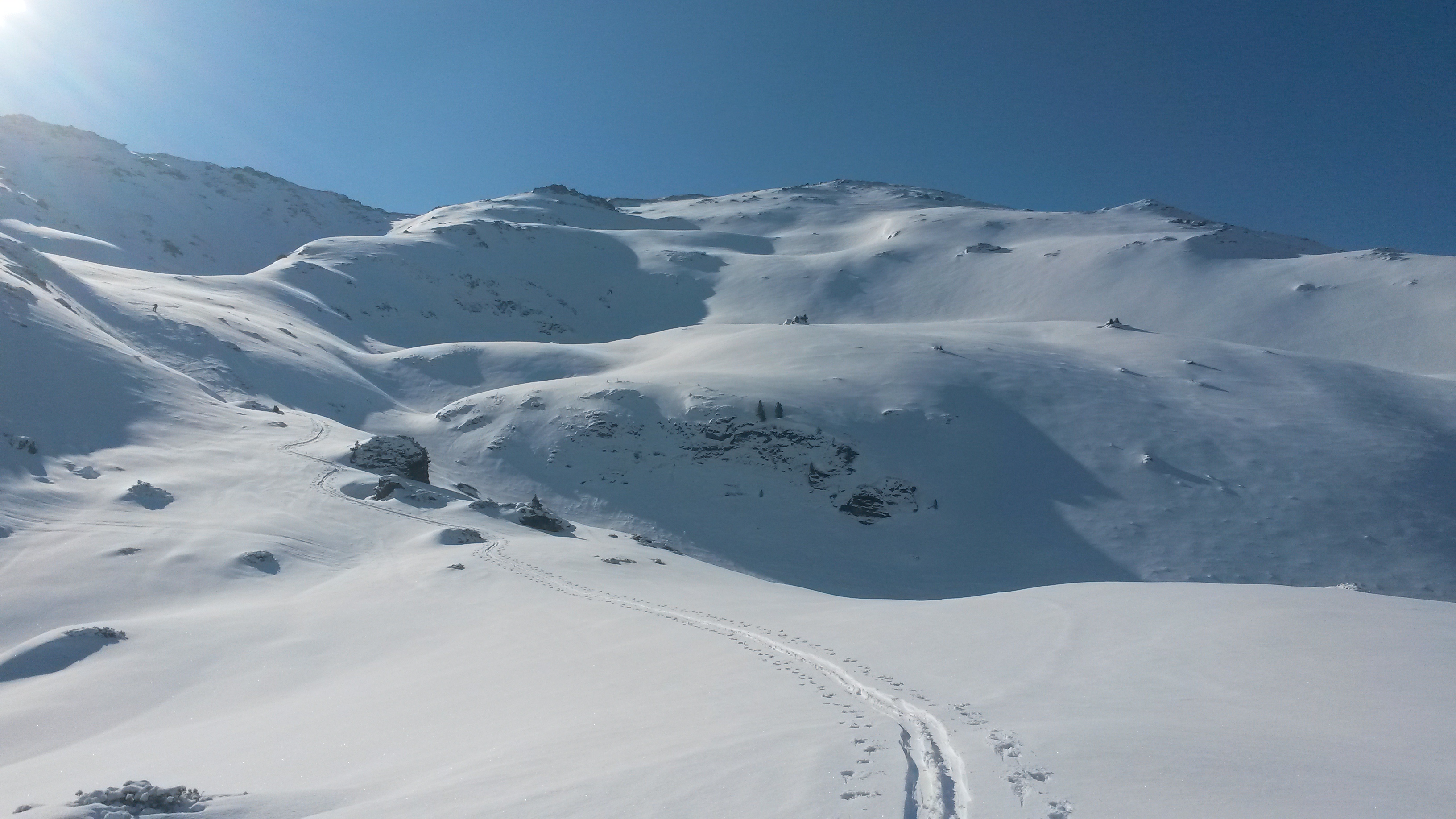Gefahreneinschätzung: im gipfelkar grosse rutsche .die wenigen steilen triebschneestellen meiden.abfahrt über Aufstiegsspur no risk
