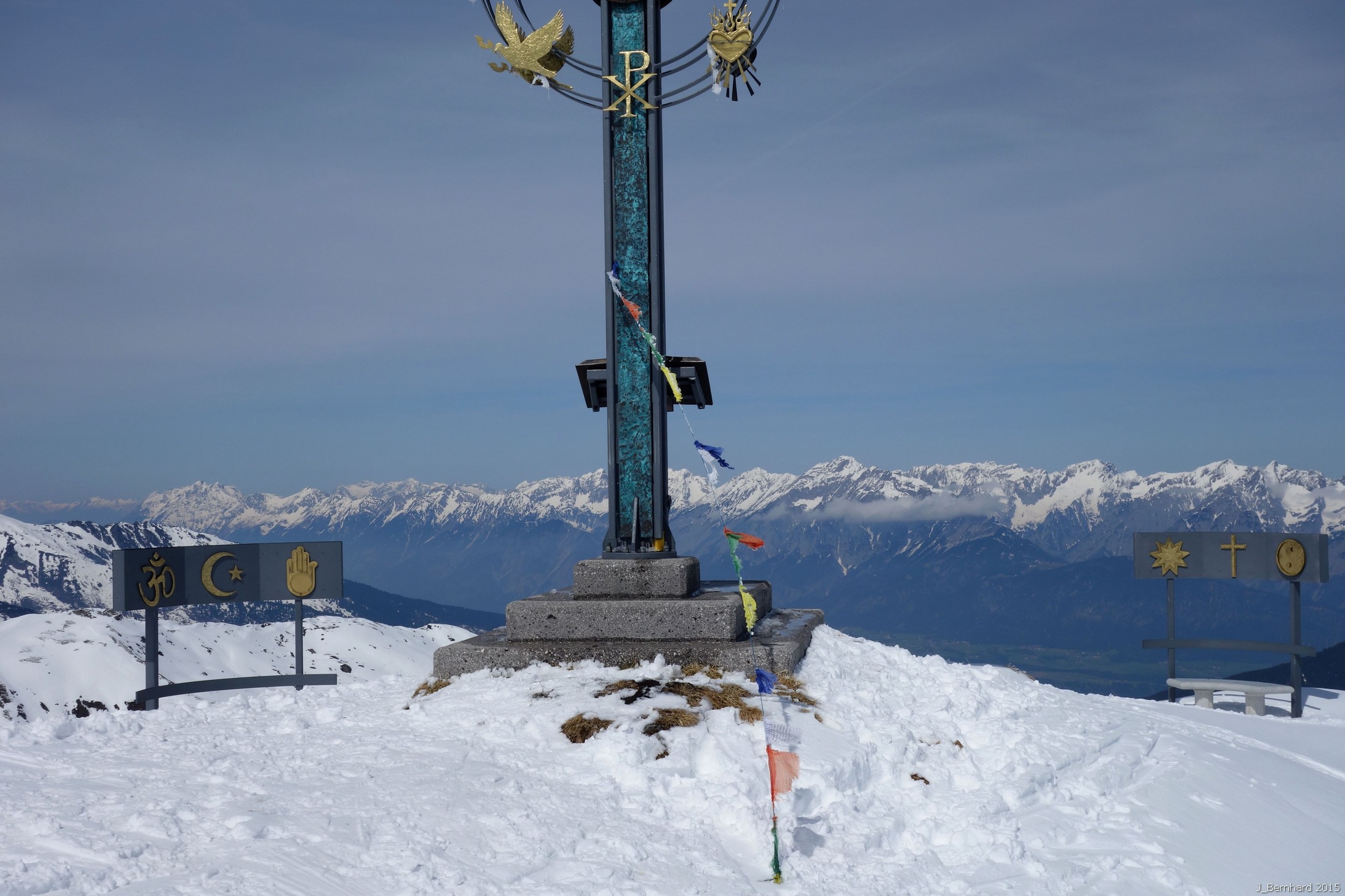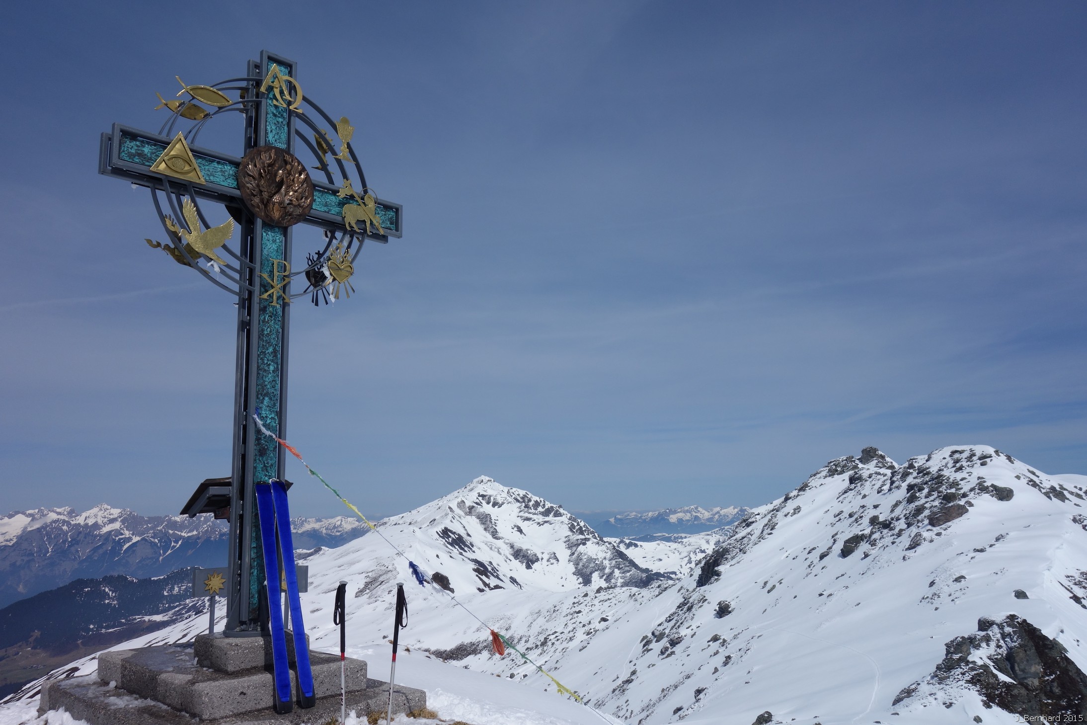 Aufstieg über die einsamen Pisten in südwestlicher Richtung über die Lamarkalm bis zur Bergstation des 4er-Sessellifts 2313m (100 Hm unter dem Pfaffenbühel). Dann leicht fallende Querung auf der Westseite des Pfaffenbühel und Anstieg über kupiertes Gelände auf den Grat. Zuletzt steiler auf den Gipfel des Kleine Gilfert mit seinem schön gestaltetem Gipfelkreuz und den Symbolen für die Weltreligionen.
