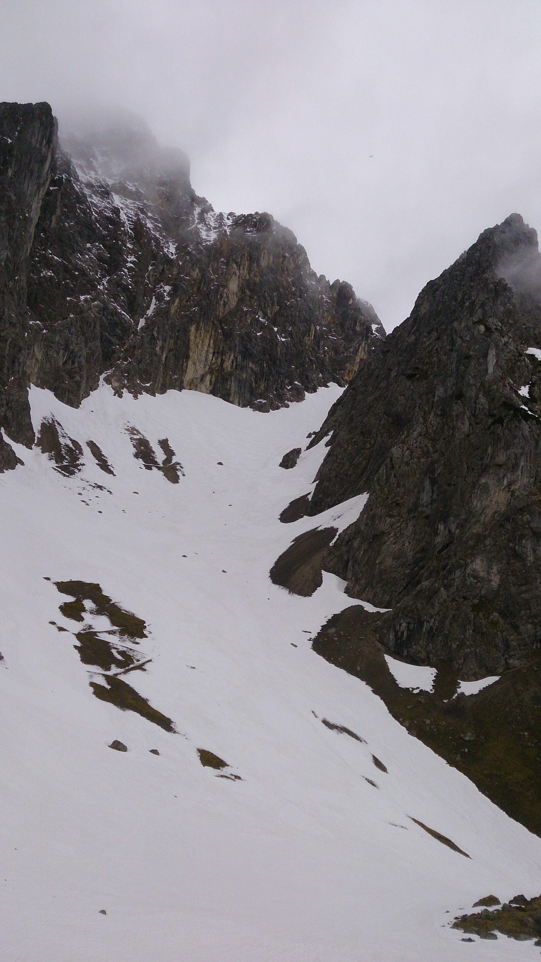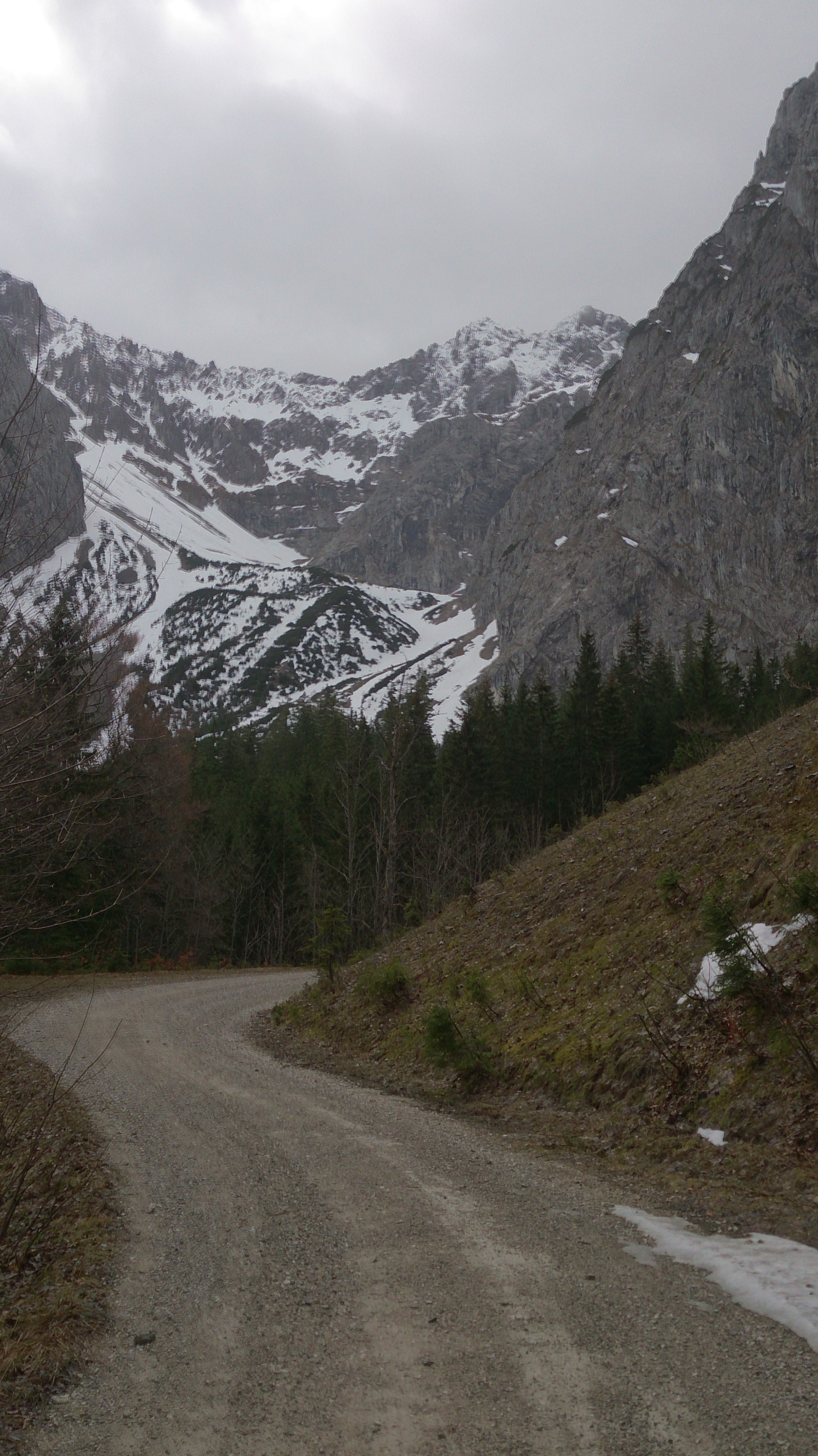 Die Abfahrt oben bot feuchten Neuschnee, dann noch annehmbar tiefen Altschnee (lange Brettl wären hier sicherlich von Vorteil) und im Kanonenrohr dann fast schon Sommerschnee. Nur unten wird es dünn mit der Schneelage und einige Male erwischt man schon Steine wegen der dünnen, nicht immer tragenden Schneedecke. Es ging noch bis hinters Bankerl mit Skiern hinunter (ca. 1.280 m). Das Vordere Dammkar wurde auch gemacht und sah auch gut aus, vielleicht heute sogar besser, da weitgehend unter der Neuschneegrenze.
