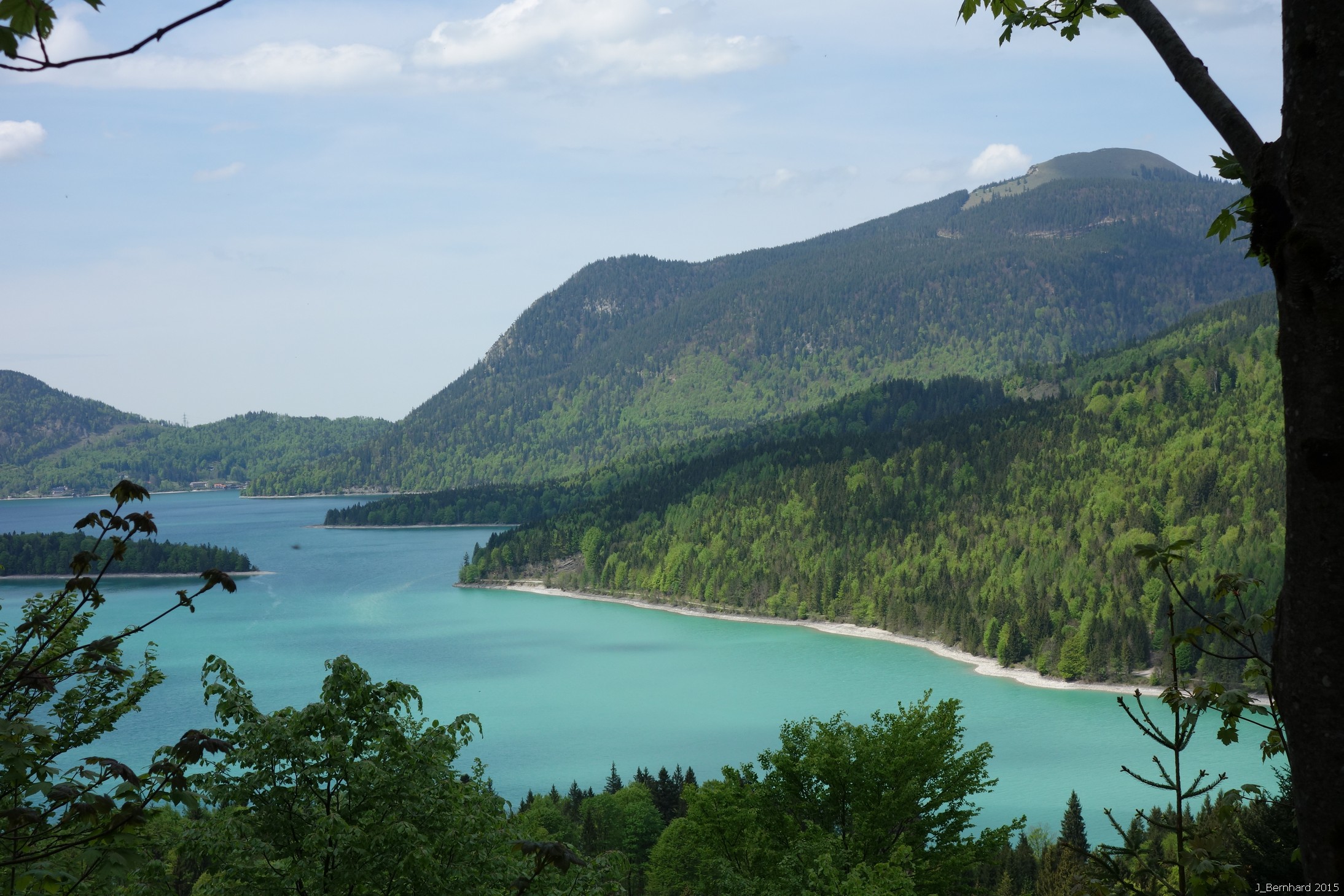 Auf gleichem Weg zum Radldepot zurück und weiter auf dem Forstweg 490 an der Lainer Alm vorbei bis unter die Luitpolder Alm. Vor der Alm rechts halten und auf der Forststraße bis zur großen Abzweigung (Wegweiser Galgenwurfsattel) mit wenig Anstieg fahren. Weiter in südlicher Richtung auf guter Forststraße bis auf einen Sattel, dort den roten Pfeilen nach rechts (Westen) auf einem Waldweg folgen. Über eine steile Rampe nach Westen auf den Rücken mit dem Galgenwurfköpfl und auf guter Forststraße abwärts in den Galgenwurfsattel. Vom Sattel nach Norden über eine kurzen Trail auf die breite Forststraße und teilweise steil hinab zum Walchensee-Südufer nach Niedernach. Von Niedernach am Uferweg nach Sachenbach. Von Sachenbach der kleinen Teerstraße nach Osten leicht ansteigend folgen und über die Fieberkapelle durch den Wald nach Berg (Ortsteil von Jachenau) radeln.