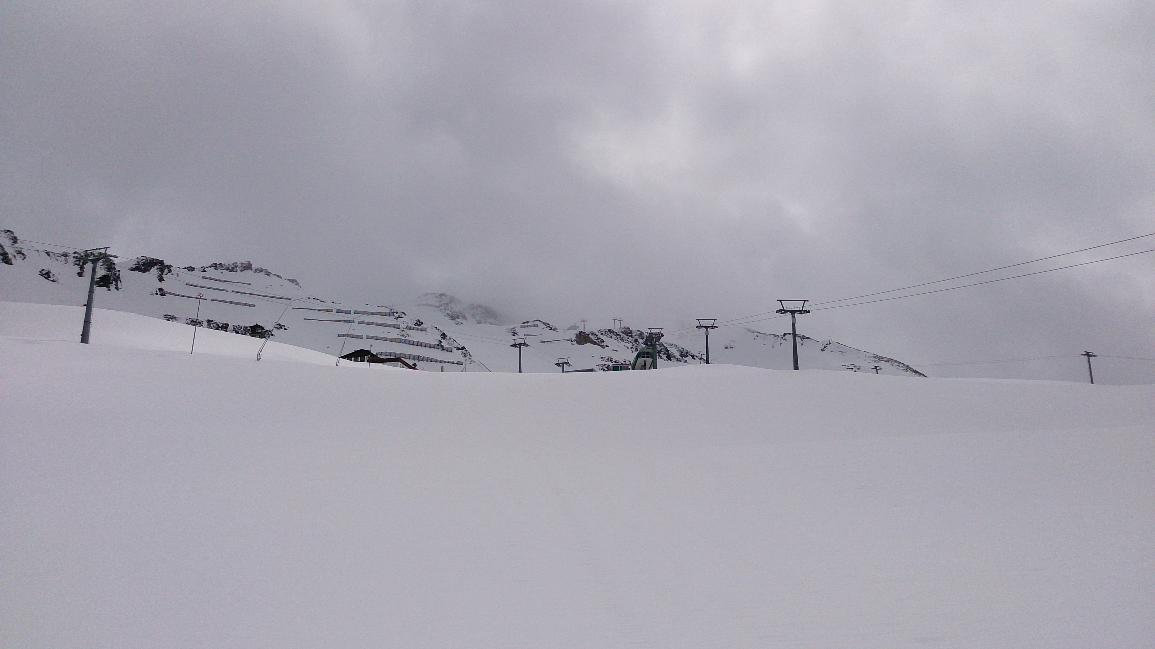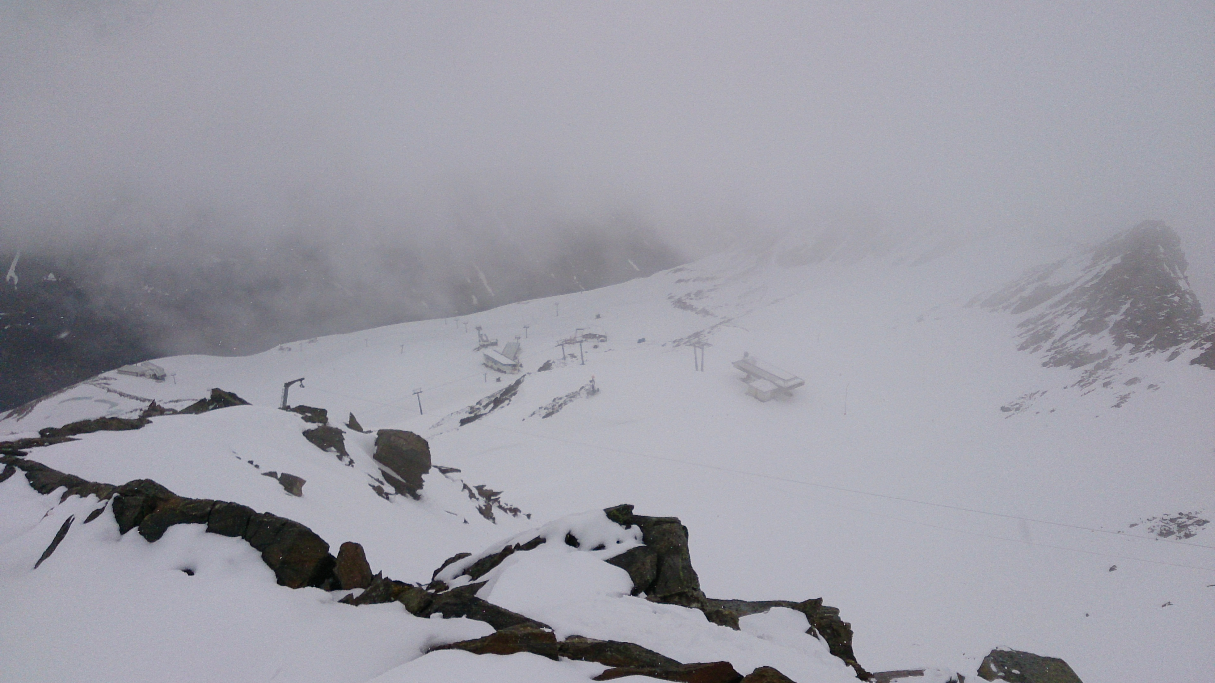 Sonstiges: Angesichts einer bedeckten und warmen Nacht sowie angekündigten Regens unter Tag erschien mir heute eine Tour im verwaisten Pistengebiet am sinnvollsten. Im fast vollständig ausgestorbenen Obergurgl geht es noch ohne Skitragen, nur 20 Hm am Anfang, dann mit Skiern bis zum Gipfel. Ab der Bergstation des letzten Lifts ist es steiler, man könnte auch auf den Westkamm ausweichen. Bei Aufstieg über den Gipfelhang oben am besten in der rechten Rinne halten. Statt eines Gipfelkreuzs gibt es leider eine Mobilfunkantenne. Der Nebengipfel mit Steinmann erschien mir noch etwas höher, also noch hinüber dorthin. Heute leider kaum Fernsicht, auf knapp 2.800 m hingen durchgehend dichte Wolken. Bei der Abfahrt dann auch noch Nebel, man musste sich oben etwas hinuntertasten. Die ersten Meter hat es leider einige Steine, die man durch den Neuschnee nicht sieht. Ansonsten alles gut, im mittleren Bereich an der Flachstelle mit dem Neuschnee heute zu schieben. Unten heraus bester Pistenfirn. Habe dann noch zur "Schneewolke" bei der Bergstation Hohe-Mut-Bahn I geschaut, dort auch Pistenfirn.