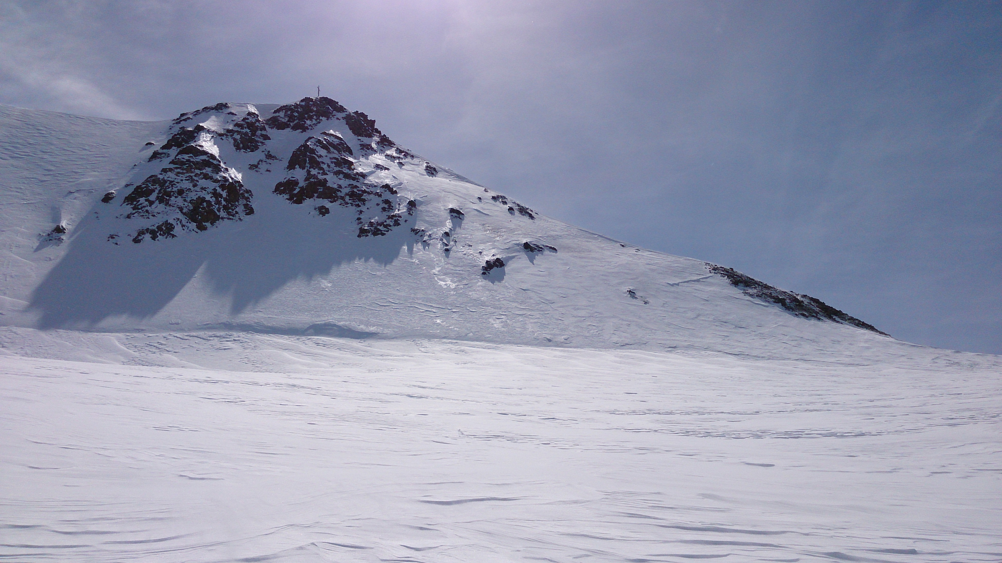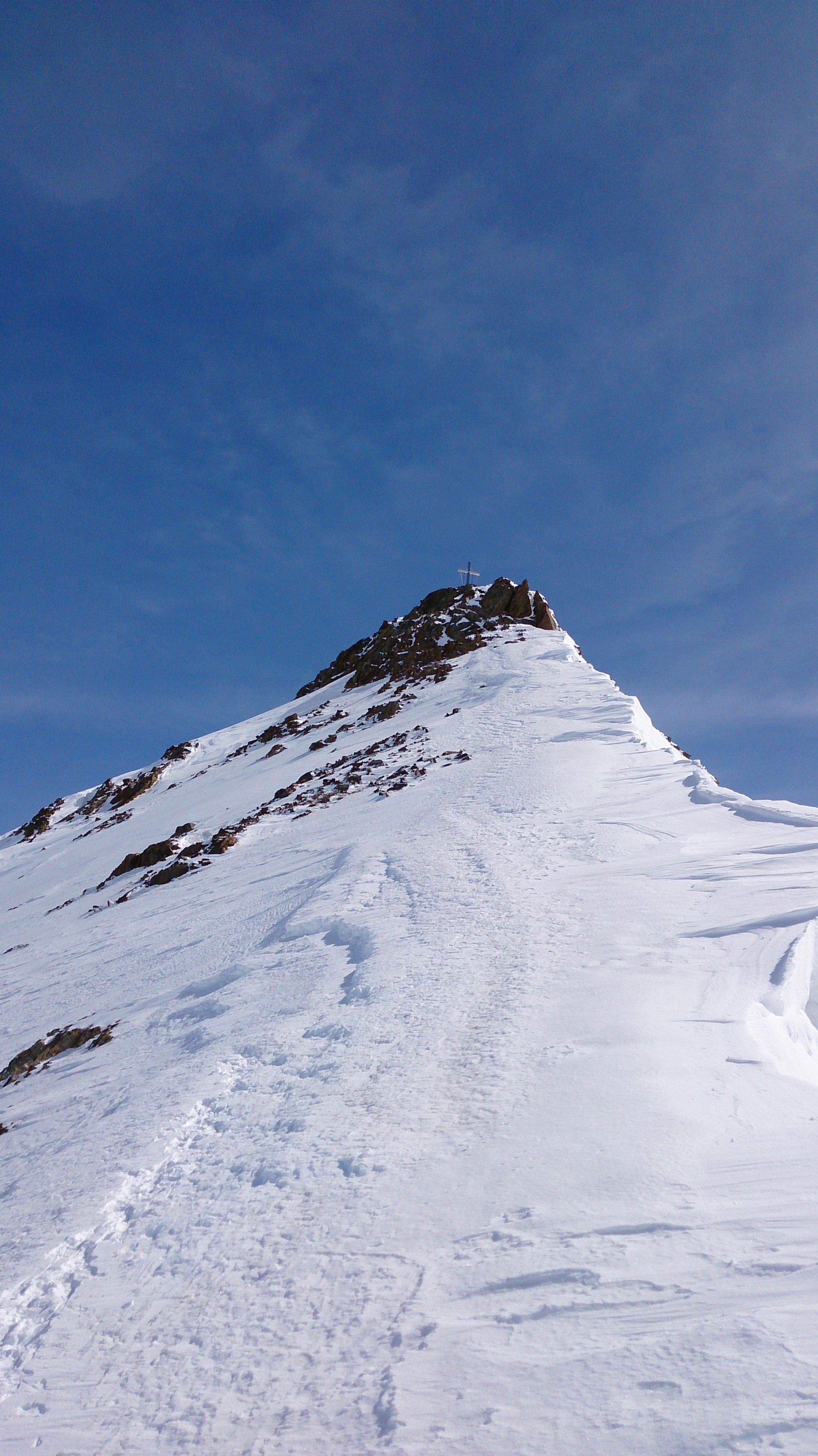 Da ich mich wie gesagt kurzfristig zu Höherem berufen fühlte, hatte ich natürlich Steigeisen und Pickel nicht dabei. Die sollte man aber doch unbedingt (ebenso wie Harscheisen, für den letzten Hang zum oberen Skidepot, oder unteres Skidepot wählen) mitnehmen. Sehr vorsichtig taste ich mich also den Schneegrat hoch - nicht zu weit rechts, da dort zwar weicher Schnee, aber auf der Wächte. Die Klettermetter am Gipfelaufbau fand ich auch mit Skischuhen kein Problem (I), ein bißchen ausgesetzt. Der Gipfel bot beim gestrigen Kaiserwetter natürlich eine grandiose Aussicht, die ich aber nicht so sehr lange genießen konnte, da ein kalter Wind wehte. Also wieder (noch vorsichtiger) runter, bevor der große Ansturm kam. Einige haben auch die Skier mit hoch genommen und sind vom Sattel zwischen Süd- und Nordgipfel herunter (scheinbar harter Schnee), vielleicht für steigeisenlose die sichere Variante.