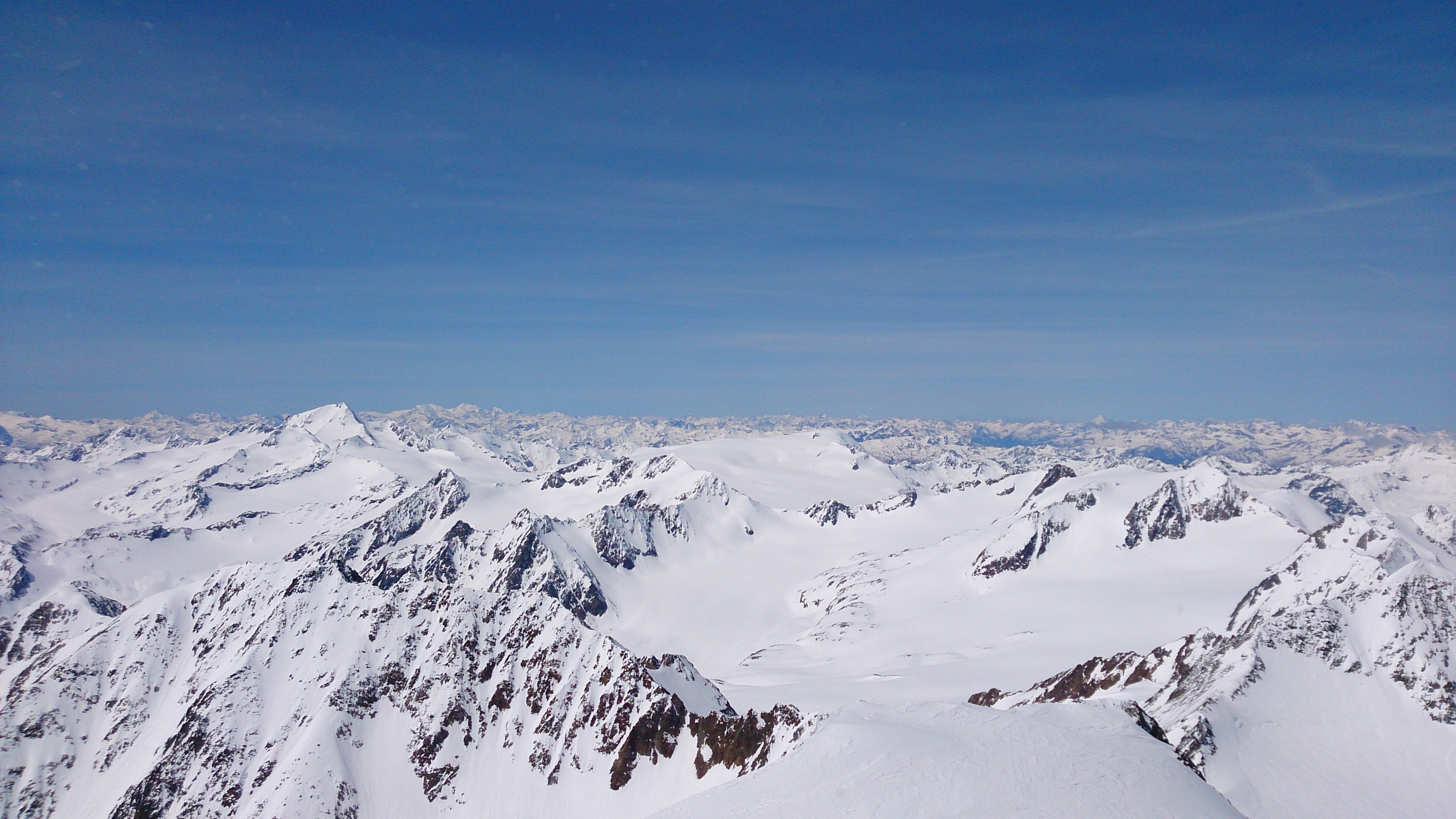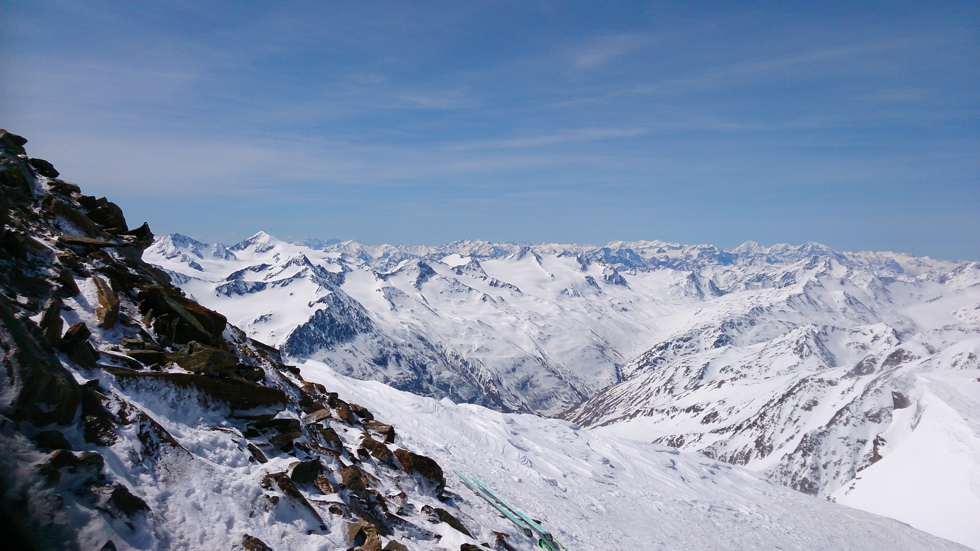 Ziemlich schwer verständlich für mich: Die große Zahl an Begeher, die bereits mit der kurzen Skiabfahrt vom Mittelbergjoch hinab zum Ferner leicht überfordert sind (offenbar keine Tiefschneeerfahrung). Geführt von einem Bergführer für teilweise 8 Leute. Am sehr steilen Gipfelgrat dann ohne Fixpunktsicherung mit mehreren Leuten am kurzen Seil - ob das wirklich sicherer ist als ohne Seil zu gehen? Es erschien mir teilweise, als ob ich ohne Steigeisen sicherer gehe als diese mit, an der Felspassage (kein Drahtseil o.ä.!) prompt Staus.