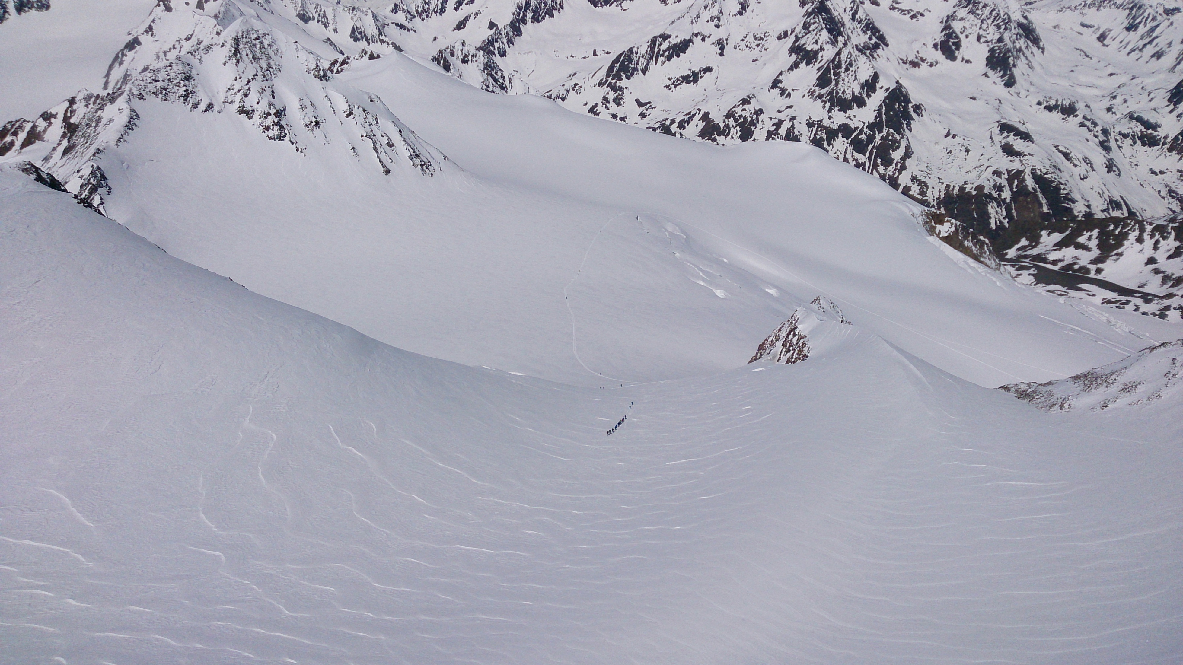 Prognose: geht noch lange, allerdings hatten die Pitztaler Gletscherbahnen gestern letzten Betriebstag der Wintersaison - ohne Liftbenützung wäre es schon recht lang durch das Taschachtal oder über den "Notweg" und den Mittelbergferner (vielleicht besser mit Kurzski von Vent? - heute scheinbar auch eine oder zwei Seilschaften von dort)