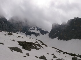 Die Abfahrt aus der Scharte (zum Hinteren Drachenkopf sieht es nach sehr anspruchsvoller Kletterei mindestens im IIIer-Gelände bei ziemlicher Brüchigkeit aus) war am Nachmittag oben recht weich und tief, aber gut machbar. Je tiefer man kam, um so besser wurde der Sommerschnee. Insbesondere zum Drachensee war es ideal. Der Rest (Ski / Fuß) wie Aufstieg.