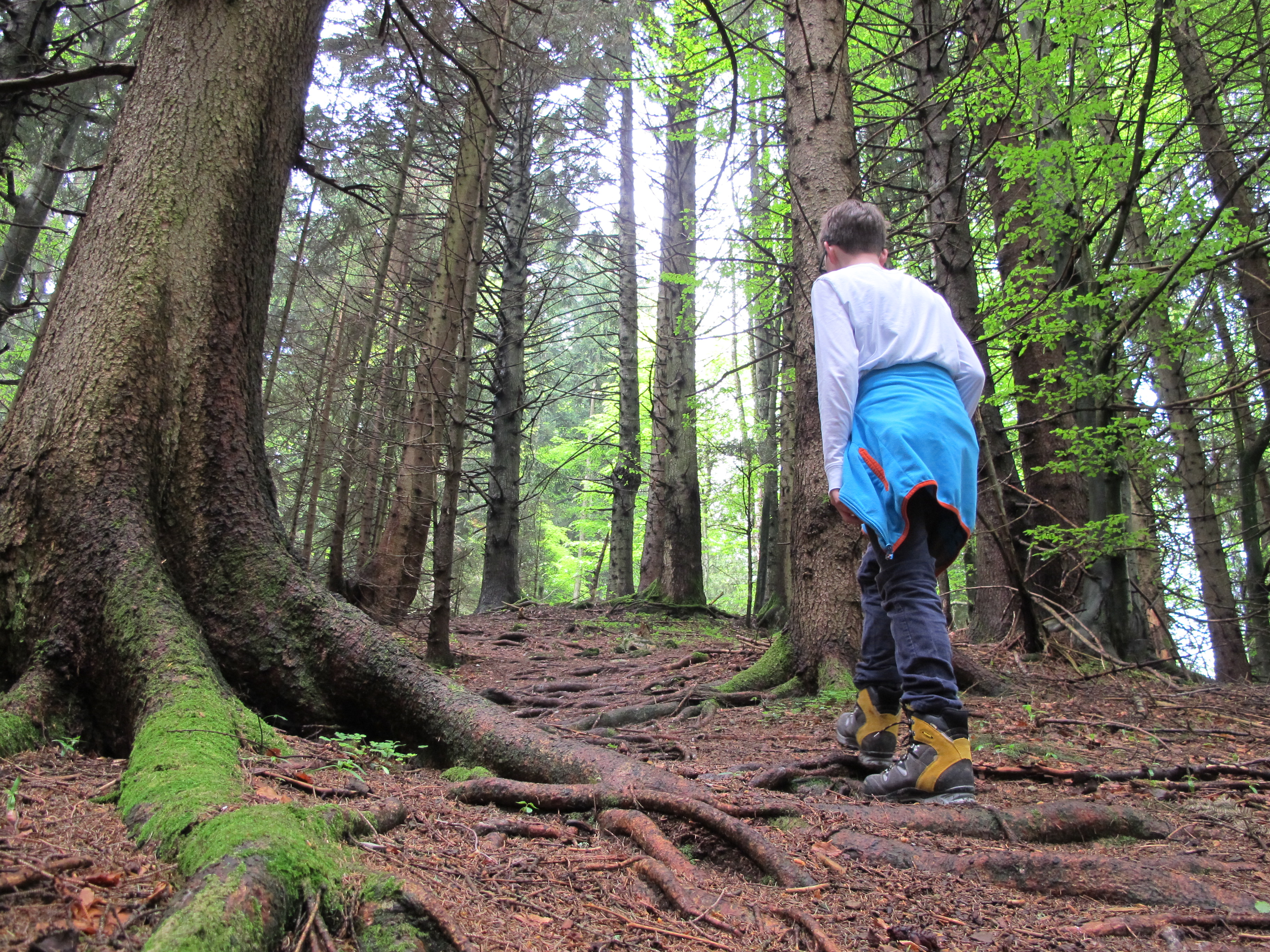 Tourenverhältnisse: Gut, nur kurz unterm Gipfel etwas batzing und rutschig. Die Überschreitung des kleinen Gipfels ist völlig einsam, die meisten gehen direkt zur Denkalm, und die ist natürlich auch einen Besuch wert. Schöne schattige Waldtour!