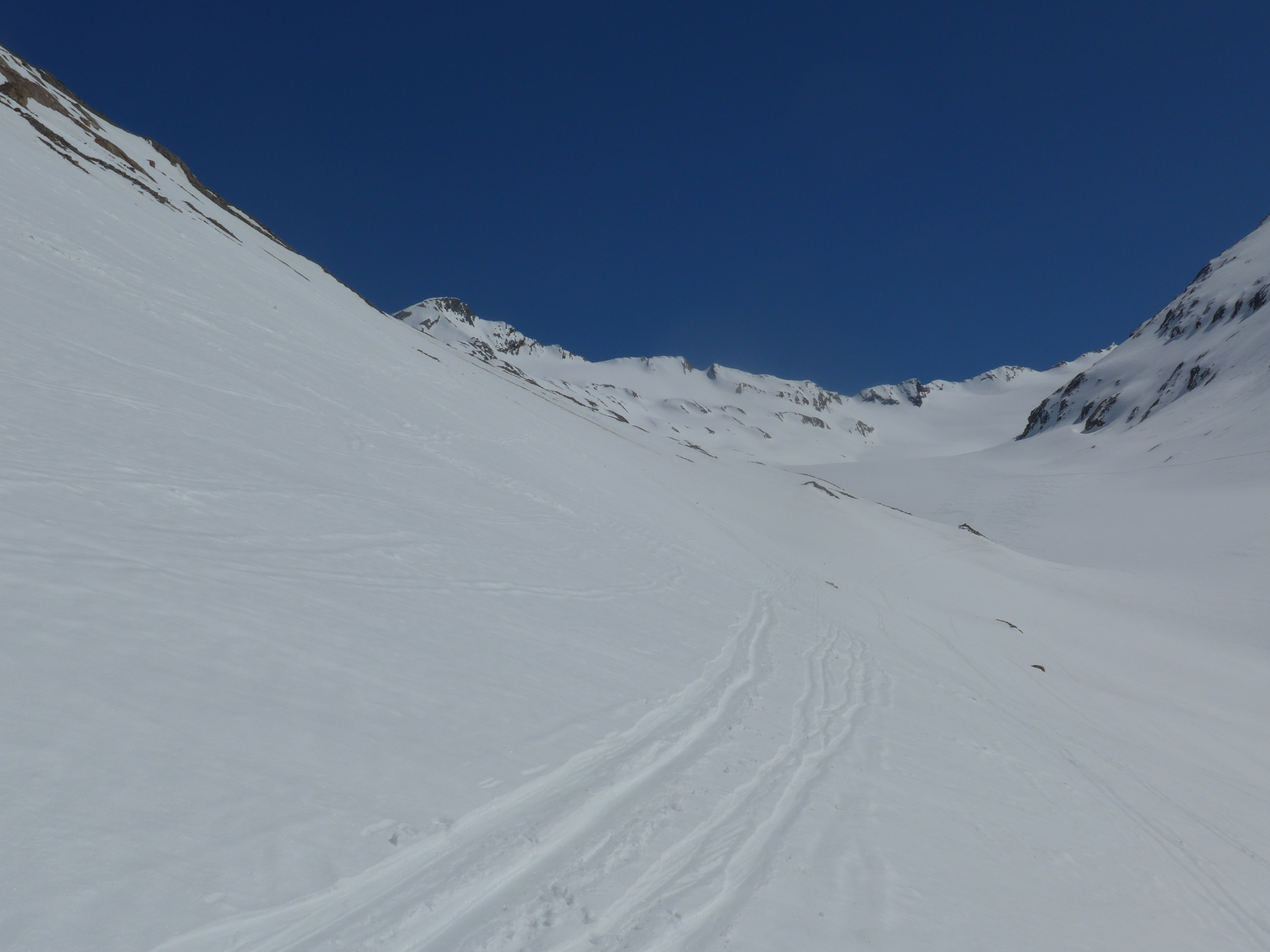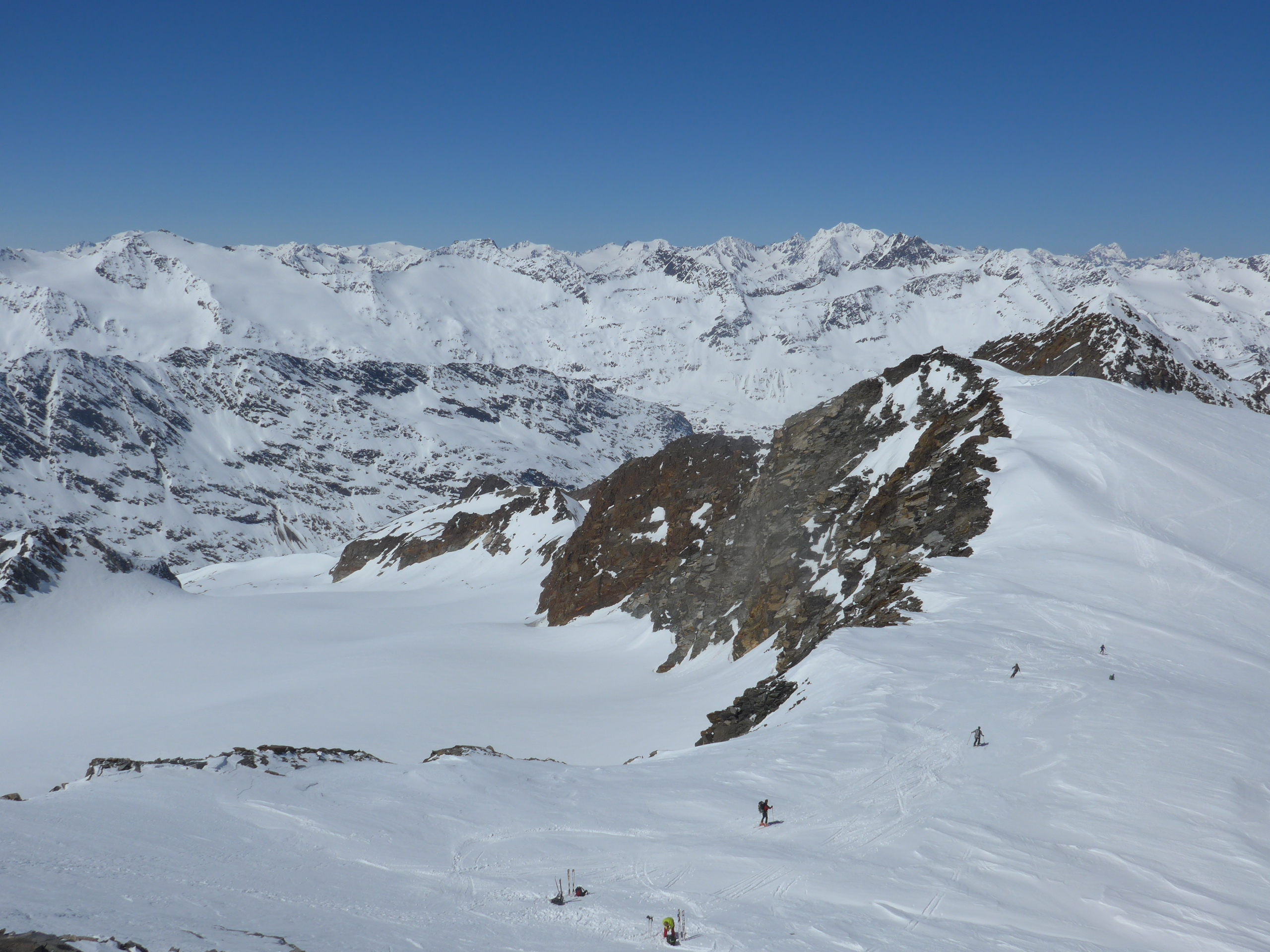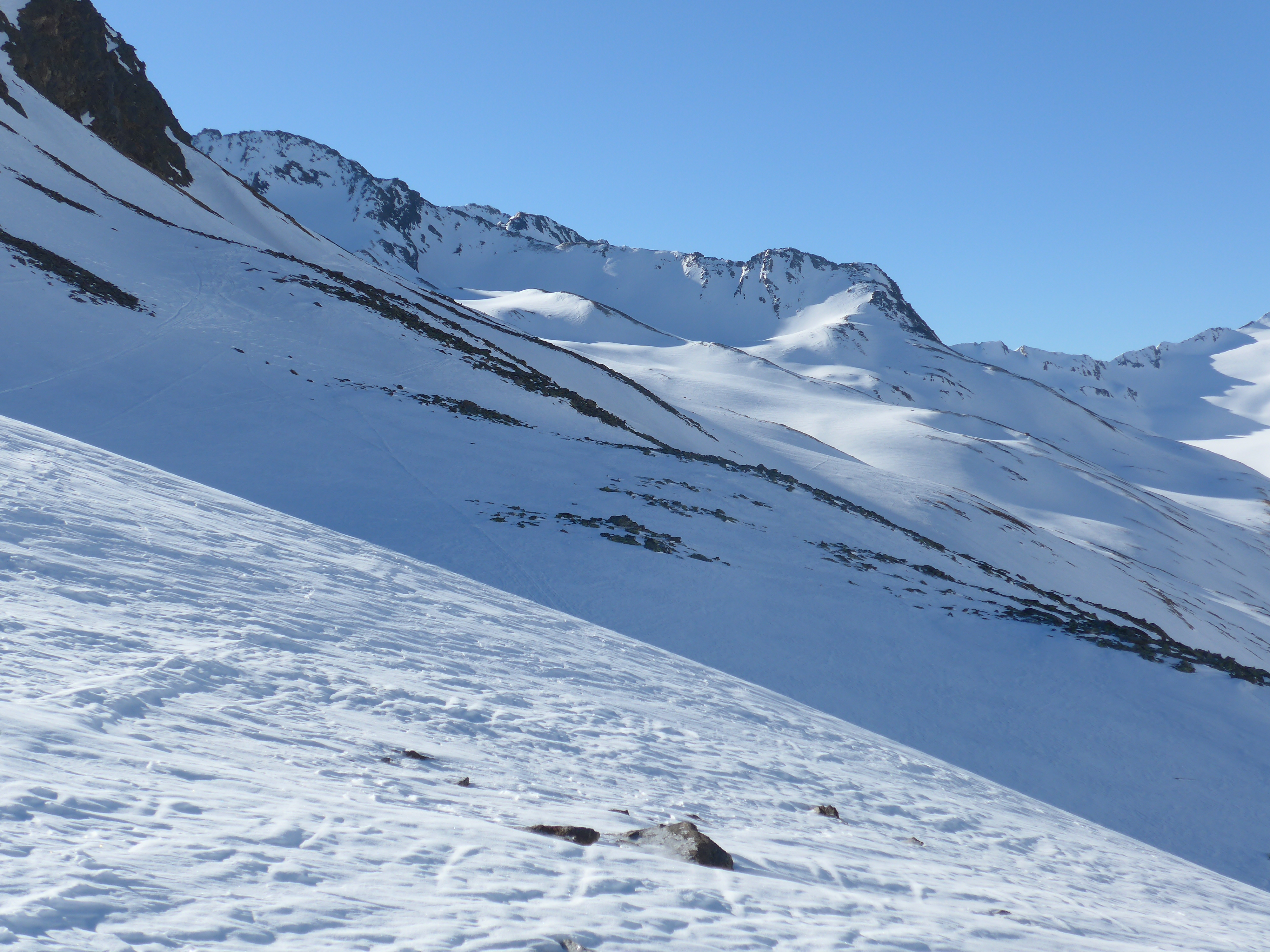 Tourenverhältnisse: kalt genug für sichere Verhältnisse, Steilhang am morgen hart gefroren, Harscheisen lohnen; lange Querung oberhalb des Langtals, teils ausgeapert, Gipfel mit Ski machbar, aber besser zu Fuß mit Steigeisen. Die Abfahrt gerade ins Langtal ging gut, da aufgefirnt.Weiter unten am Hangfuß schon sulzig ab 14:30 Uhr. Lange Schiebestrecke bei Hitze und Gegenanstieg im Sulz.