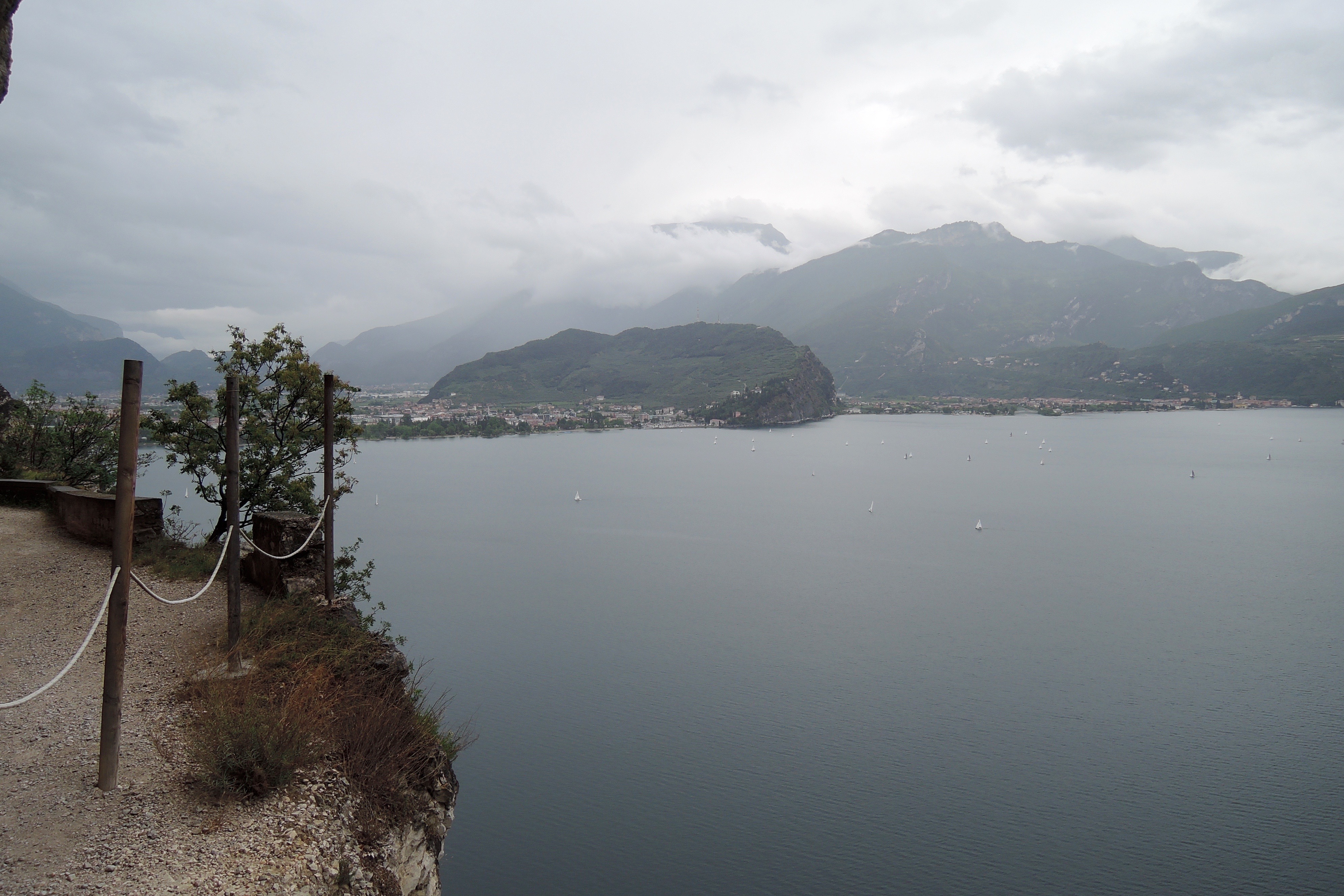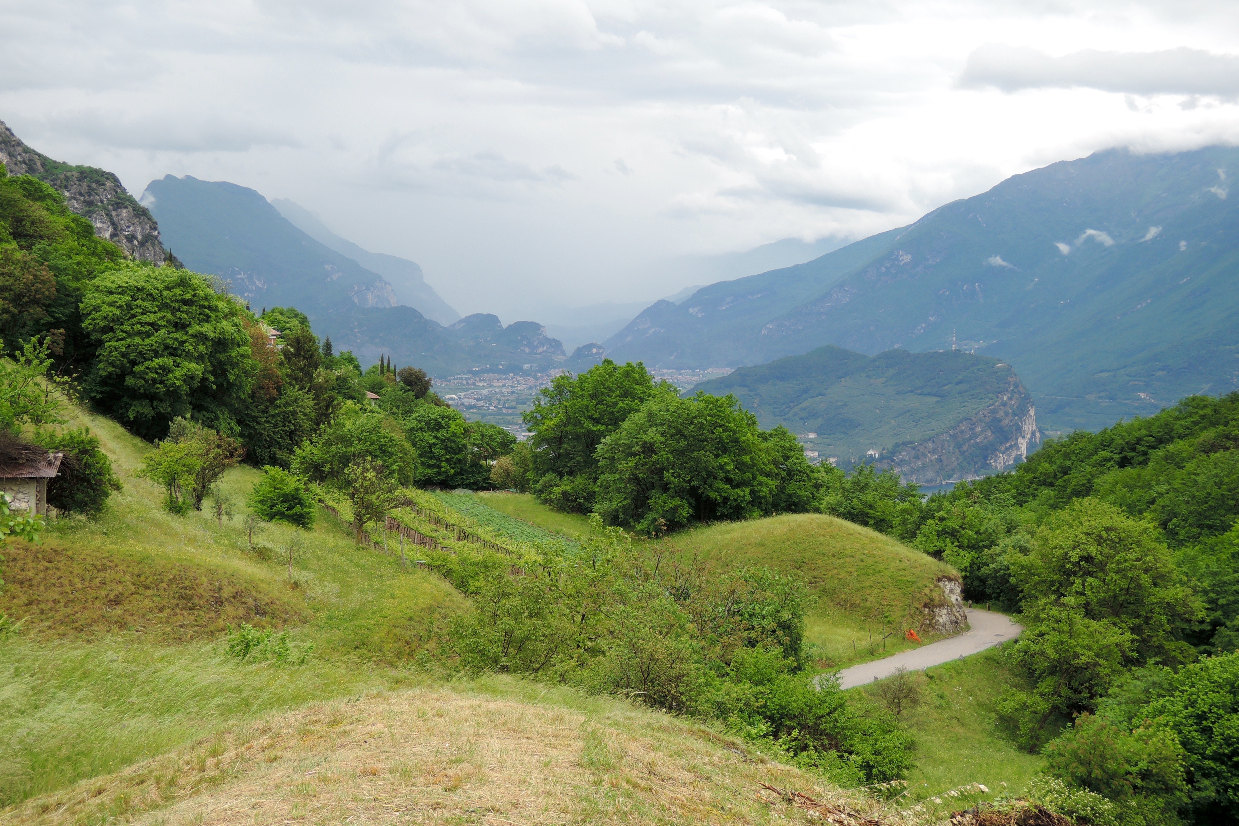 Sonstiges: vom Goetheplatz in Torbole (70m) auf dem Radweg nach Riva auf den Sentiero del Ponale (Alpiner Höhenweg D 01). Auf diesem anfangs unbefestigten Weg durch mehrere Tunnels das Nordufer des Gardasees entlang hinauf zum frisch renovierten Ponale Belvedere (220m). Weiter durch die Linkskehre und über einige Kehren hinauf zum Tunnelausgang der zum Ledrosee führenden Sp234. Hier links zum Aussichtspunkt Regina Mundi (400m). Auf dem Strässchen weiter, zuletzt in drei Kehren nach Pregasina (532m), einer Exklave von Riva, hinauf bis zum Café Panorama.