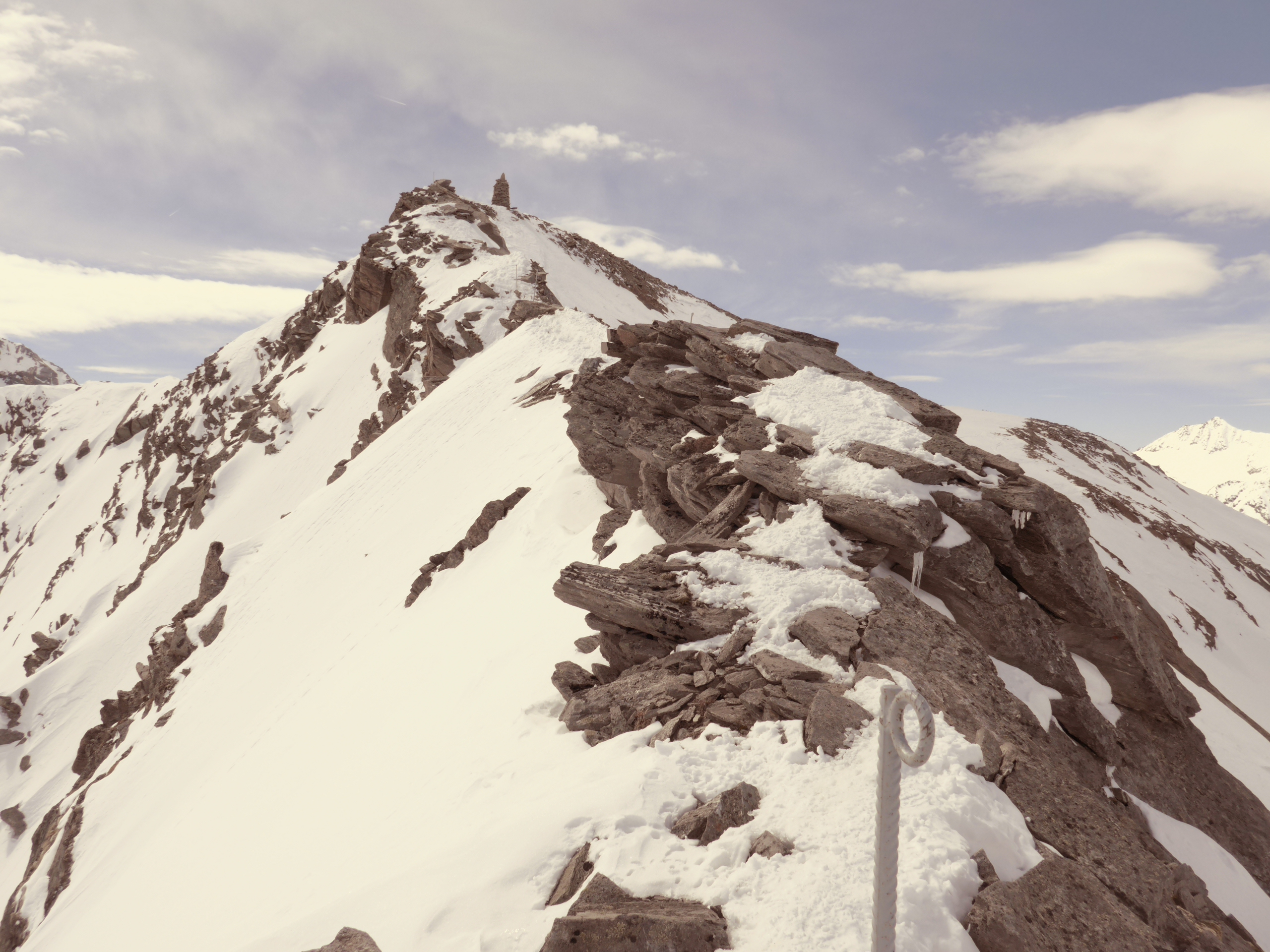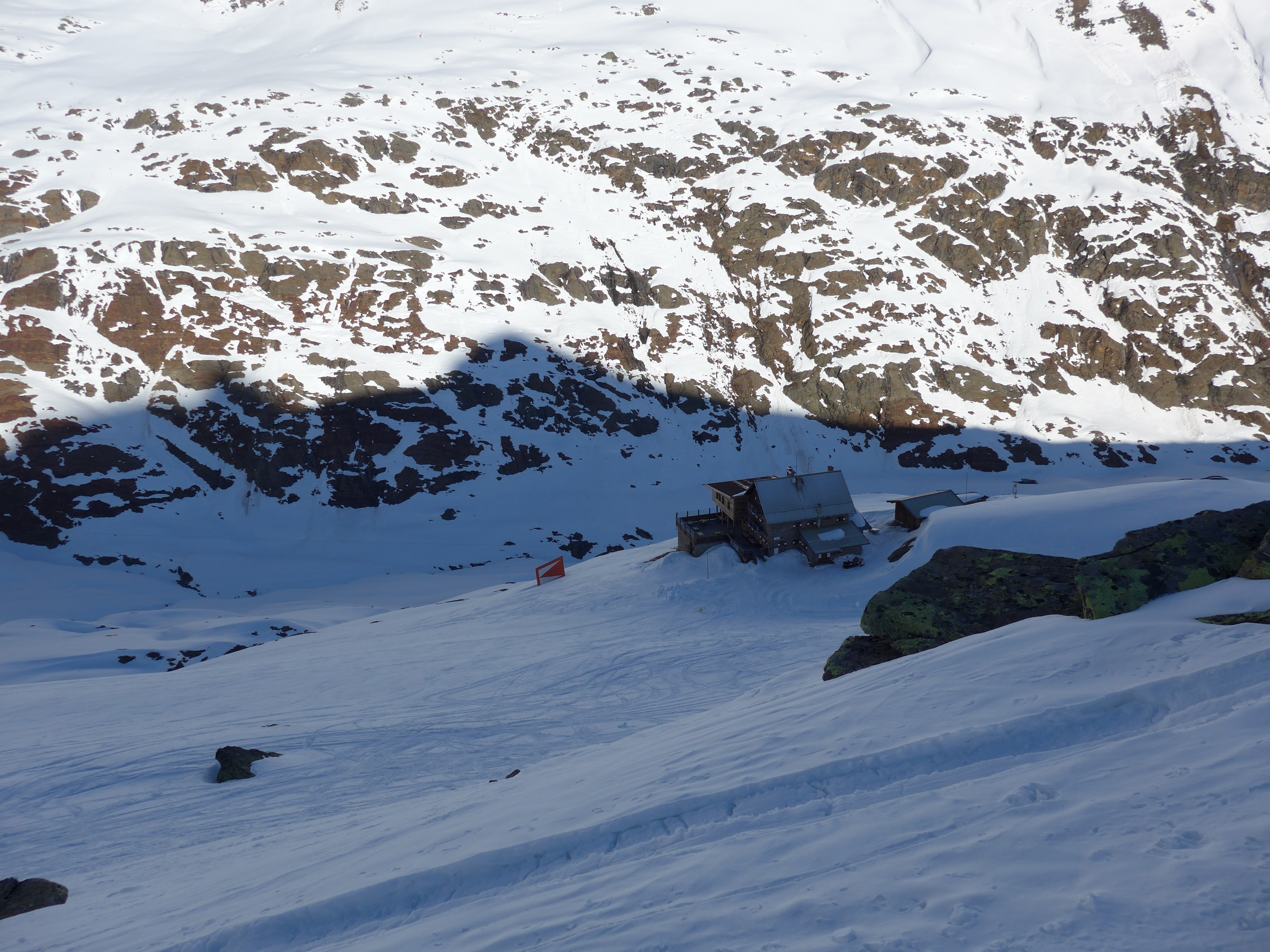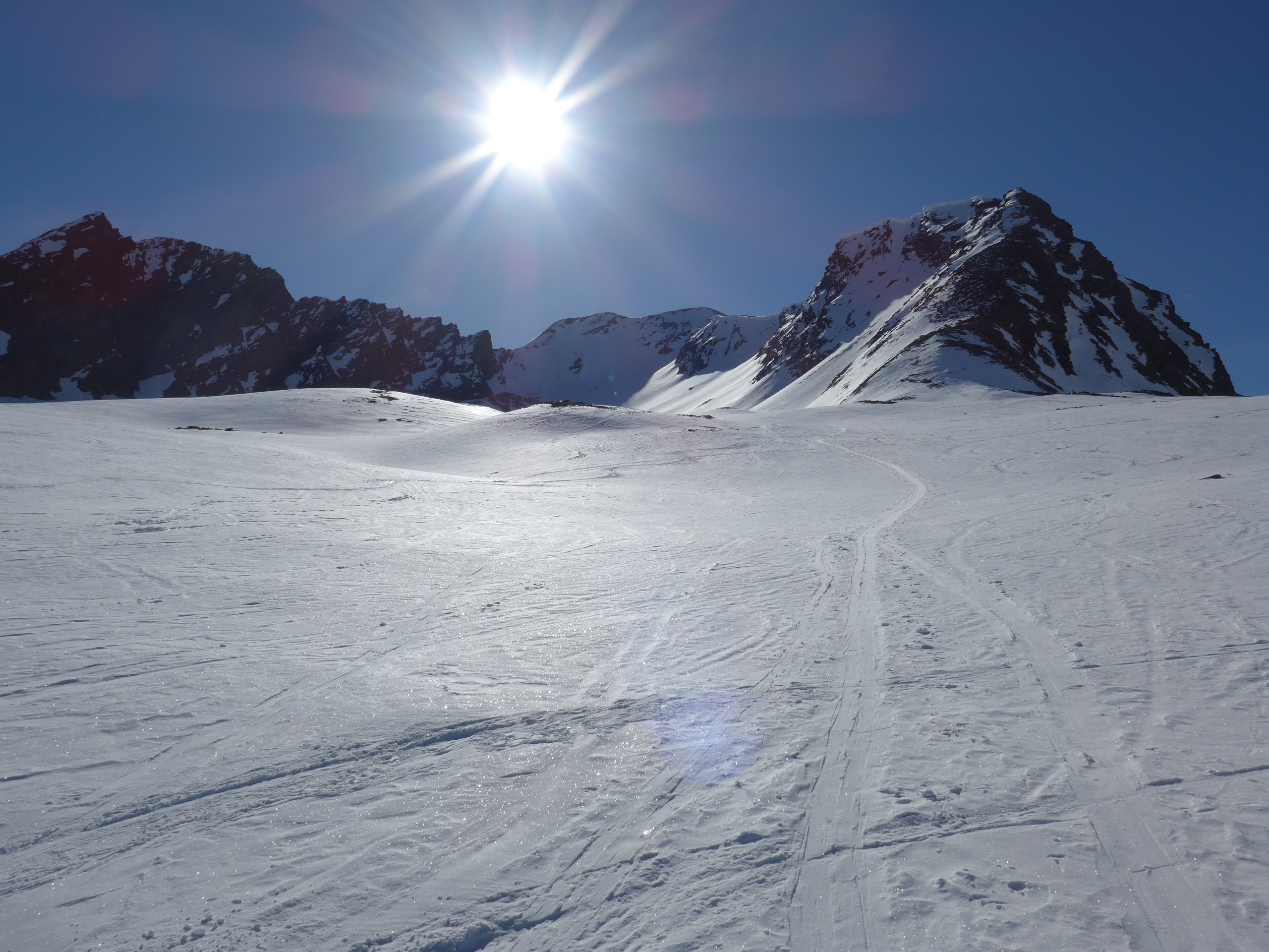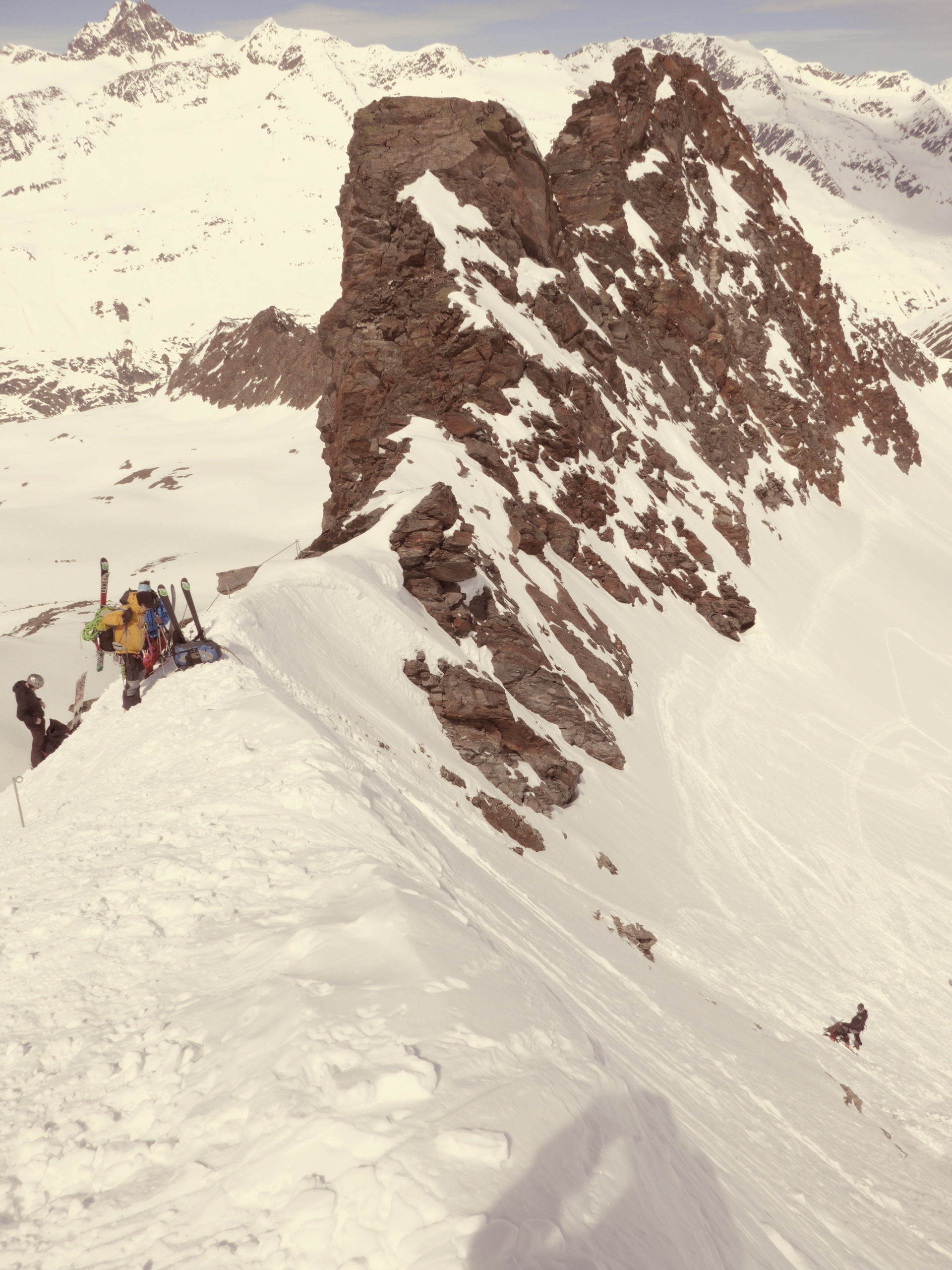 Tourenverhältnisse: Sehr gut insgesamt. Morgens recht kalt von der Hütte weg über den hart gefrorenen Steilhang hinauf Richtung Hochebenkar. Harscheisen waren angenehm. Dann flacher weiter über kleinen Hochebengletscher, Spalten gut zugeschneit bzw. gar nicht vorhanden, der Morgensonne entgegen. Steilhang zur schmalen Scharte bei harter Oberfläche nur mit Harscheisen, aber ohne Steighilfe eher mühsam. Skidepot in der kleinen Scharte und dann anfangs auf breiterem Rücken hinauf zum Grat mit Steigeisen und Pickel, über den teils ausgesetzten, aber flachen Grat auf Schnee, Eisresten und Fels auf eine Länge von ca. 100m zur Gipfelpyramide. Eine geführte Gruppe wurde an vorhandenen, einzementierten Stahlstangen gesichert. Toller Blick rundum, vor allem zu den nahen See´lenkögel. Die Seilsicherungen von der Scharte runter ins Rotmoostal waren eingeschneit, daher Abstieg zu Fuß mit Steigeisen, Steilhang ca. 45°, teils etwas eisig (alternativ kann an einer Stange abgeseilt, mit HMS abgelassen oder bei gutem Schnee abgefahren werden). Herrliche Abfahrt über Hangerer Ferner, Firn, keine Spaltengefahr. Letzter Steilhang über Lawinenreste ins Rotmoostal, eher links in Abfahrtsrichtung halten (sonst Schrofengelände). Nach einer Pause in der Schönwieshütte ging´s auf der mittlerweile durchweichten Skipiste nach Obergurgl.