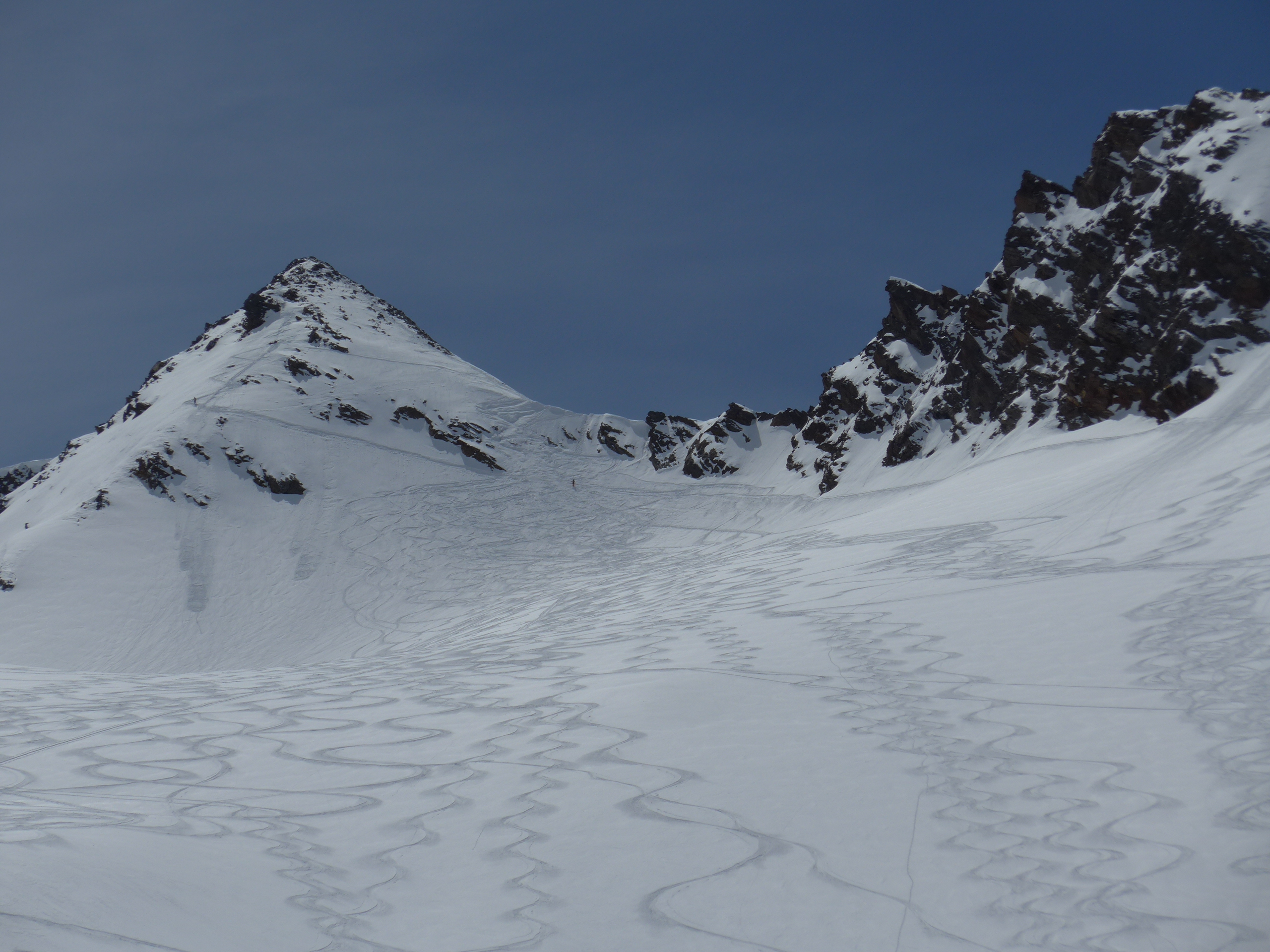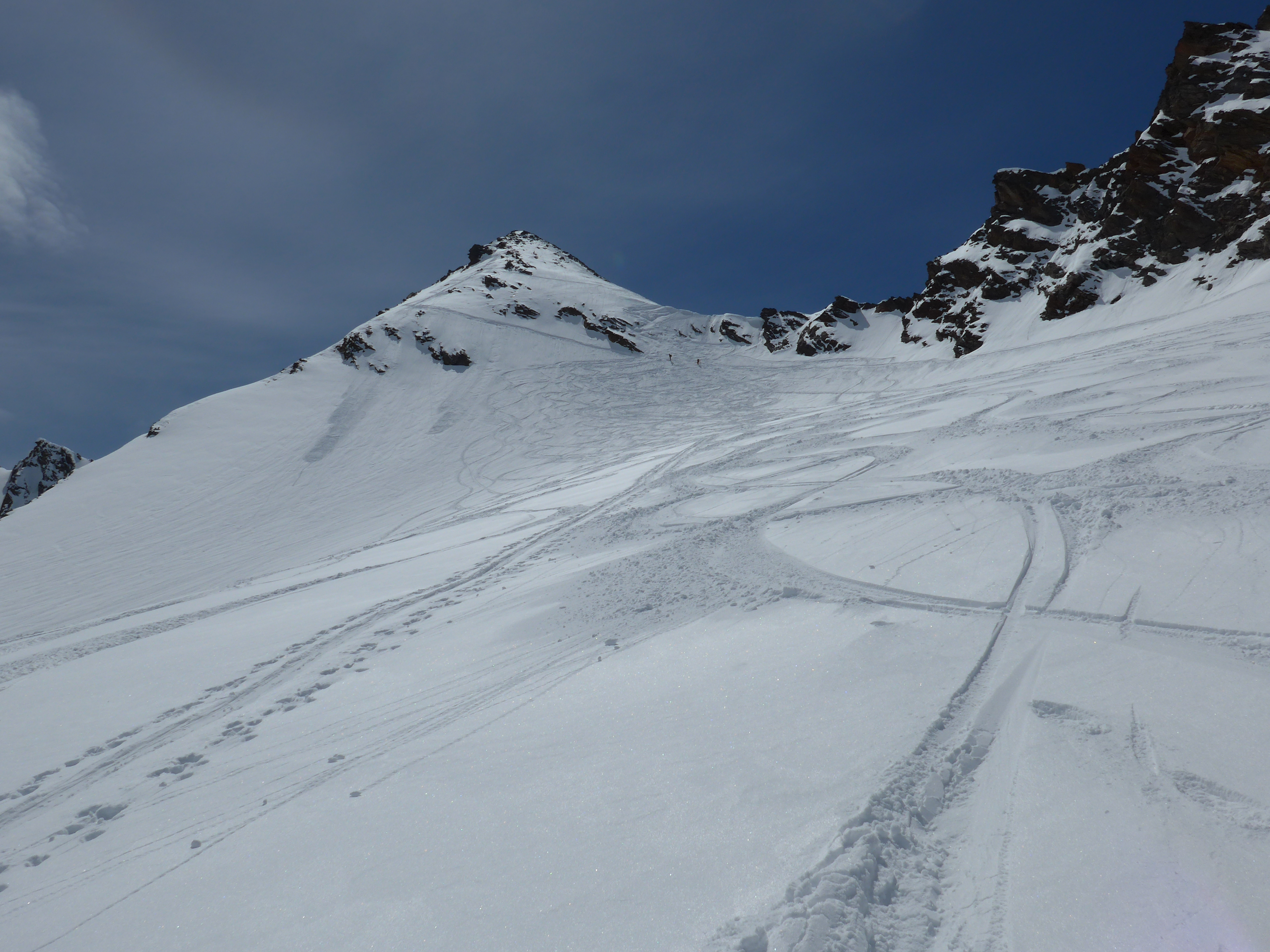 Sonstiges: ca. 800hm, 2,5km, 2,5 -3 Std von der Langtalereckhütte zum Gipfel. Lohnende Tour, wurde auch an diesem Tag, mit der Morgensonne im Rücken, in umgekehrter Richtung gemacht. Der Steilhang zur Scharte kann in linksseitiger Querung (in Gehrichtung) umgangen werden, aber heikel wegen Lawinengefährdung: steil trotz allem, Triebschnee, N-O