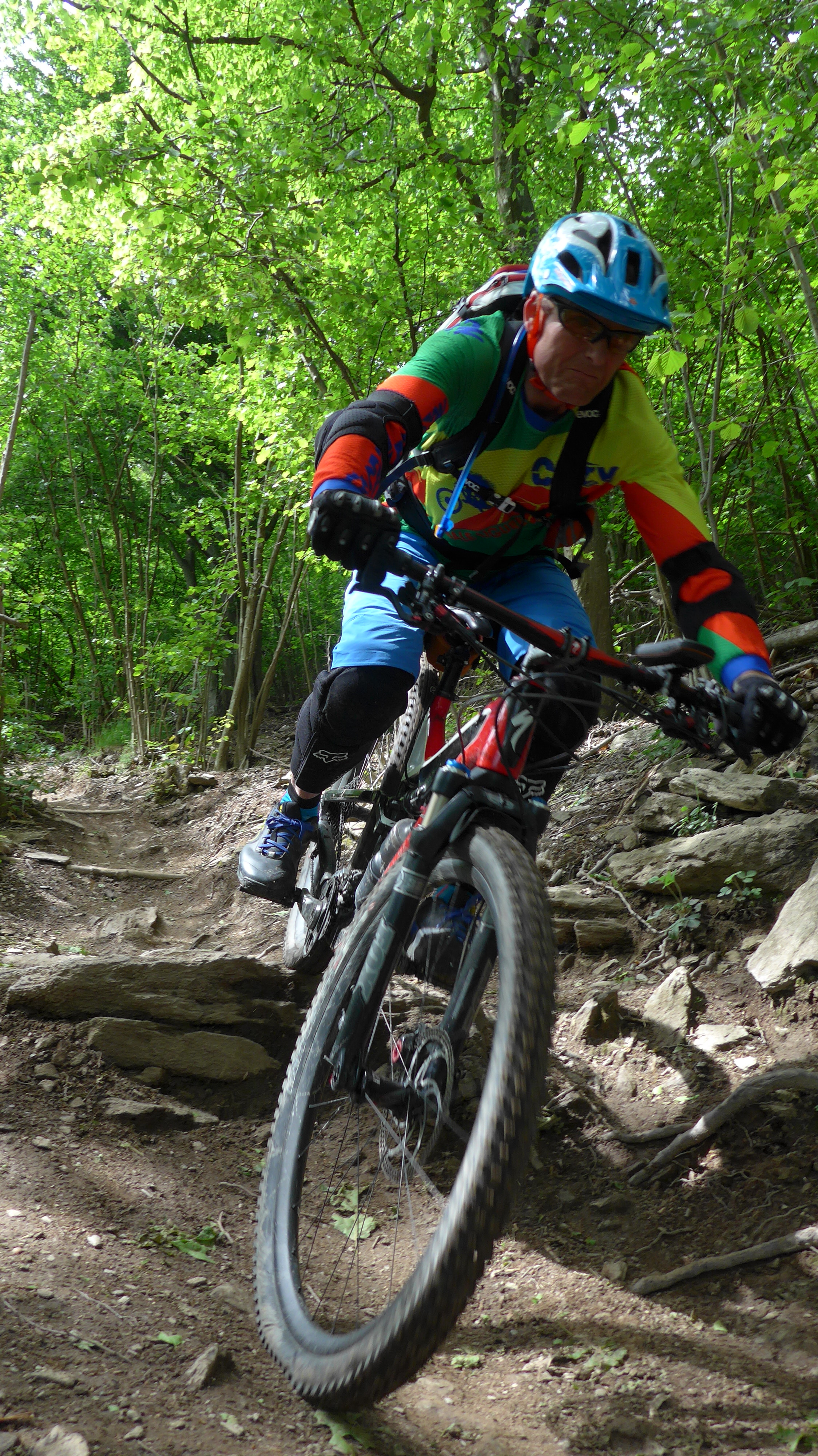 Auffahrt ungefähr hälftig Teer- + leicht trailige Forststraße. Cappucchino-Stopp am Wendepunkt. Nur sehr wenige Schlammpfützen auf dem sehr flowigen +abwechslungsreichen Trail. Hier trocknete es flux nach dem gestrigen halben Regentag ab.