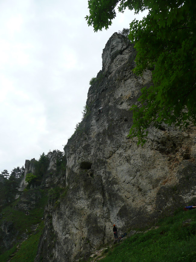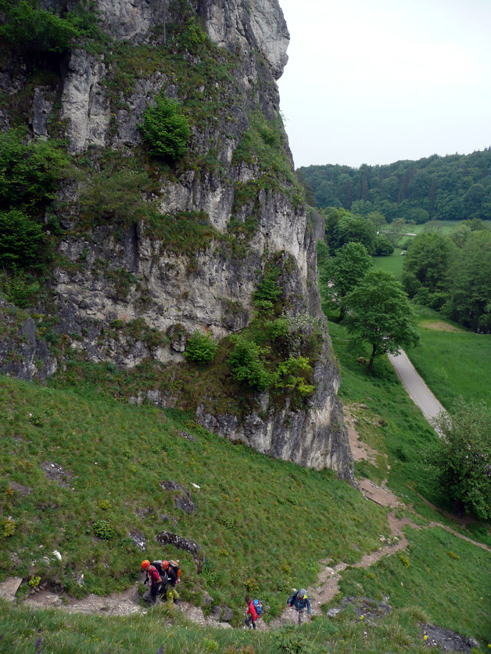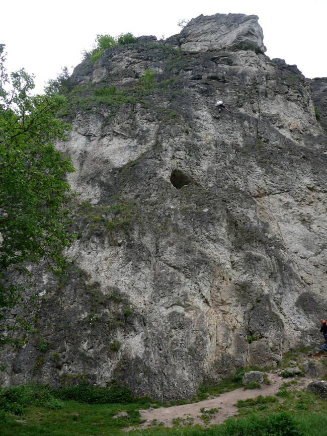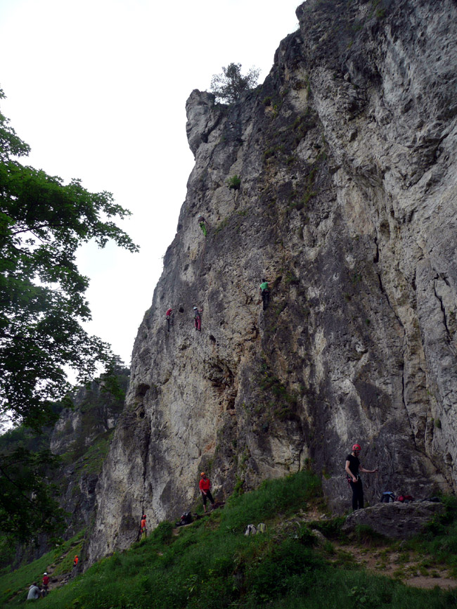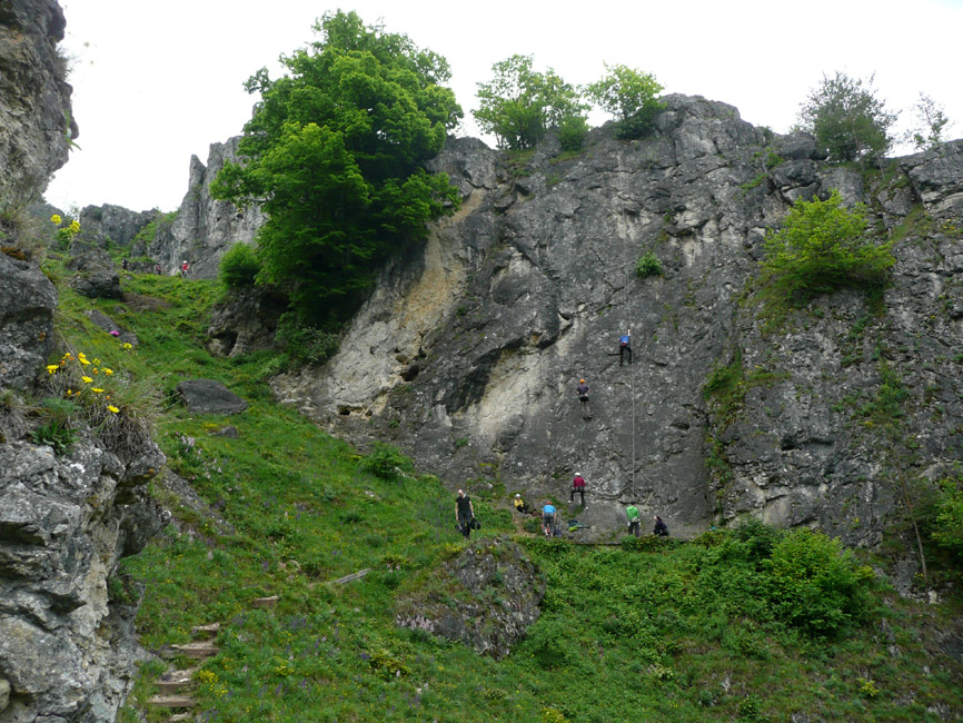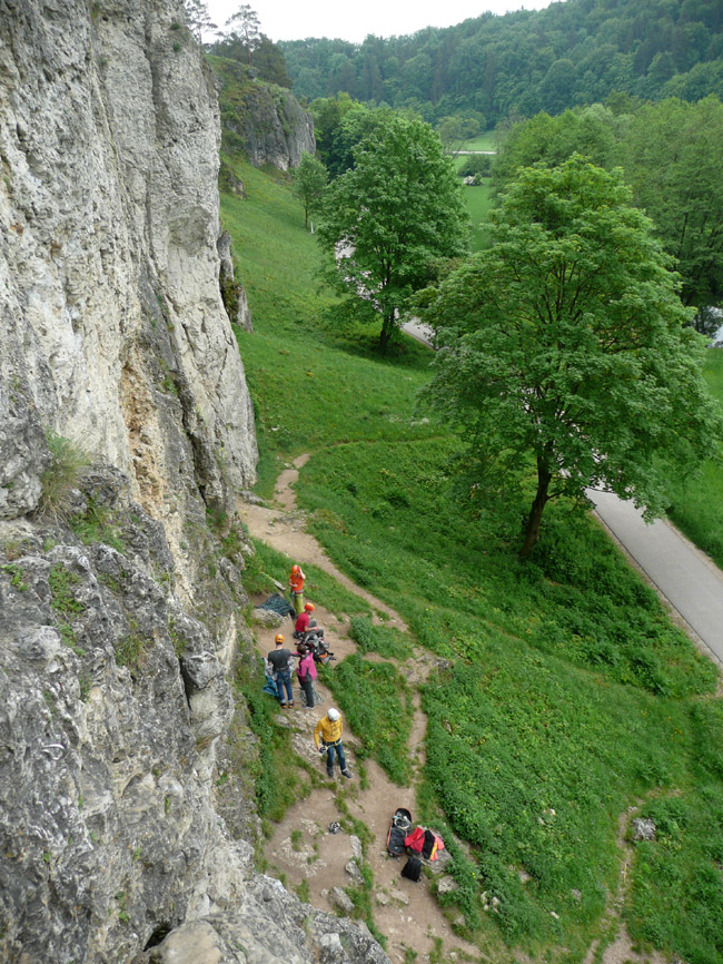 Tourenverhältnisse: Wenn's im Süden regnet, fahren wir halt mal in den Norden - dort war es den ganzen Pfingstsonntag über wunderbar trocken. Die Labertalwand (38 m hoch) bietet diverse eher einfachere Kletterreien (IV bis VI), alles ordentlich abgesichert (ein paar Friends, Rocks und Schlingen schaden abwer nicht). Darüber liegt die Schwarze Wand, die auch sehr schöne Routen (V bis VII) hat. Helm schadet nicht.