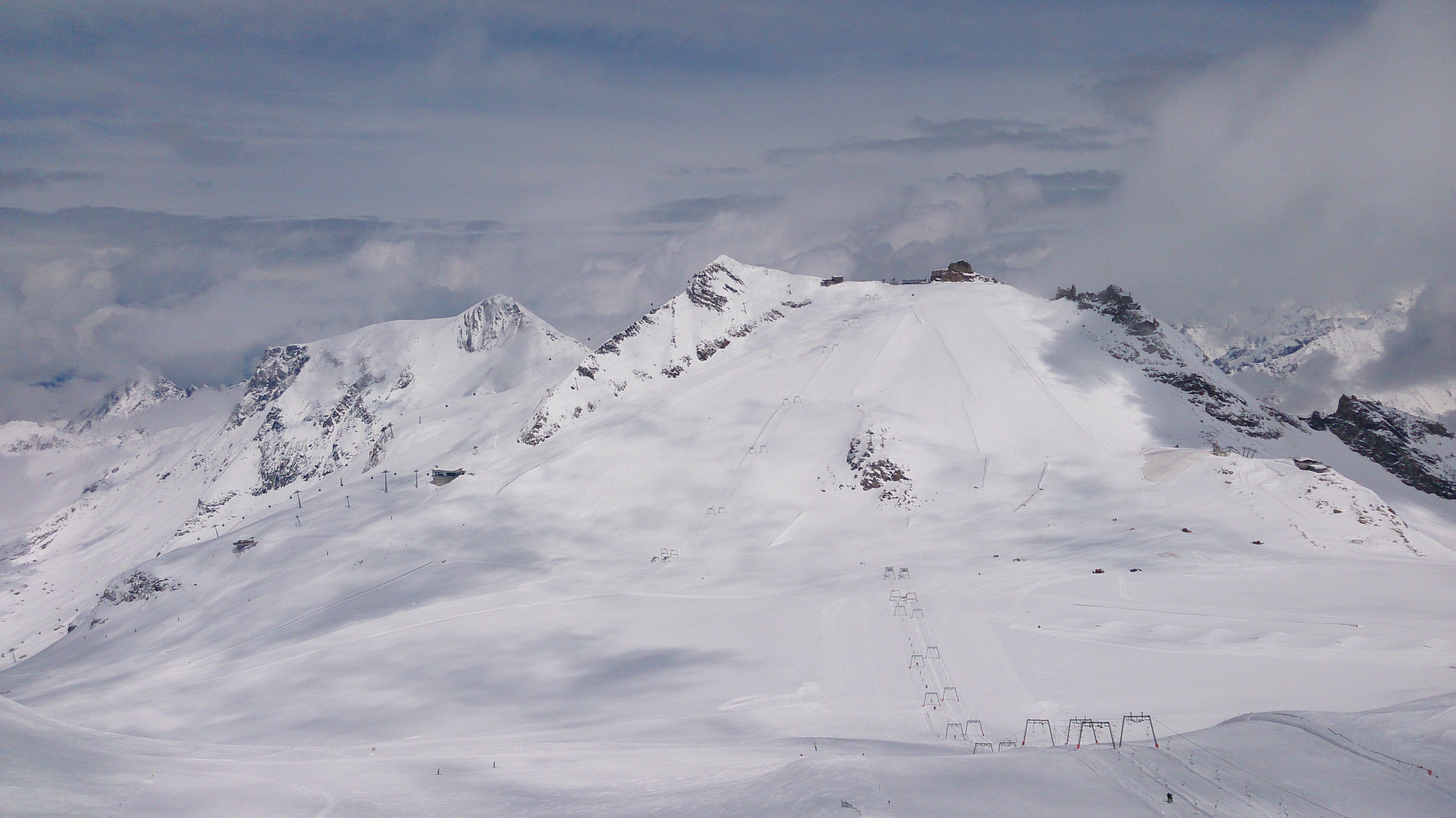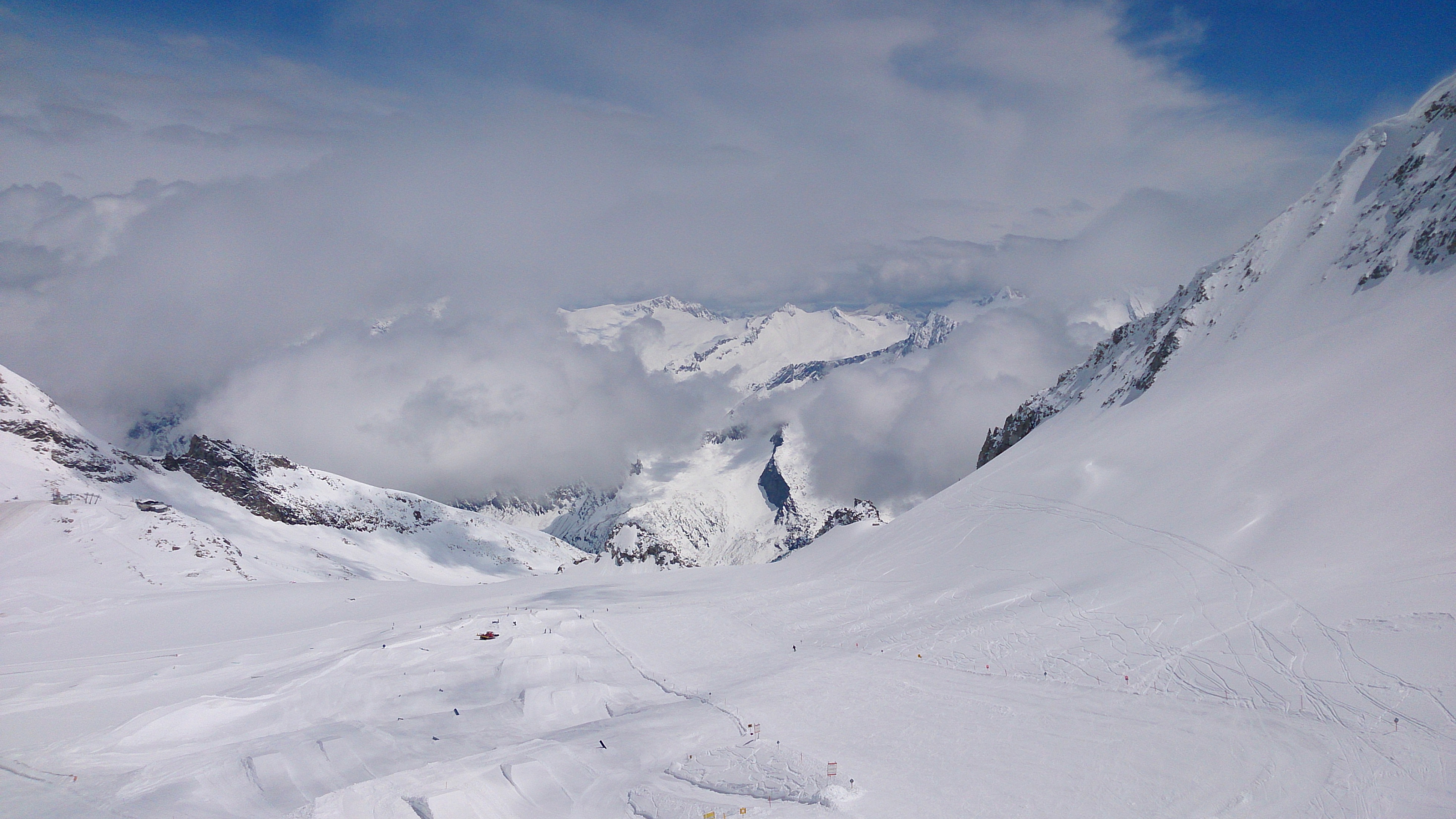 Sonstiges: Am Pfingstmontag gab es noch einmal eine Skitour, dieses Mal aus abfahrtstechnischen Gründen im Hintertuxer Gletscherskigebiet. Start bei der Talstation und zu Fuß herauf bis kurz vor die Sommerbergalm über den Wasserfallsteig. Ich bin diesen Weg noch nie zuvor gegangen und rückblickend war es bei den gestrigen Verhältnissen auch eher eine mühsame Idee: Fast von unten Weg feuchter Neuschnee, der schnell an Höhe zunahm. Es gab zwar schon ein paar Stapfen, trotzdem aber sehr mühsam. Oben in der Steilstufe auch nicht ohne, es sind schon Lawinen abgegangen. Sinnvoller ist im Frühsommer wohl die Auf- und Talfahrt zur Sommerbergalm. Gleich im Tälchen unterhalb der Sommerbergalm konnten auch die Skier angeschnallt werden und auf der geschlossenen, aber noch durchgehend schneebedeckten Piste ging es zügig hoch bis zum Tuxer Ferner-Haus. Leider war es dann zunächst neblig und auch leichter Schneefall setzte ein, dennoch eher warm. Skitechnisch vollkommen problemlos ging es über die Pisten und zuletzt 50 Hm im freien Gelände zum Falschen Kaserer, einem kleinen Buckel oberhalb der Wildlahnerscharte nur wenige Meter abseits des Olperer-Schlepplifts. Hier kam dann auch zweitweise die Sonne heraus und der Nebel lichtete sich, wie bestellt.