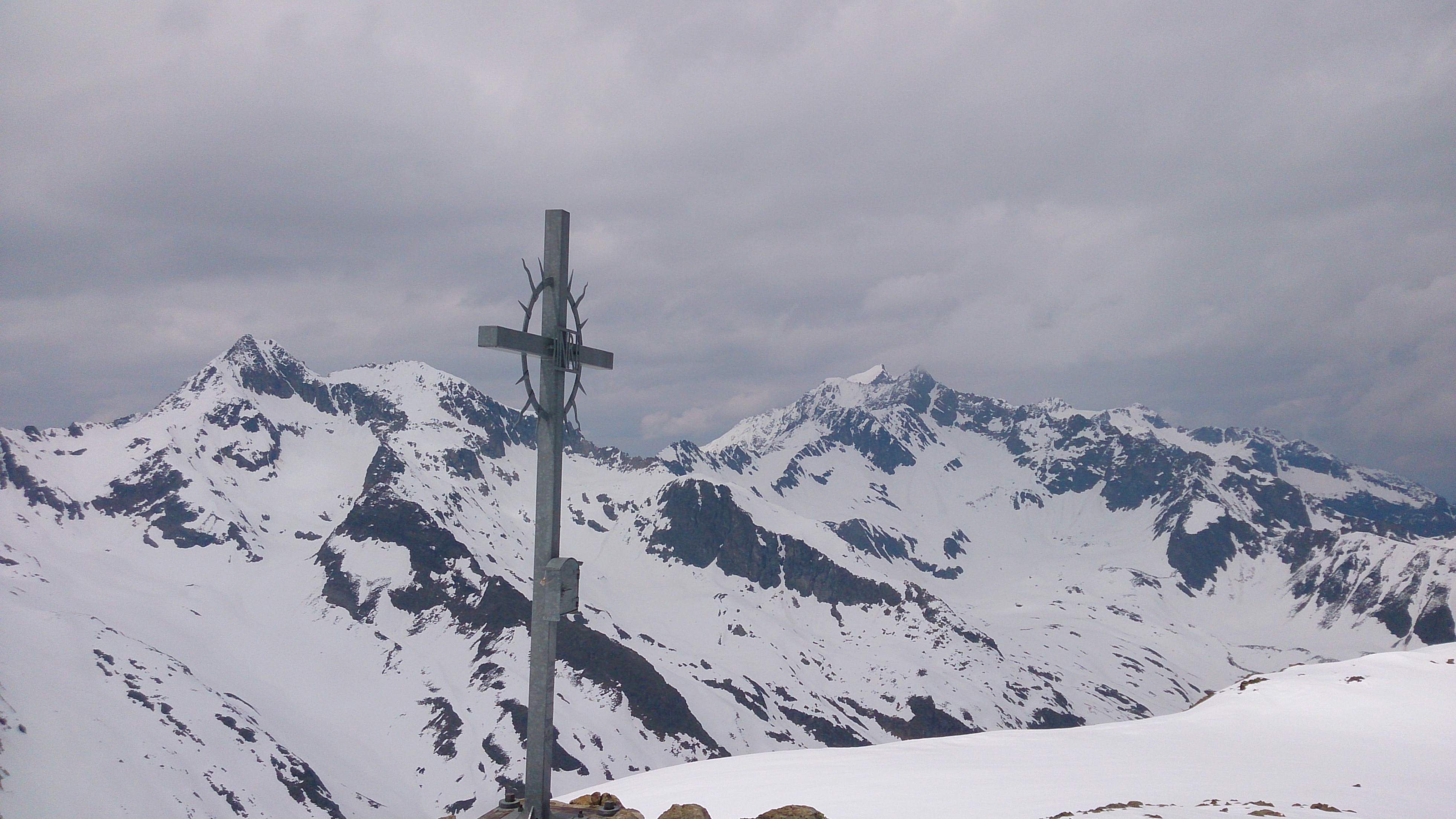 Sonstiges: Heute angesichts warmer Temperaturen, bedeckter Witterung und späten Starts nochmals eine Skitour in einem verwaisten Pistenskigebiet. Von Hochsölden ging es direkt mit den Skiern (20 Hm Ski tragen) los und abgesehen von dem bei Seite geschobenen Schnee bei der Bergstation Giggijoch ging es auch durchgehend mit den Brettln. Hinter der Bergstation Rotkogel 150 Hm Zwischenabfahrt - der Versuch, südseitig um die Kuppe herumzuqueren, empfiehlt sich nicht zur Nachahmung. Am besten aber wohl bei hinreichend lawinensicheren Verhältnissen direkt von der Bergstation Rotkogel hinauf ins Rotkogeljoch und einige Meter steile Querung nordseitig wieder zur Piste. Die letzten Meter zum aussichtsreichen Gipfelkreuz sind problemlos. Bei der Abfahrt hatte man natürlich wieder den Gegenanstieg zur Rotkogel-Bergstation. Darunter musste man dem geräumten Weg ausweichen, besser wohl rechts halten.