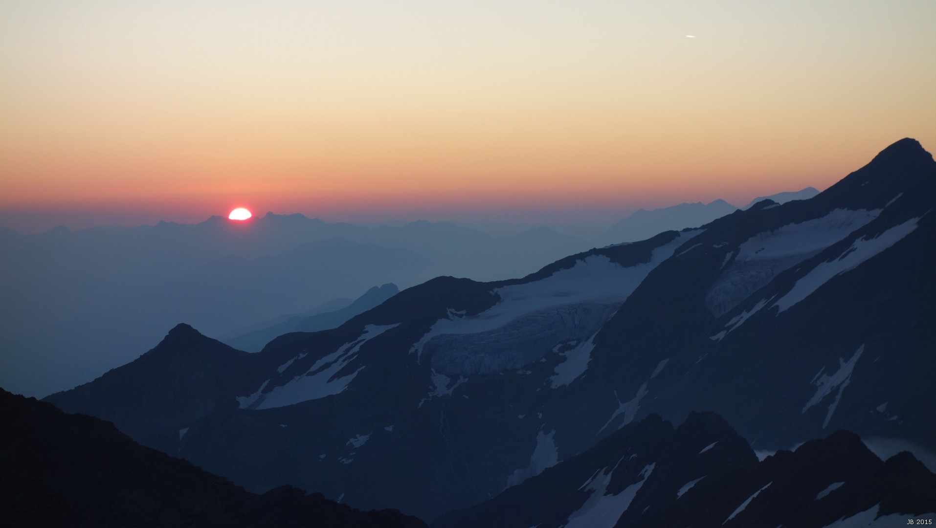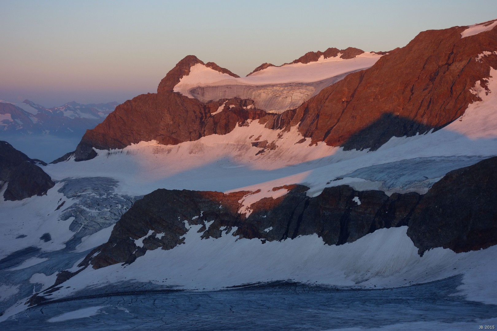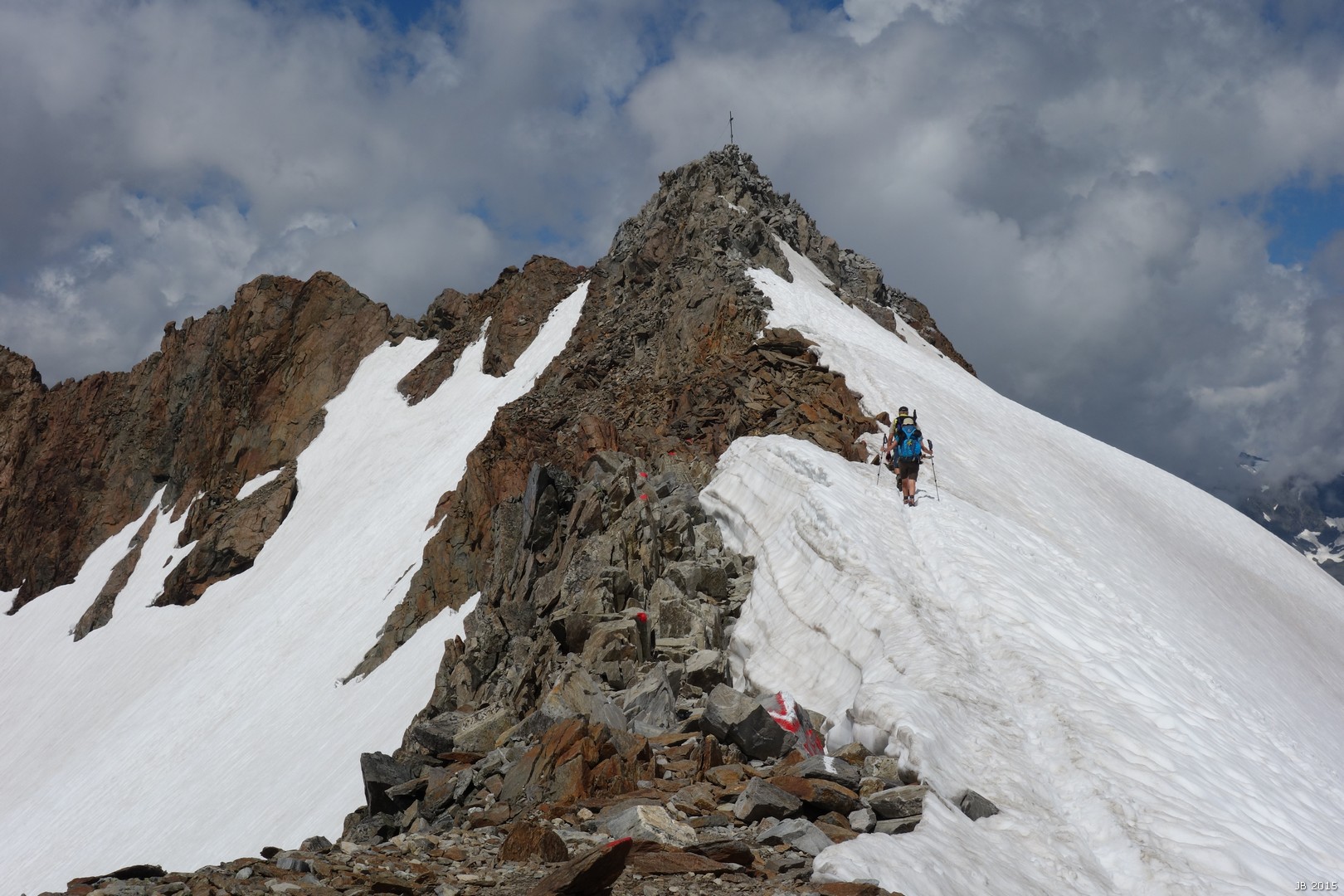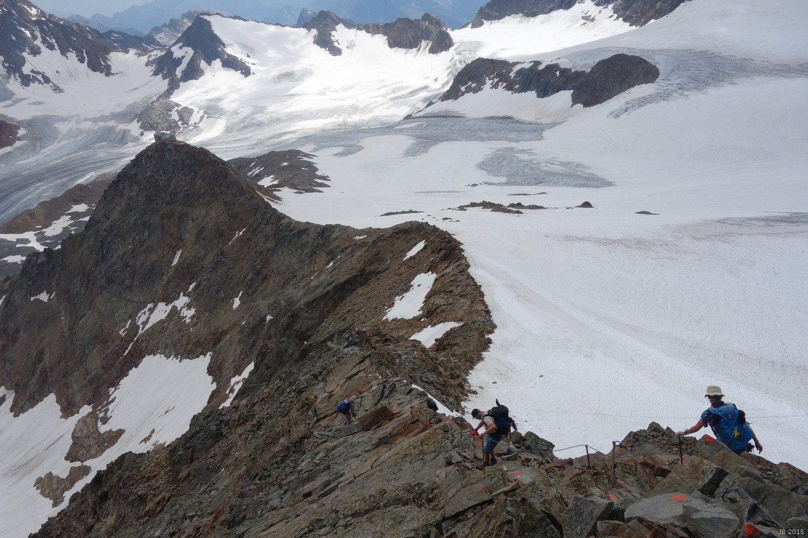 Abstieg zurück auf dem Grat zum Signalgipfel und über den gesicherten Felsgrat in Richtung Becherhaus. Teilweise kann man am Gletscherrand über weichen Firn die Felsen umgehen. Kurzer Zwischenanstieg mit guten Sicherungen zum Becherhaus 3200m.