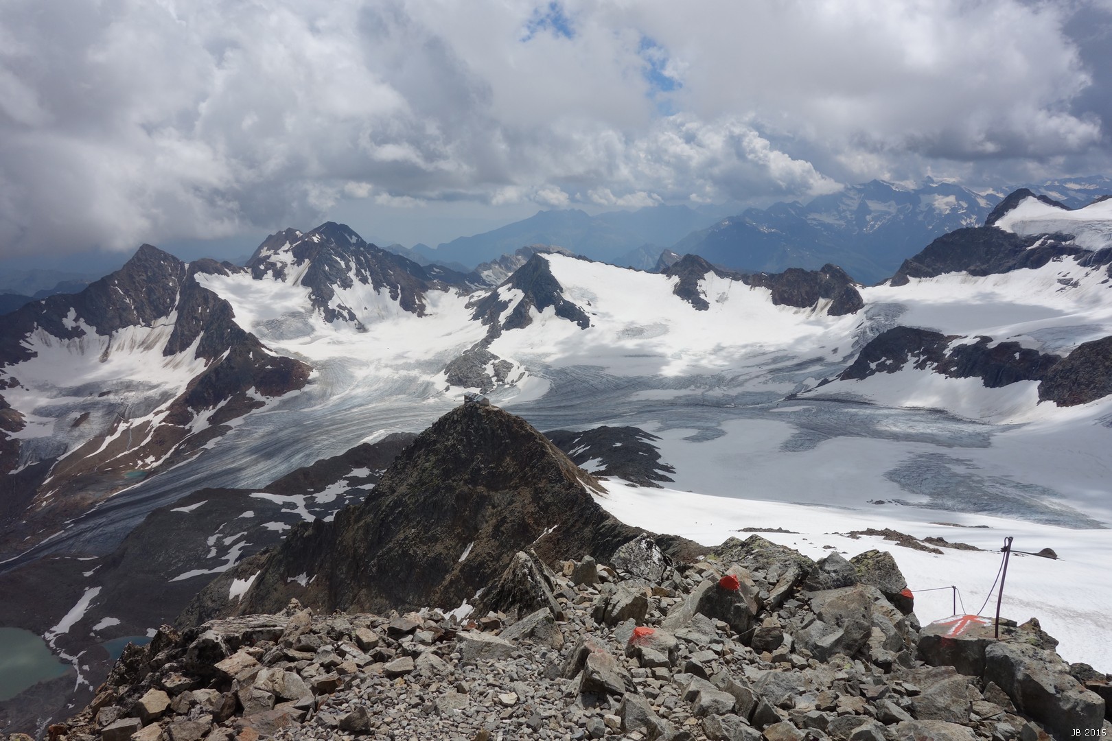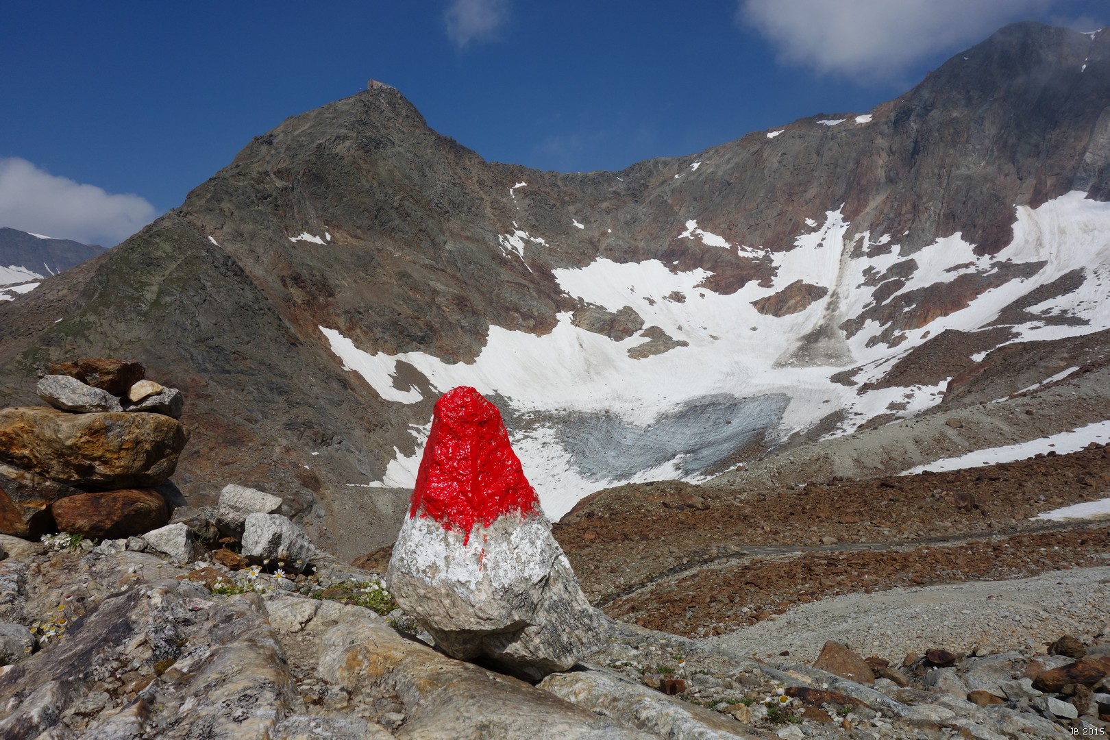 Hier kurzer Abstieg nach links über Blockwerk, um das Firnfeld an seinem unteren Ende problemlos zu überqueren. Nach der Querung leiten die Markierungen und Steinmänner über Blockwerk auf dem steiler werdenden Gratrücken aufwärts bis zum Rand der Reste des Grüblerferners. Immer am Rand der Felsen auf guter Spur im Firn in den weiten aperen Sattel unter dem Signalgipfel. Auf dem Grat über gut gespurte Firnreste in südwestlicher Richtung zu den Gipfelfelsen des Wilden Freiger.
