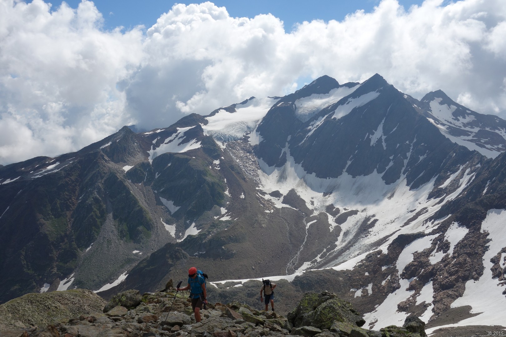Derzeit läßt sich der Wilde Freiger ohne Steigeisen problemlos von der Nürnberger Hütte zum Becher-Haus überschreiten, der Restgletscher unter dem Signalgipfel wird nur am Rand betreten.