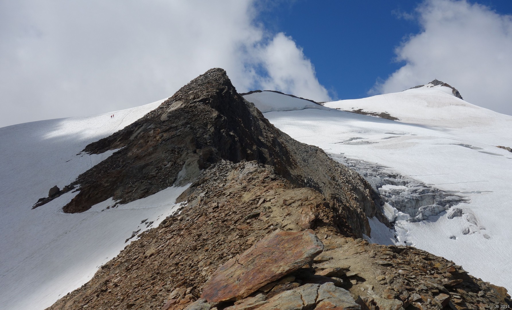 Abstieg zurück auf dem Grat zum Signalgipfel und über den gesicherten Felsgrat in Richtung Becherhaus. Teilweise kann man am Gletscherrand über weichen Firn die Felsen umgehen. Kurzer Zwischenanstieg mit guten Sicherungen zum Becherhaus 3200m.