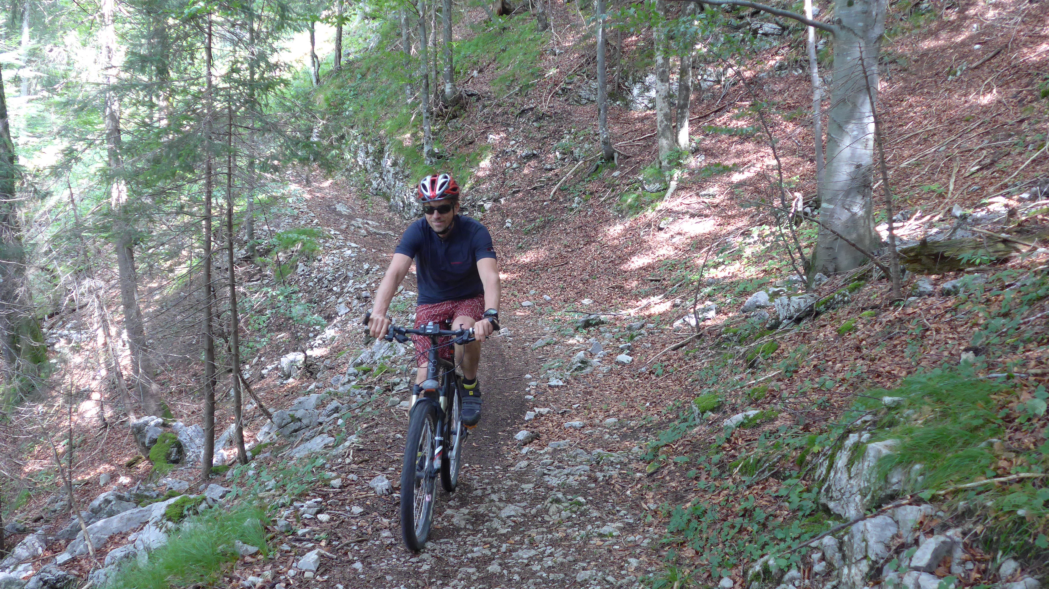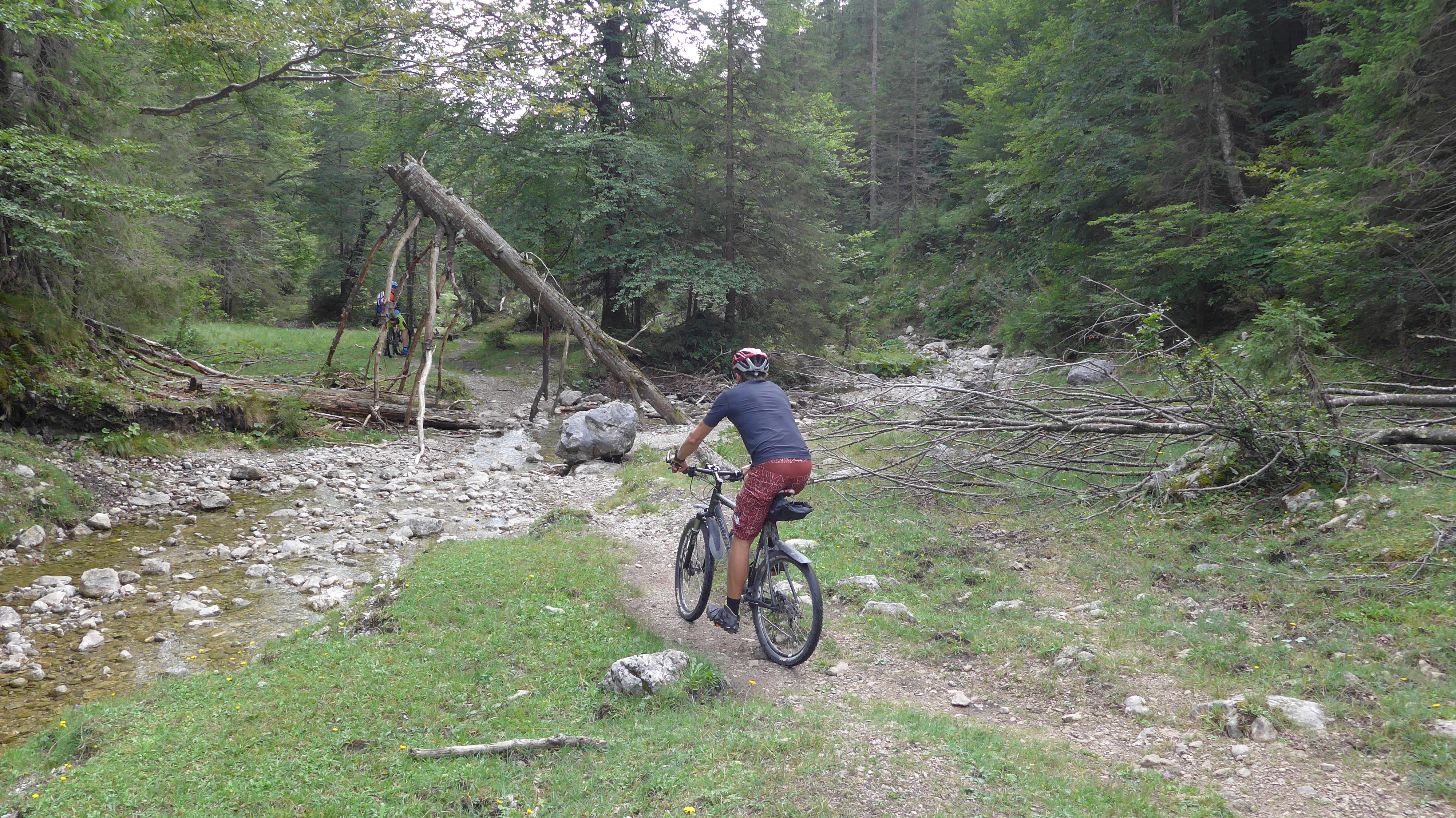 An dieser vorbei, am Kotbach entlang nach kurzer Zeit zweigt links abwärts ein etwas verblockter Trail ab. Überquert bald einen kleinen Bach (Bild). Es folgt ein längerer Trail meist S0 + S1, kurze Stellen S2. In der Ebene fährt man über die Brücke nach rechts, dann gleich wieder links bis nach Berg + Sachenbach.