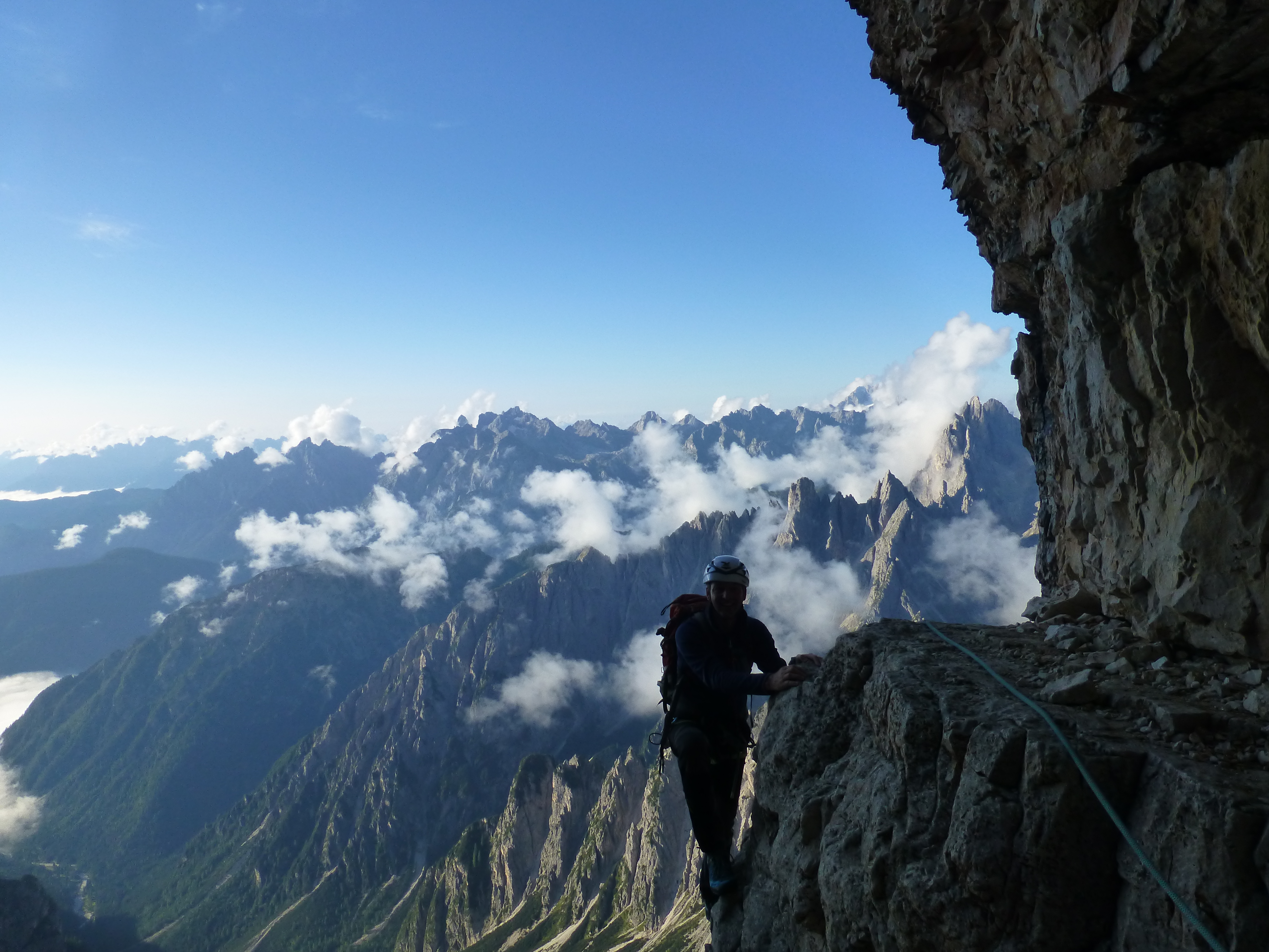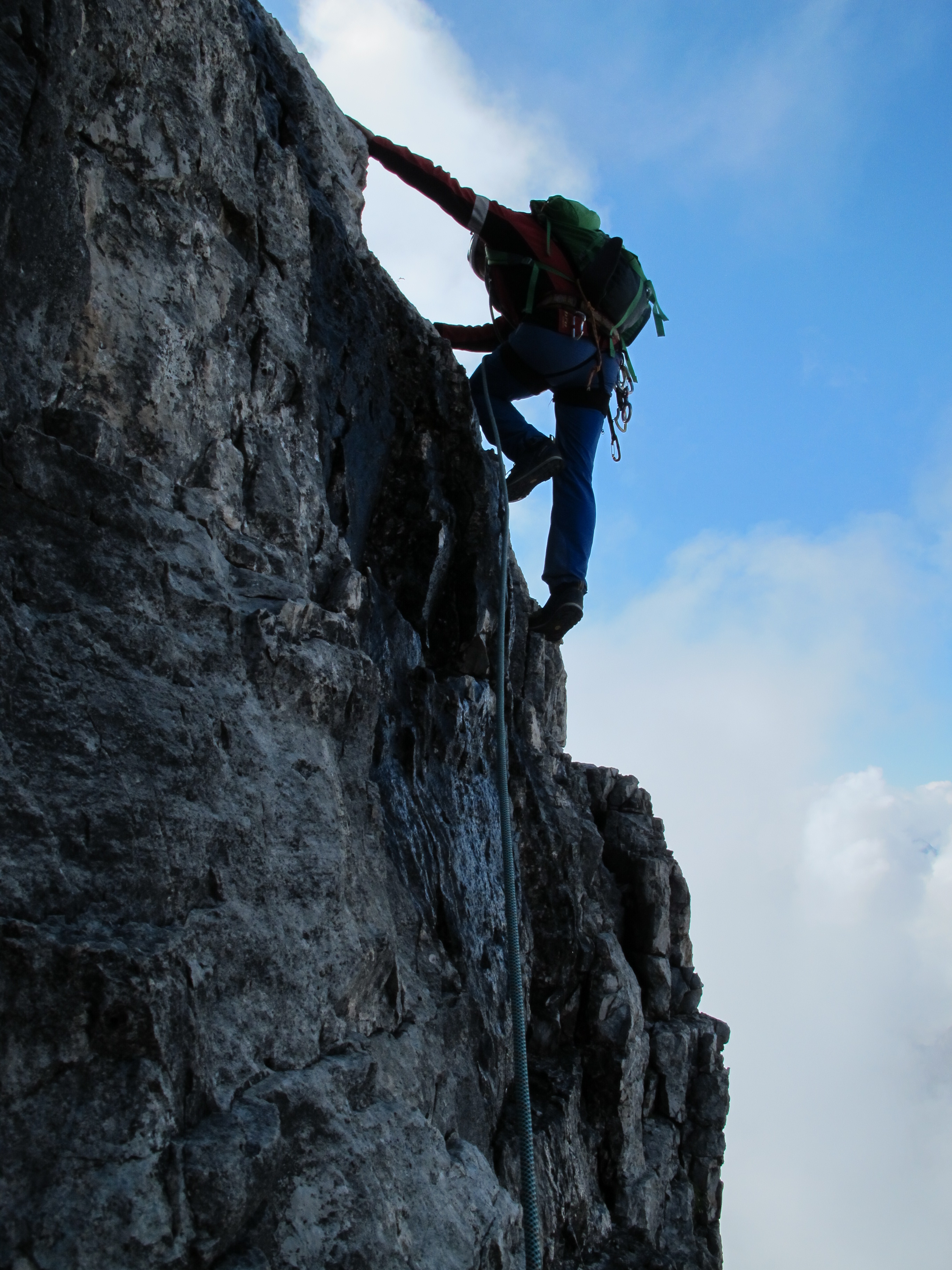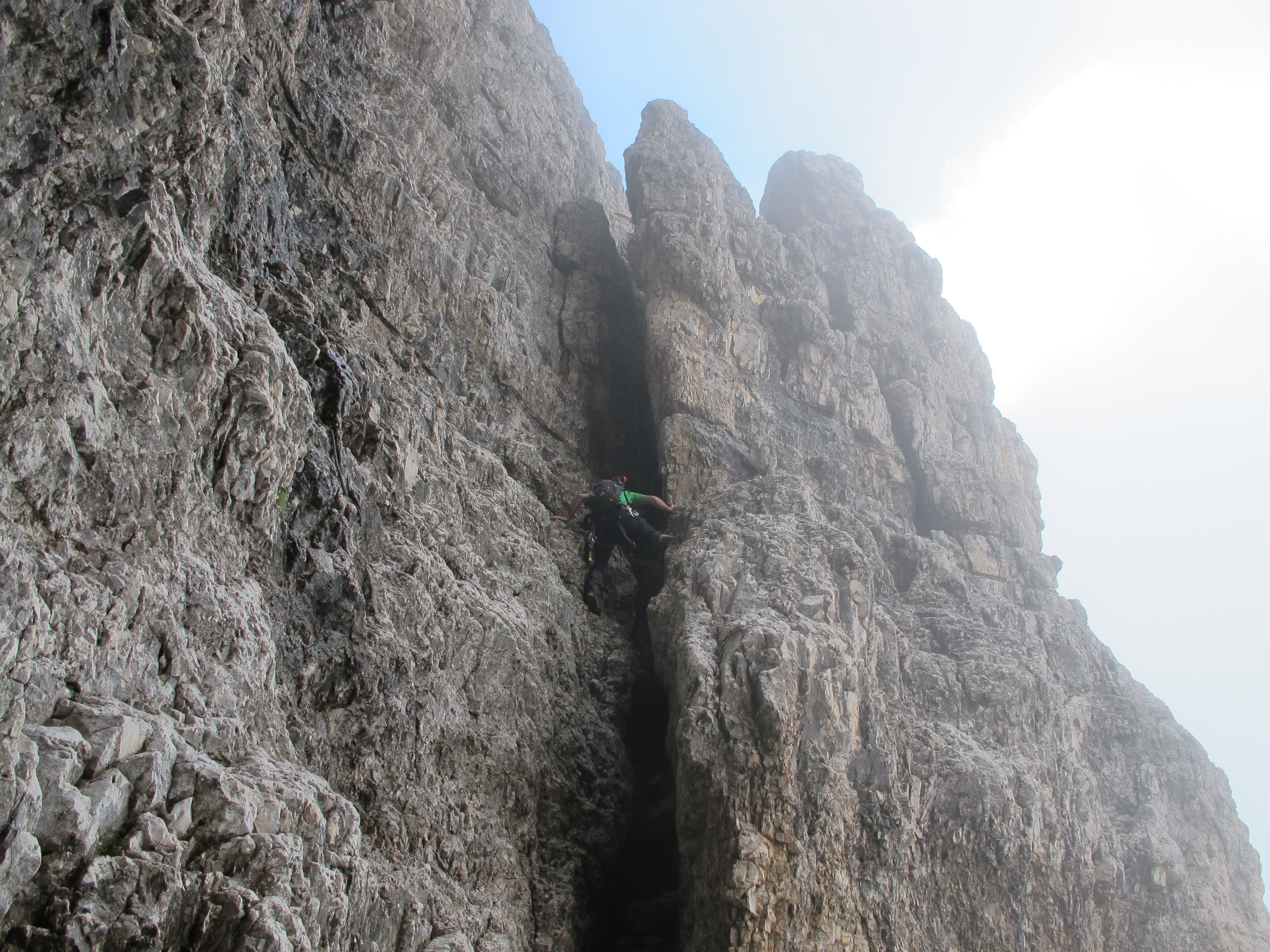 Tourenverhältnisse: Normalweg - Fast durchwegs sehr gut, nur einige Stellen vom nächstlichen Regen feucht, darunter jedoch auch die an sich schon glatte Schlüsselstelle (3+) durch den Kamin. Wetter in der Früh perfekt, am späten Vormittag bereits aufziehender Nebel und somit Eintrübung der höheren Gipfelregionen.