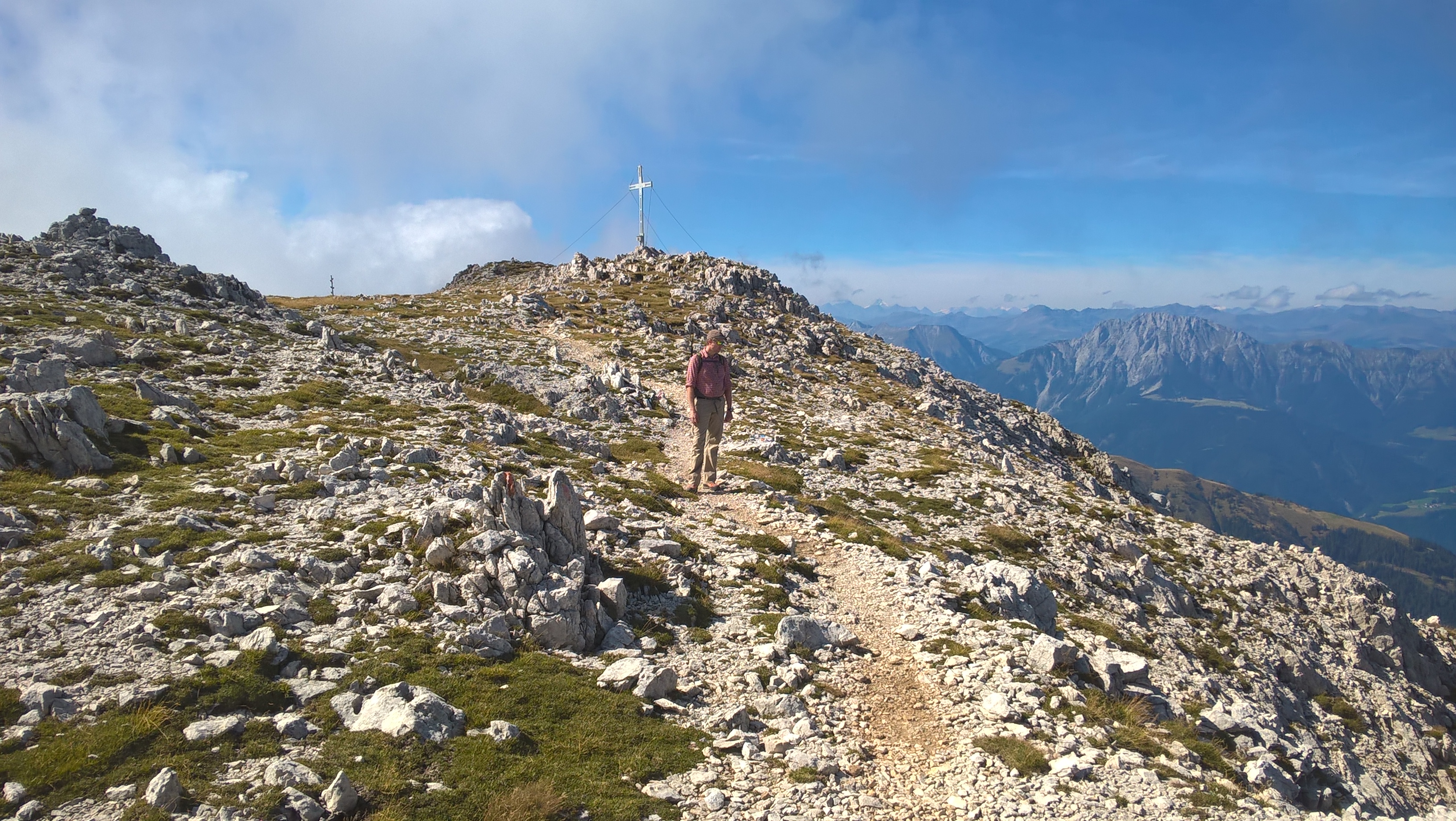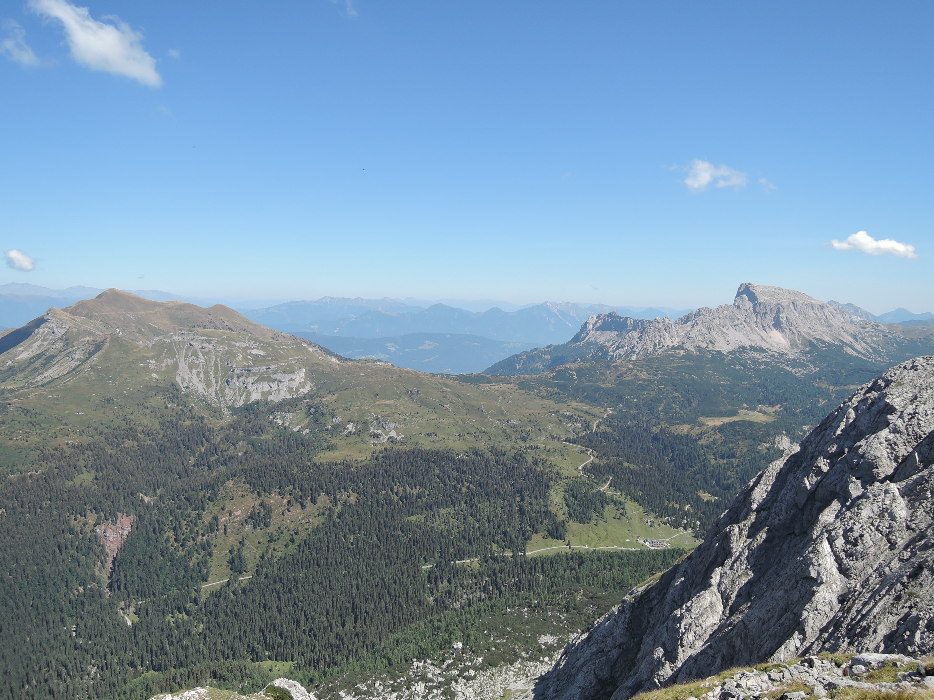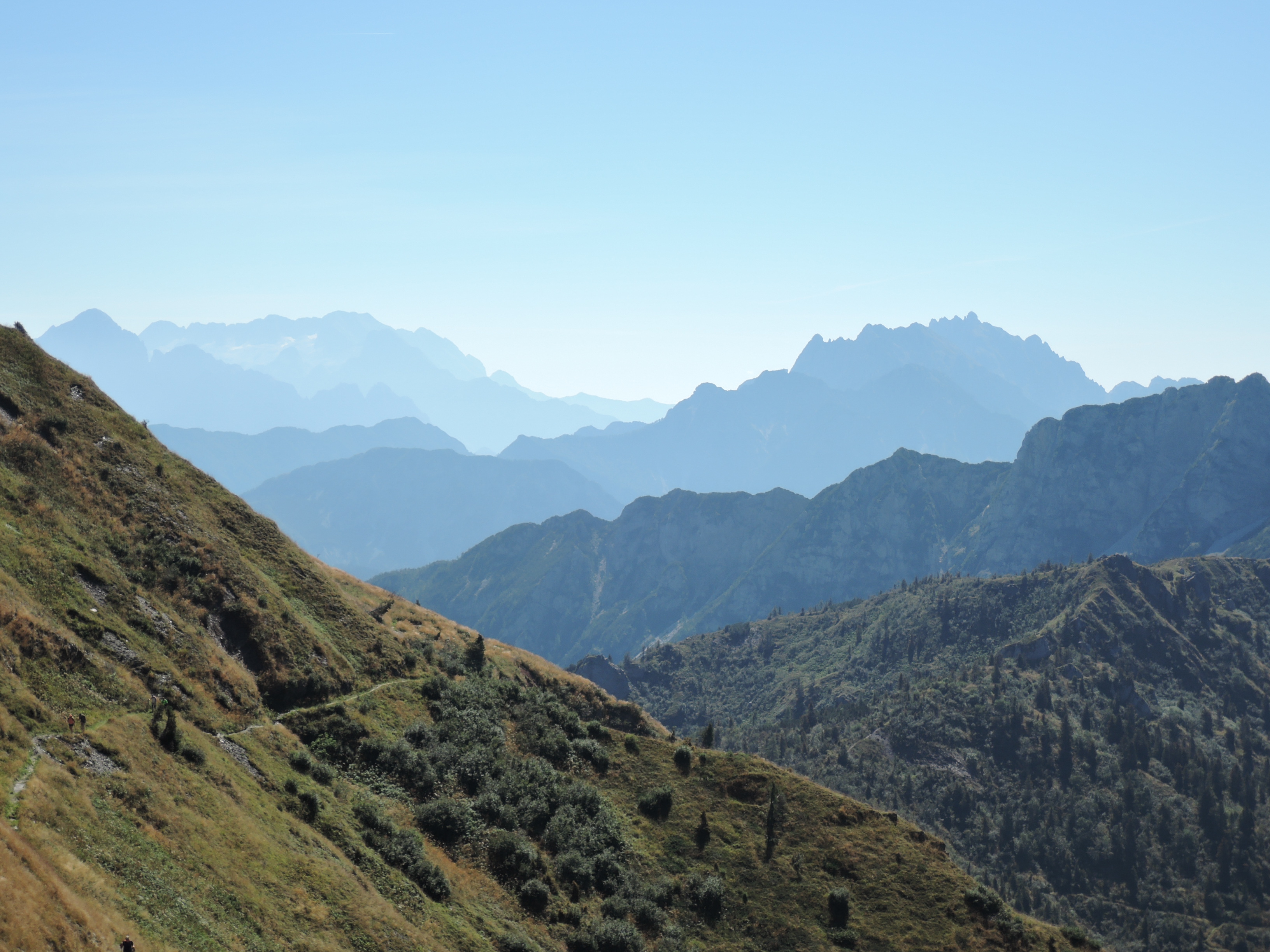3. Monte Zermula am Passo Cason di Lanza (Friaul): Der Zermula ist ein phantastischer Aussichtsberg der bei den Einheimischen sehr beliebt ist. Anfahrt über Pontebba im Kanaltal über Asphaltstraße. Viele gehen den Nordwand Klettersteig (B-C). Wir haben heute den Normalweg gewählt weil die letzten Tage anstrengend genug waren. Dieser führt östlich hinauf auf den Sattel, bevor es südlich entlang des Massivs (vorsicht steile Grashänge) hinüber zum Gipfel geht. Alternativ kann man entlang der verfallenen Stellungen der Berg auch überschreiten. Der Pfad ist einfach zu finden, er verläuft ab dem Sattel etwas nördlicher. Heute war der Gipfelblick einfach phantastisch. Die klare und trockene Luft ergab eine enorm gute Fernsicht. Montasio und Julische Alpen im Osten, die Tauern und der Glockner im Norden. Gletschergebiete um den Venediger und die Dolomiten. Paularo und Tolmezzo im Süden.