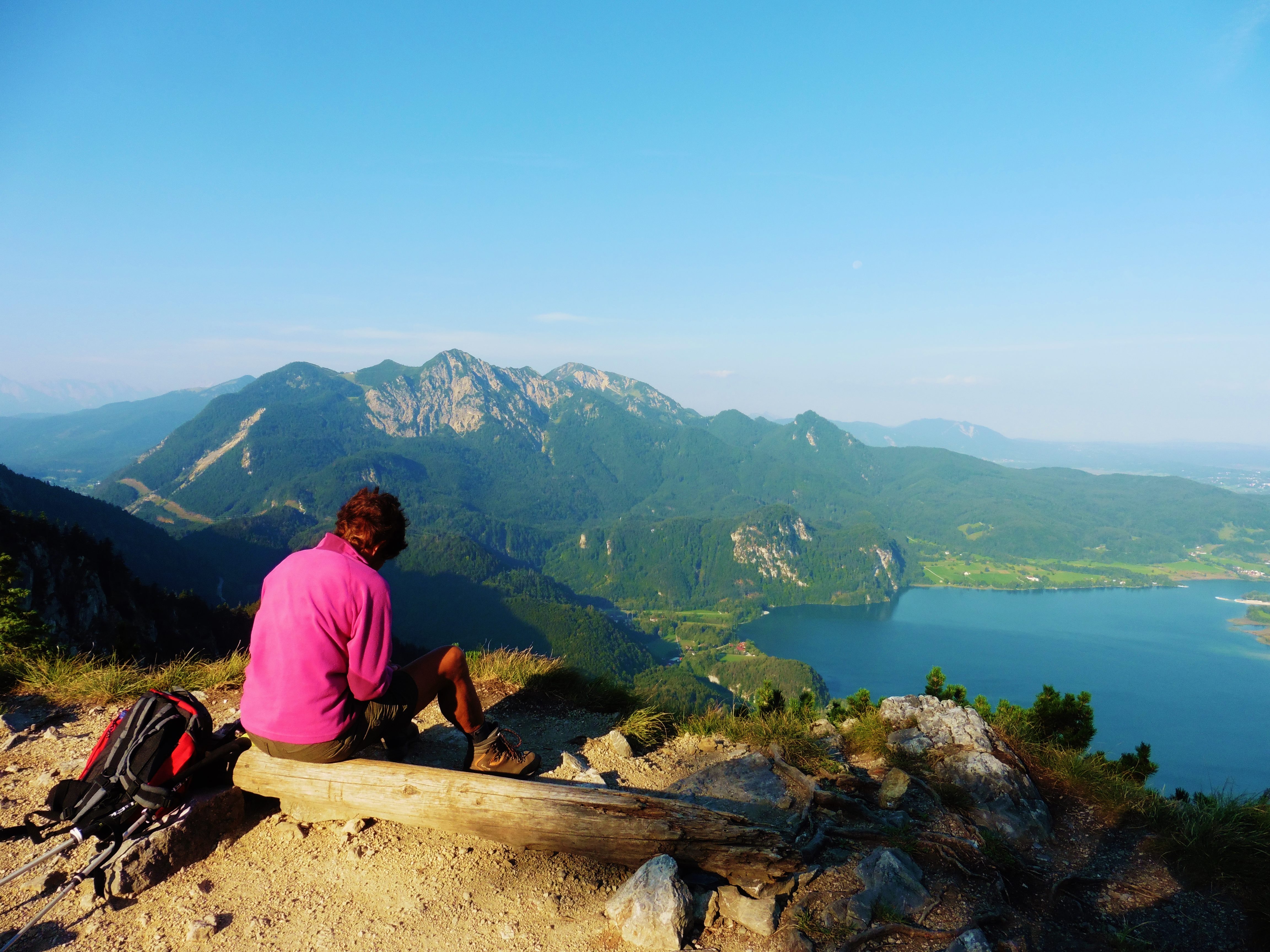 Sonstiges: am Parkplatz der Fa. Dorst beginnt eine Forststraße; auf dieser ca. 10 Minuten bergauf; unmittelbar nach 2 Gedenkkreuzen am rechten Straßenrand auf unmarkiertem Steig bis dieser in einen Karrenweg mündet; dort links auf steilem Pfad immer gerade aufwärts, an der S-Wand des Kiensteins entlang (viele eingebohrte Routen in exzellentem Fels) bis in einen Sattel; von dort weiter (kurze versicherte Stelle) durch ein Gittertor zu Jagdhütte (tolles Brotzeitbankerl) und zum nahen Gipfel; wieder zurück in den Sattel und auf deutlichem Steig steil durch die Westflanke auf den Nordrücken des Sonnenspitz; dort mündet der Steig in den mark. Normalweg, der weiter unten auf der Forststraße beginnt; auf diesem zum Gipfel (schöner Aussichtspunkt); vom Sonnenspitz auf dem Weg zum Graseck und auf dem mark. Weg hinunter zur Forststraße, die zum Parkplatz hinabführt; unmittelbar am Parkplatz befindet sich eine Liegewiese direkt am See; kurz nach 11 h erfrischten wir uns bereits in dem klaren und angenehm temperiertem Wasser des Sees.
