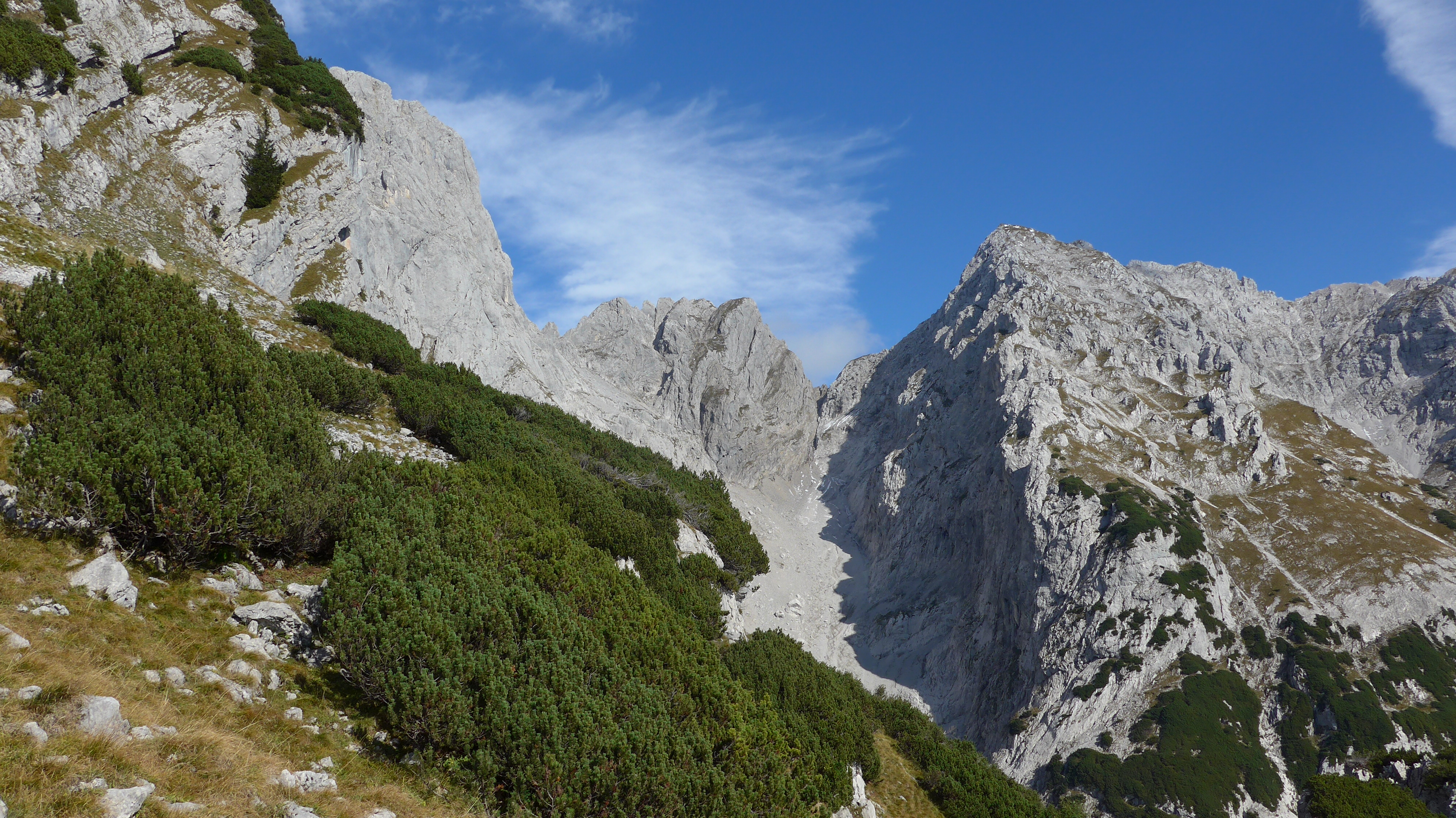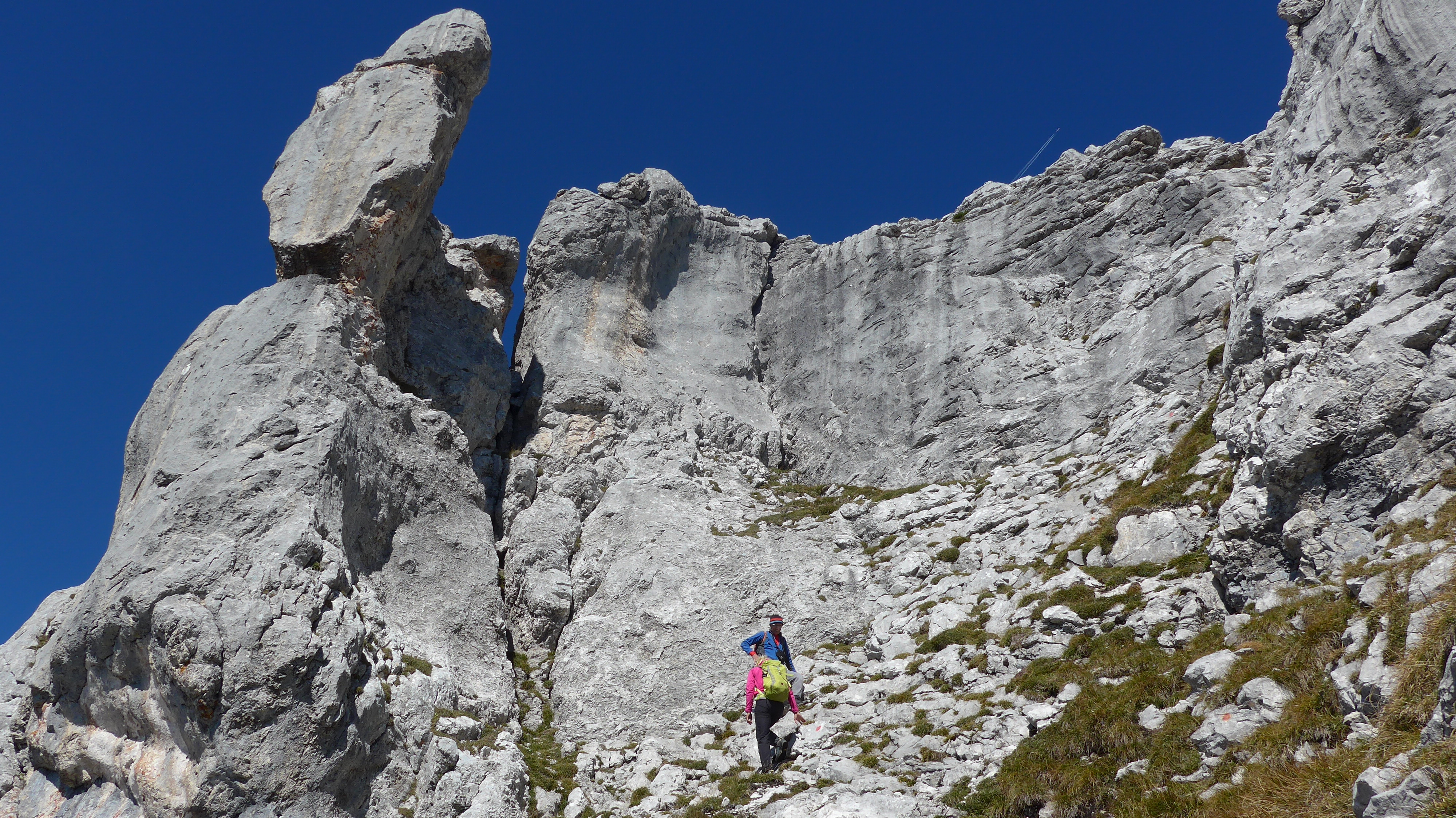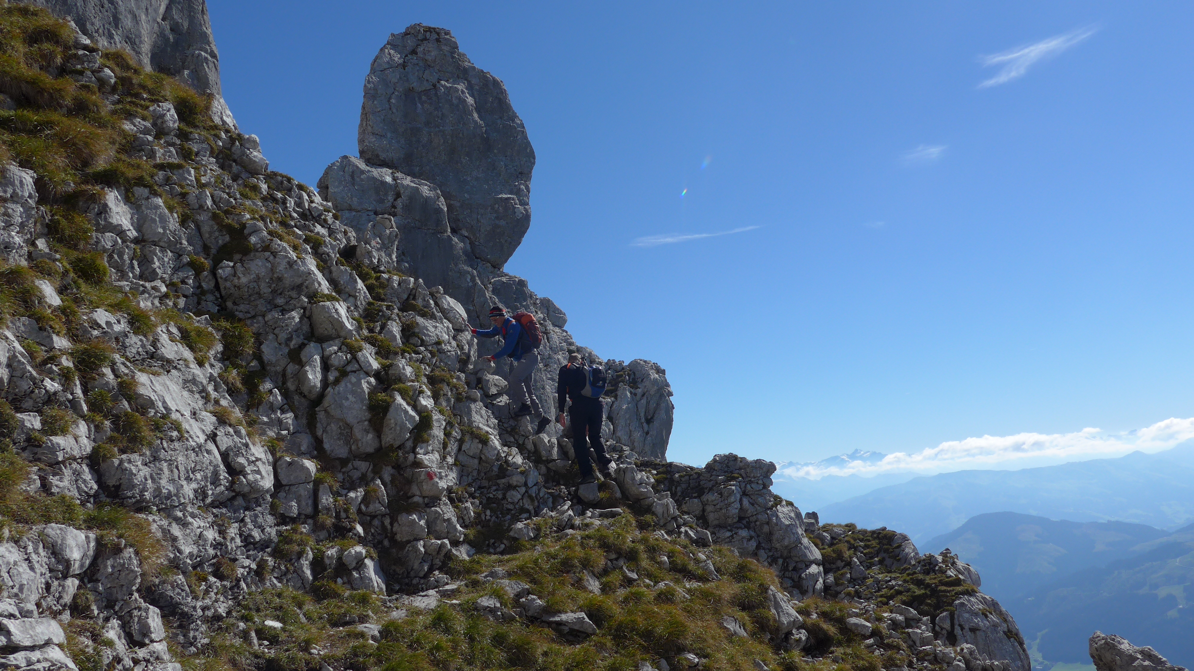 Vom PP auf beschildertem Weg zum Scheffauer (I) gegangen. Wieder ein kurzes Stück zurück nach Osten bis zur Einmündung Widauer Steig. Hier beginnt die Überschreitung der Hackenköpfe (II kurze Stellen, viele I Stellen, überwiegend Gehgelände). Steinmandl´n + einige rote Markierungen machen die Orientierung bei Sicht einfach.